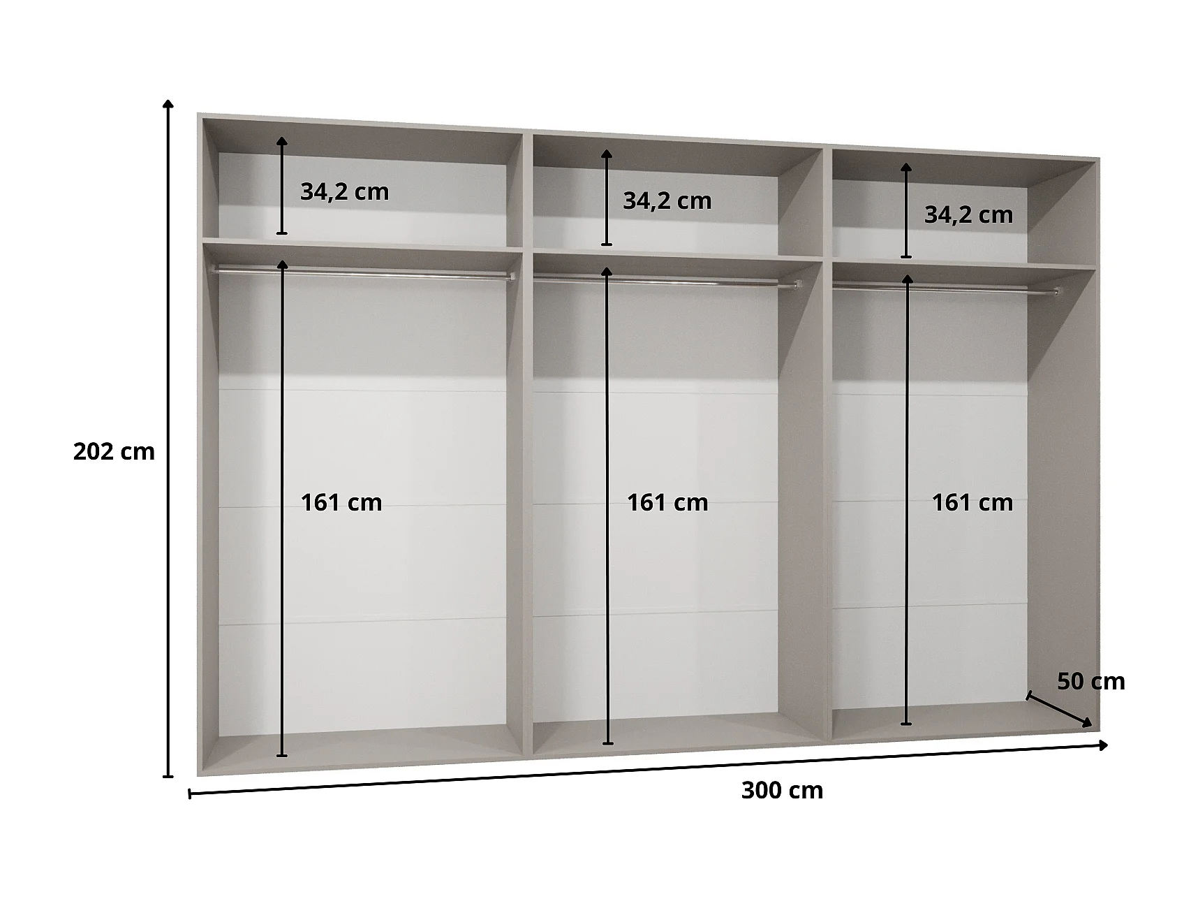 Drehtürenschrank Sandi 3 300 (100x3) / 202 / 52 (Weiß + Griffe: Gold)