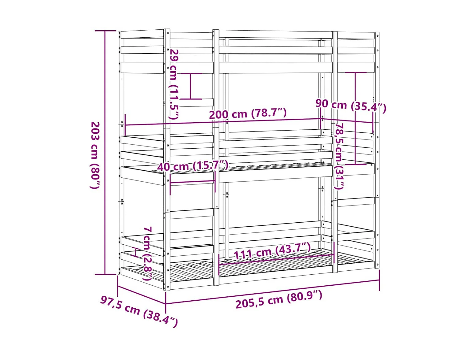 Dreifach-Etagenbett 90x200 cm Massivholz Kiefer