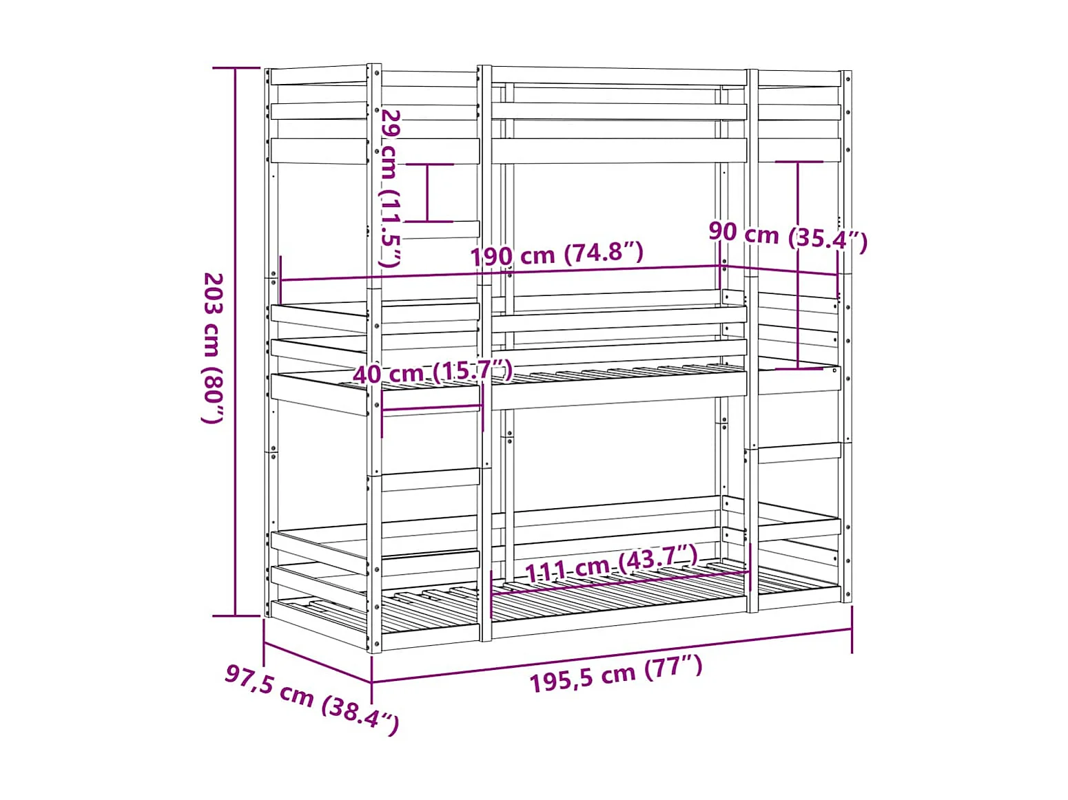 Dreifach-Etagenbett 90x190 cm Massivholz Kiefer