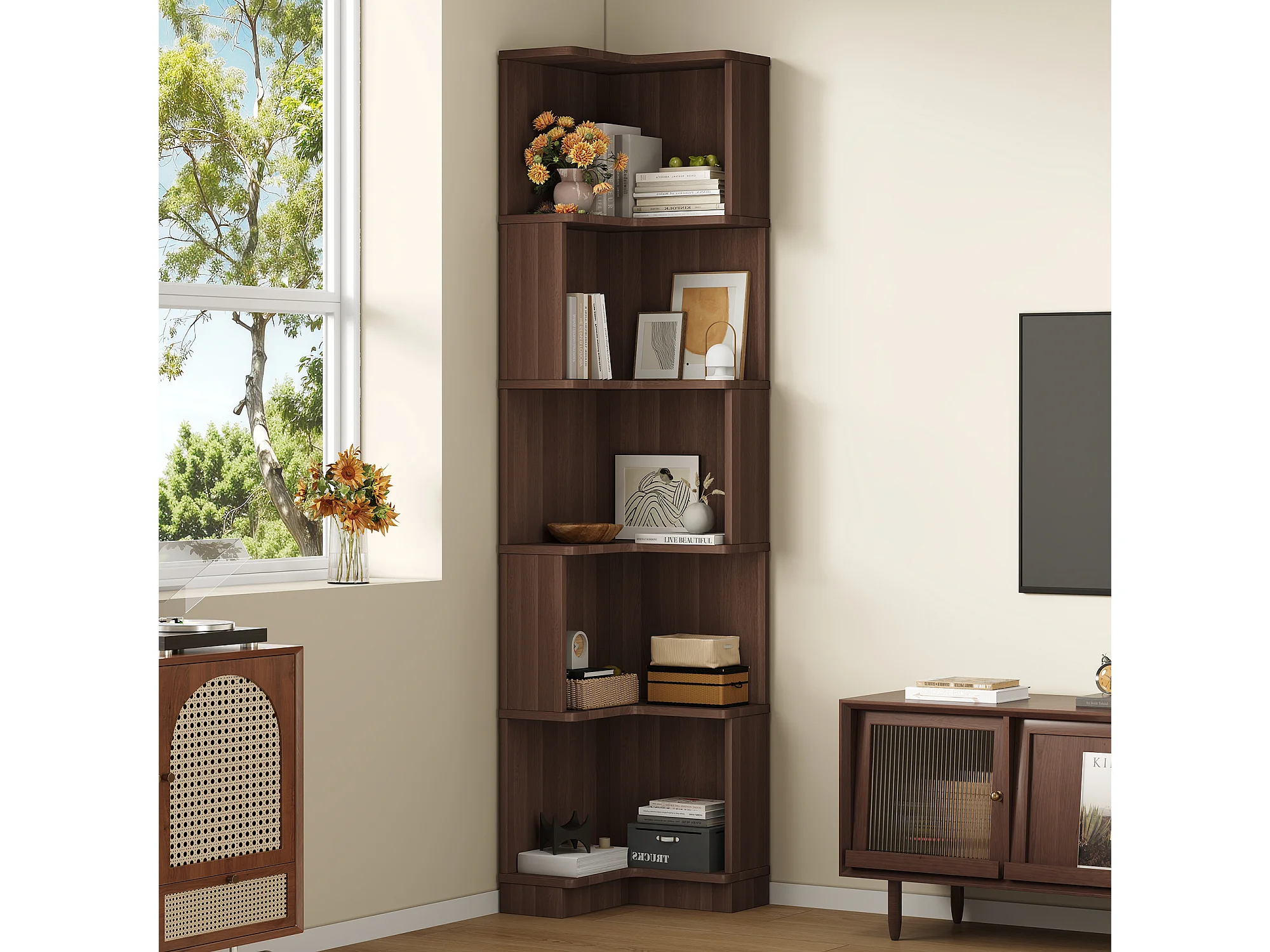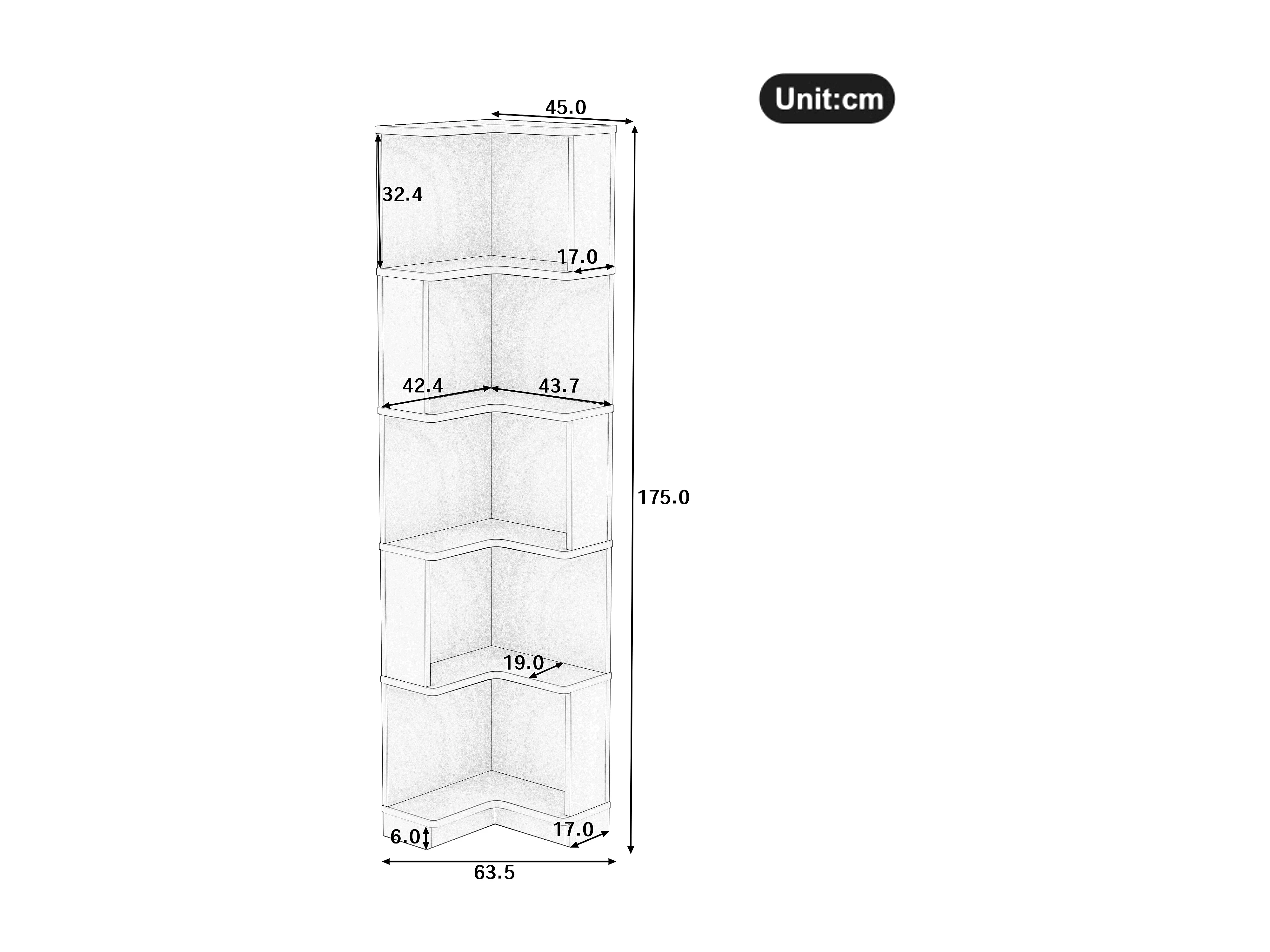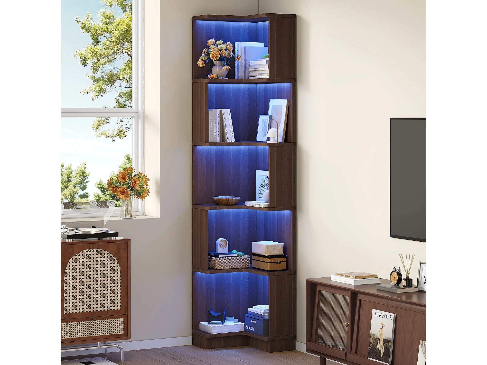 Eckregal 63,5x45x175 cm - L-Form - LED-Beleuchtung - 5 Ebenen Stauraum - MDF - Braun