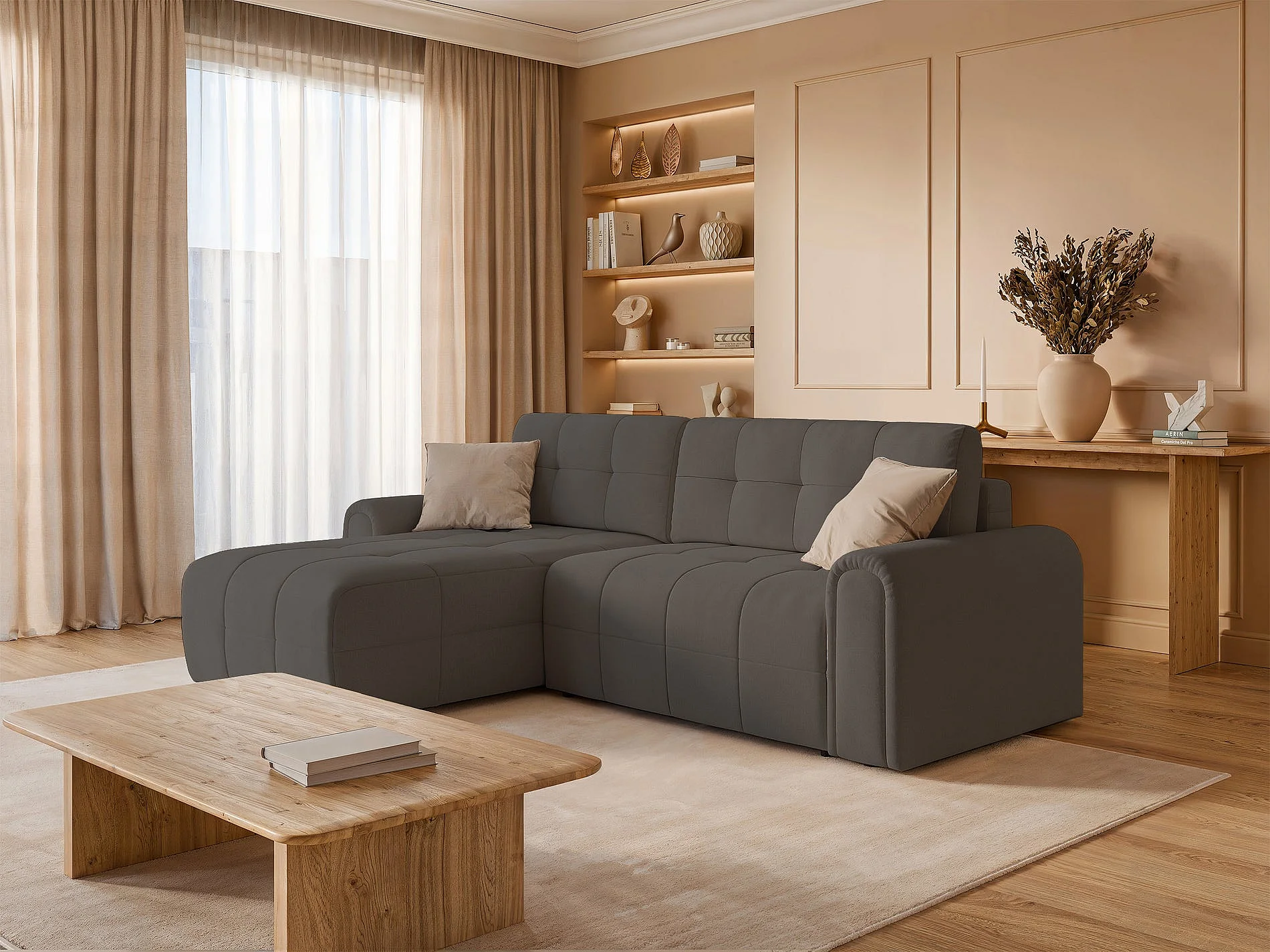 Ecksofa mit Schlaffunktion und Stauraum – links – Chenille – Taupe – SIMOLLA