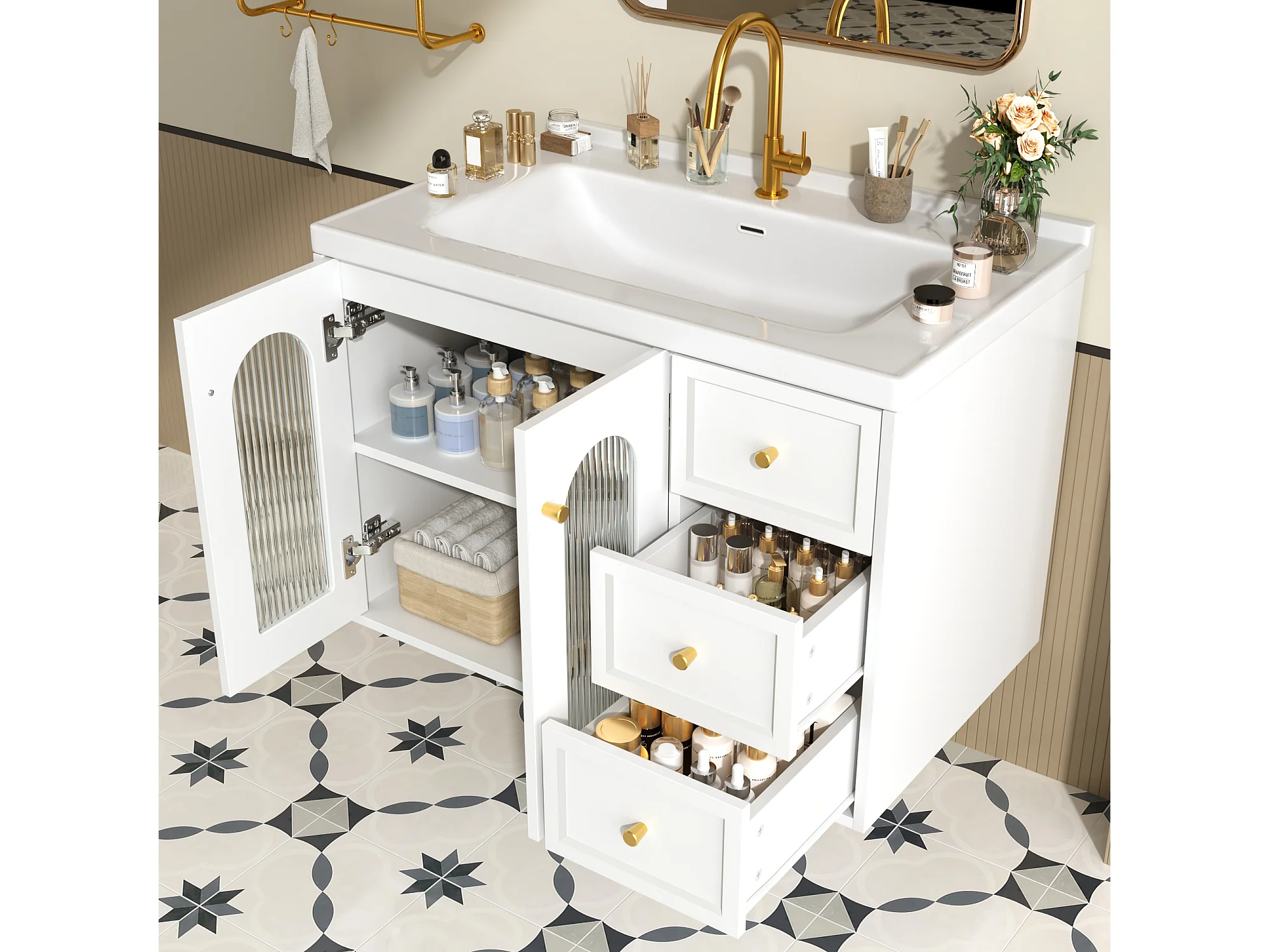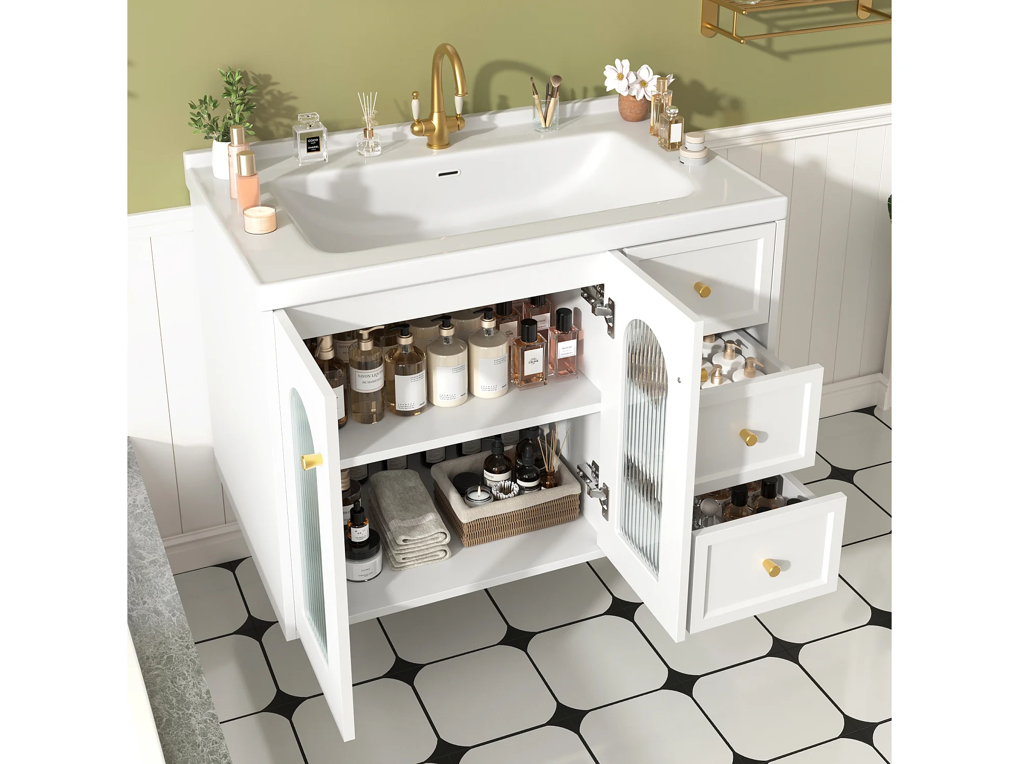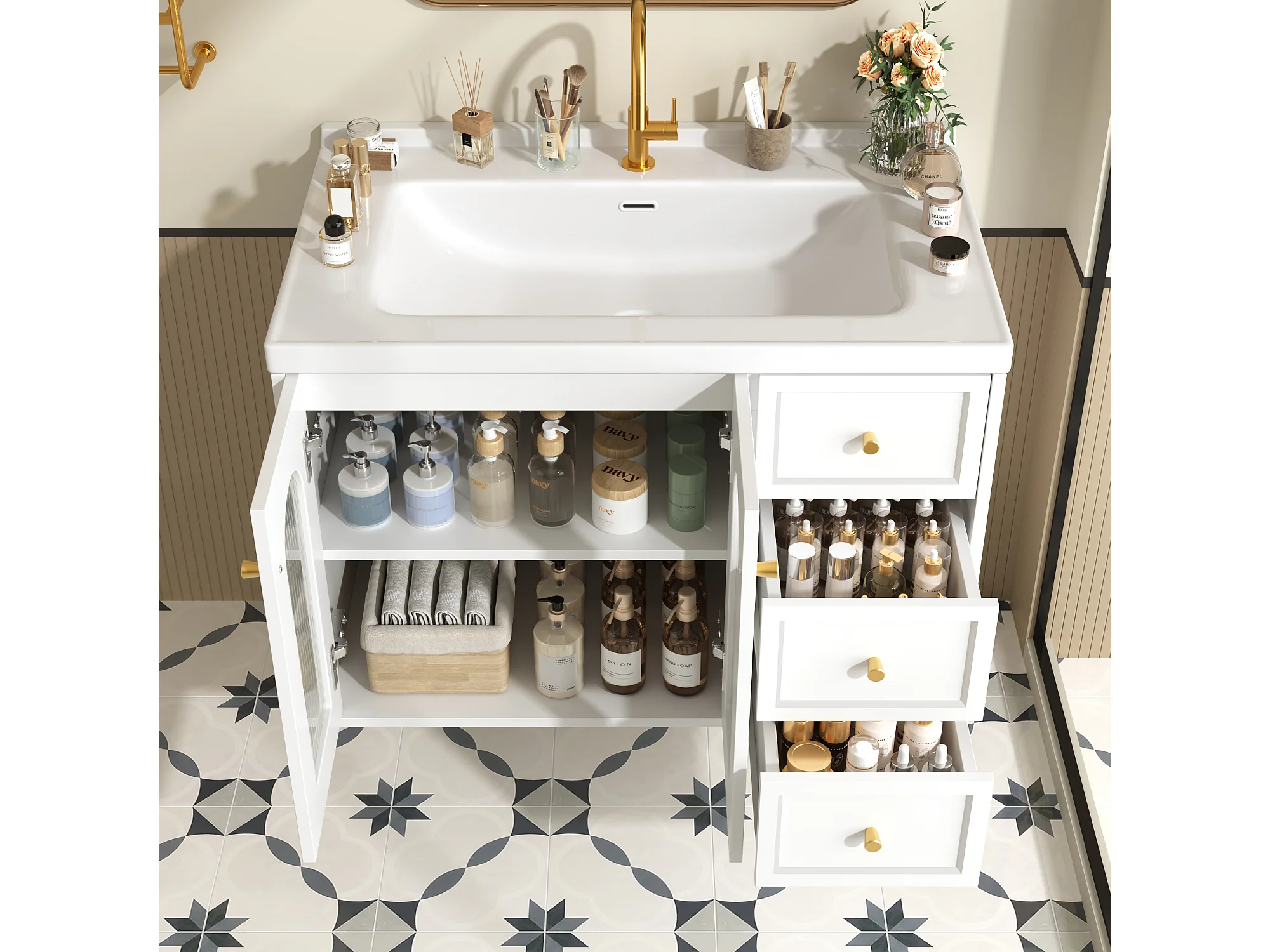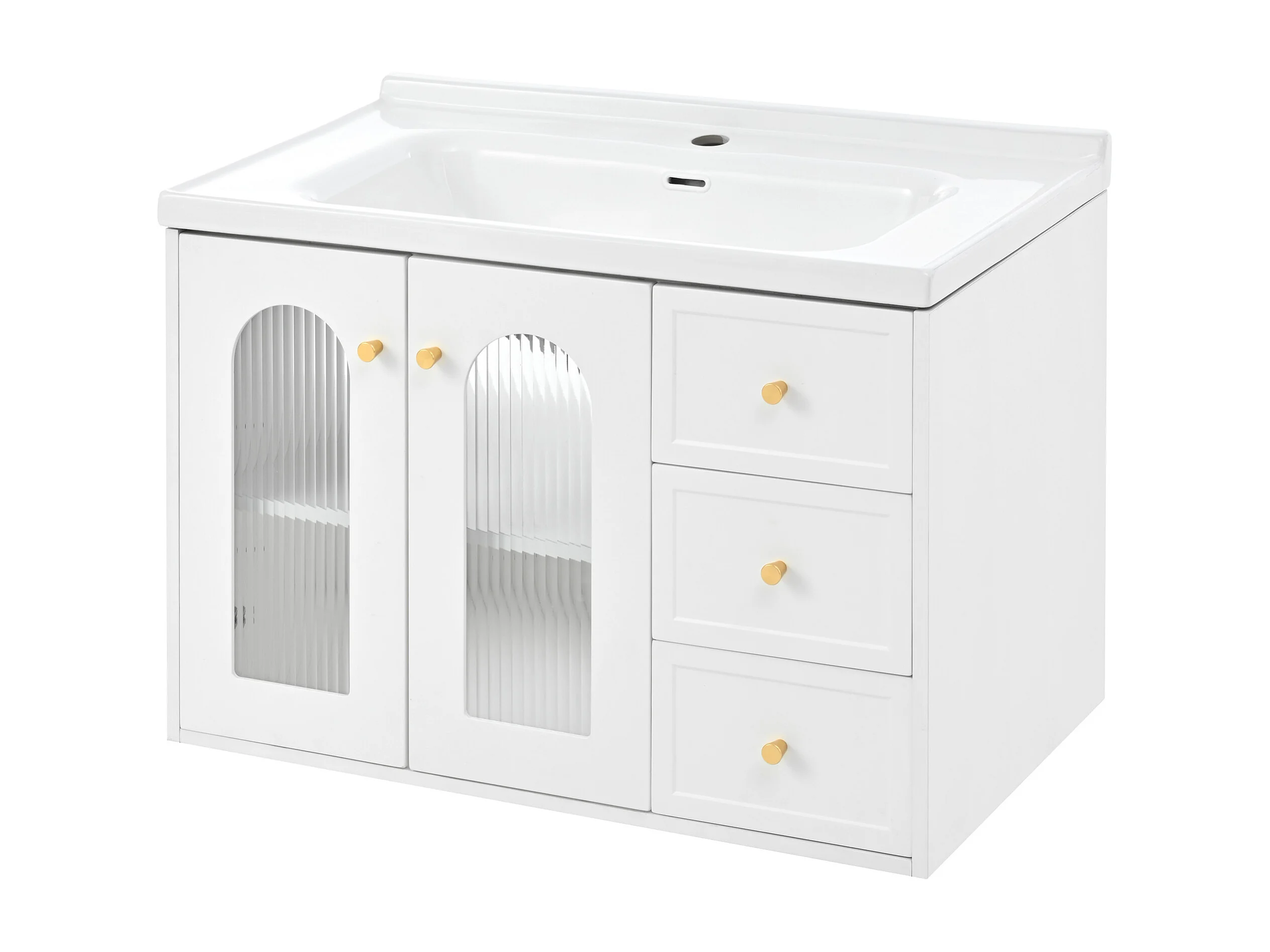 Einzelwandiger Waschtischunterschrank mit Keramikwaschbecken – 80 x 50 x 58 cm – mit Glastürschrank und 2 Schubladen – MDF – weiß