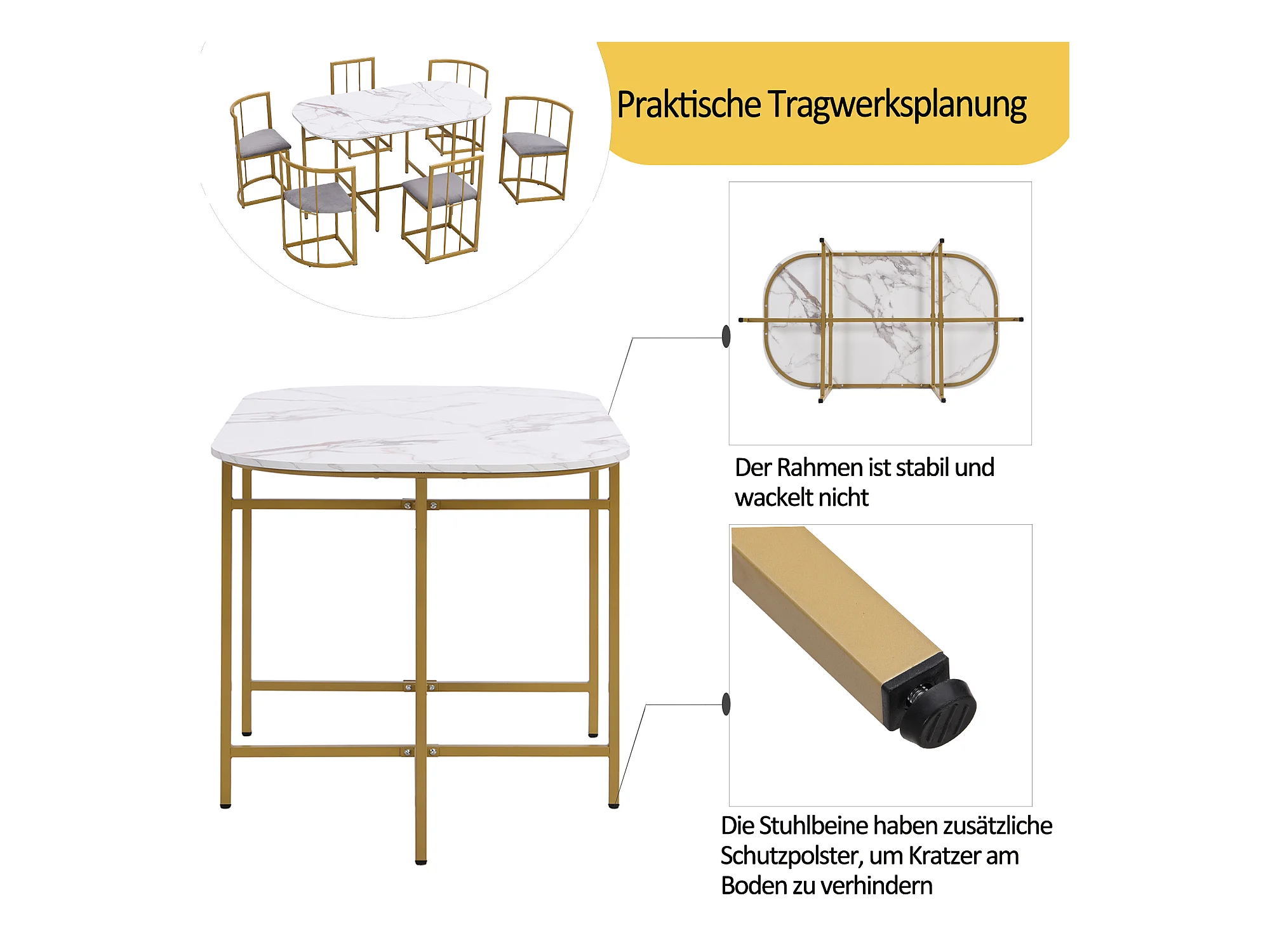 Esstischset mit sechs Stühlen: weißer Tisch, Stühle mit Rückenlehnen und Kissen