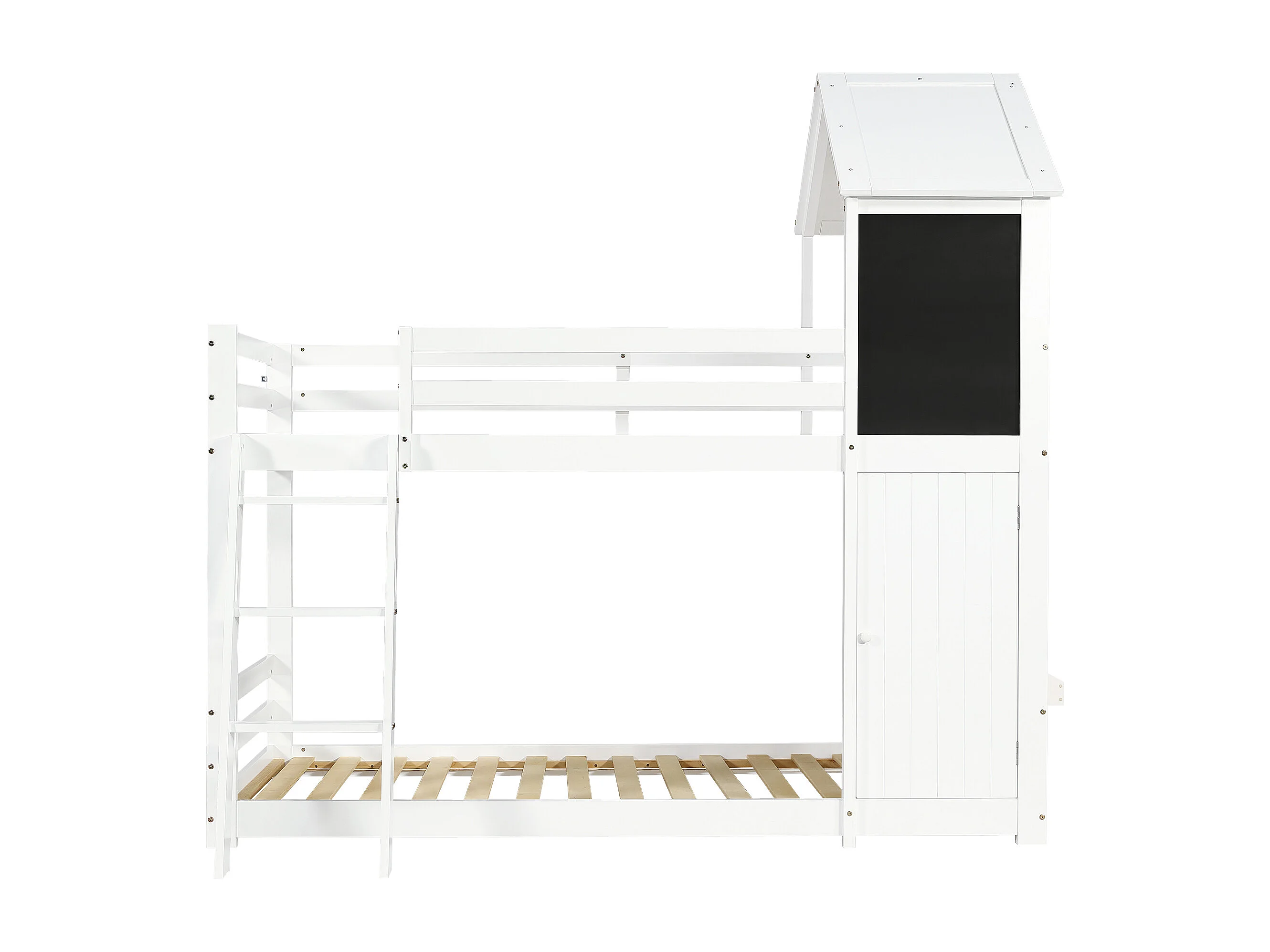 Etagenbett 90 x 200 cm – mit kleiner Tür, Kreidetafel, Treppe und Dach – weiß – ohne Matratze