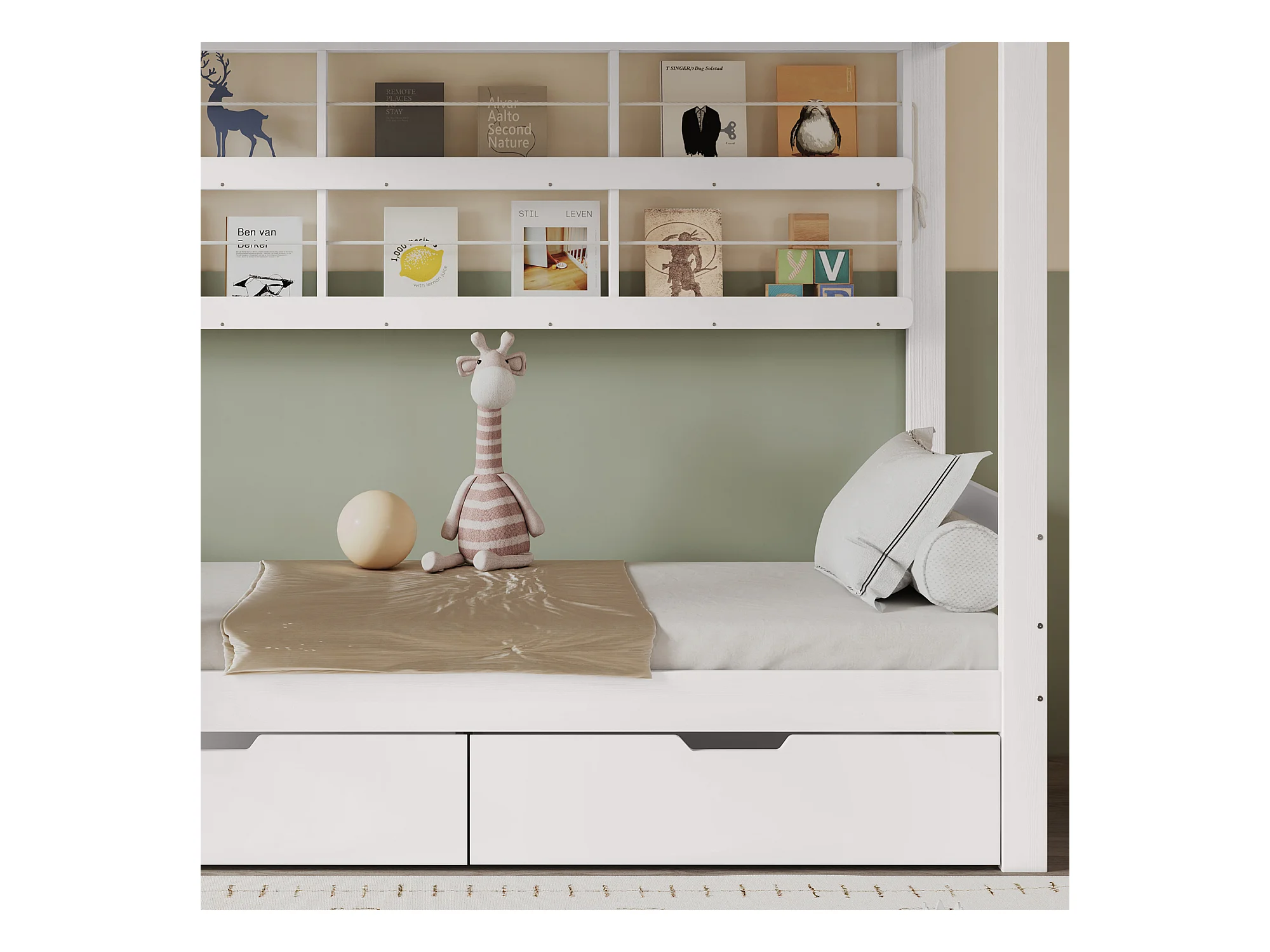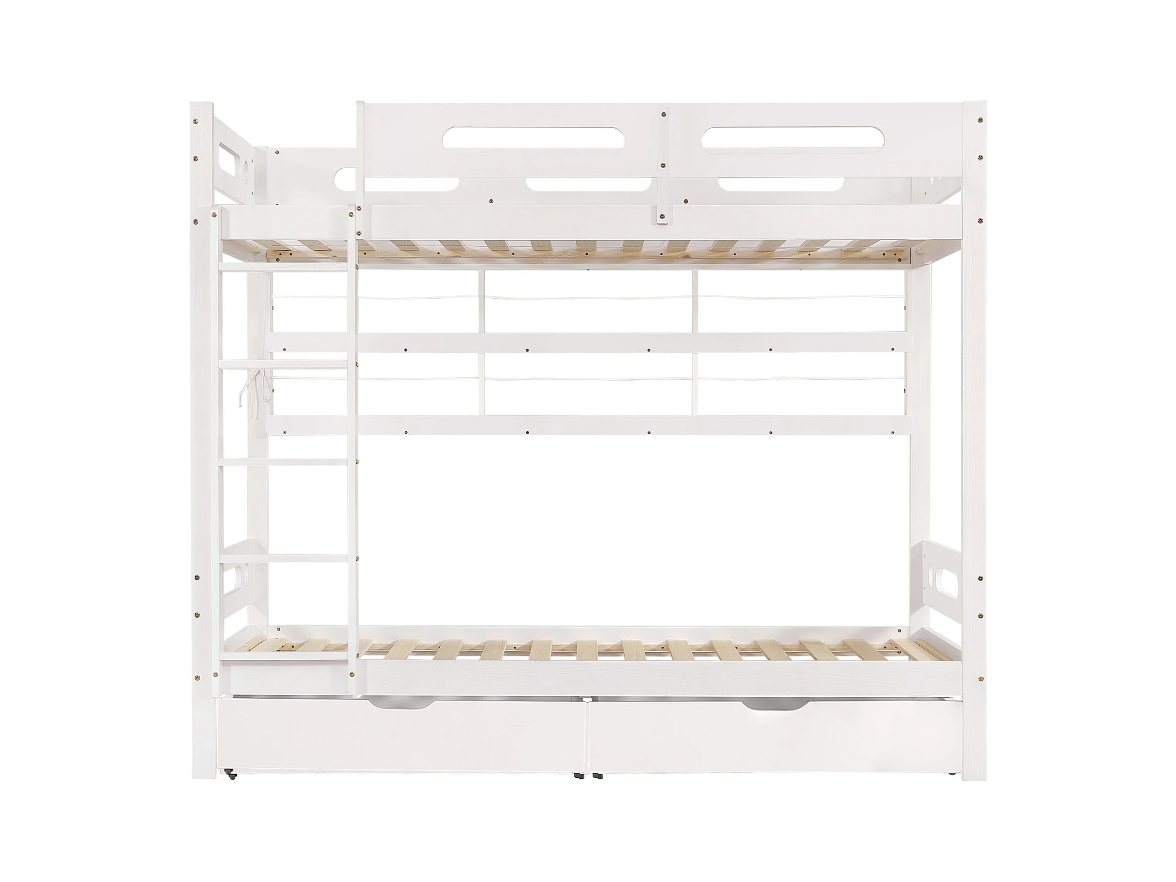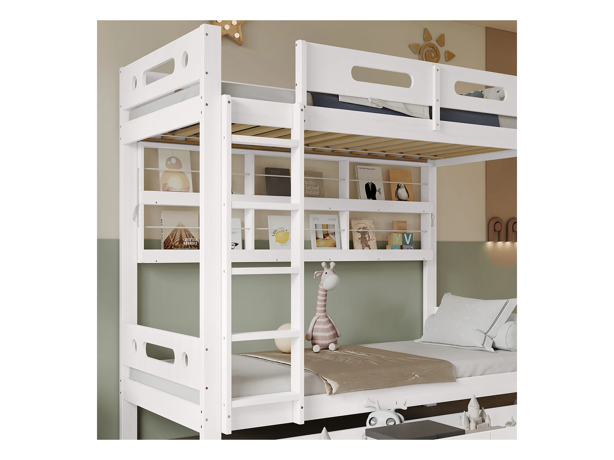 Etagenbett 90x200 cm - mit 2 Schubladen - mit offenen Regalen - Massivholz + MDF - Weiß (ohne Matratze)