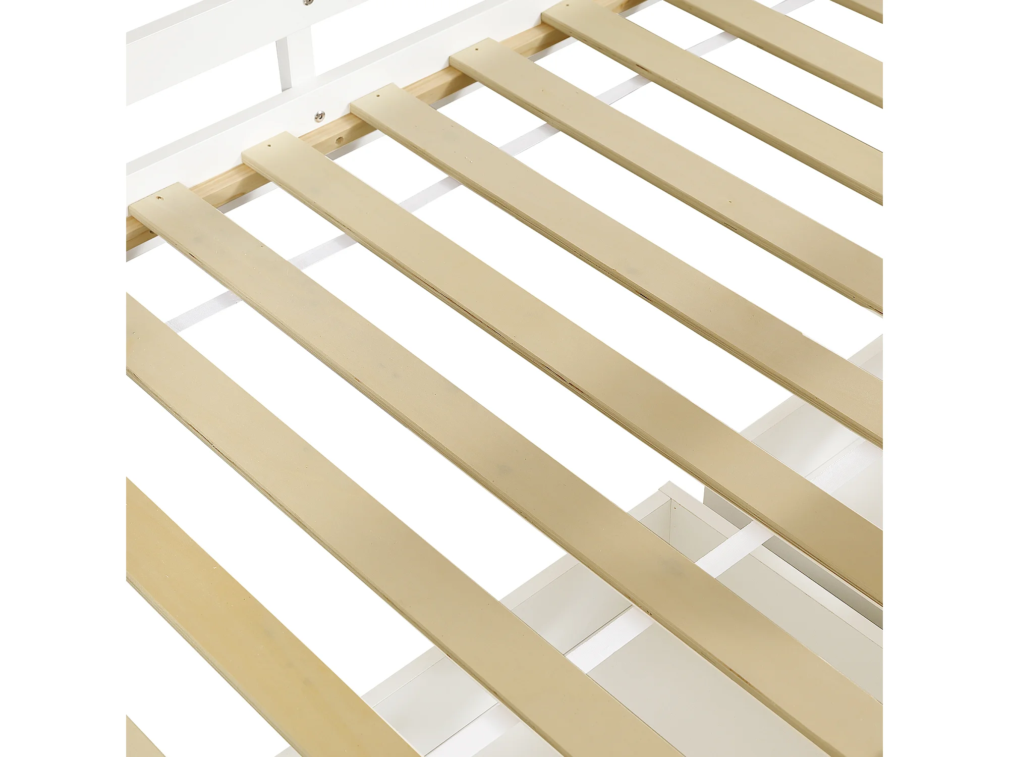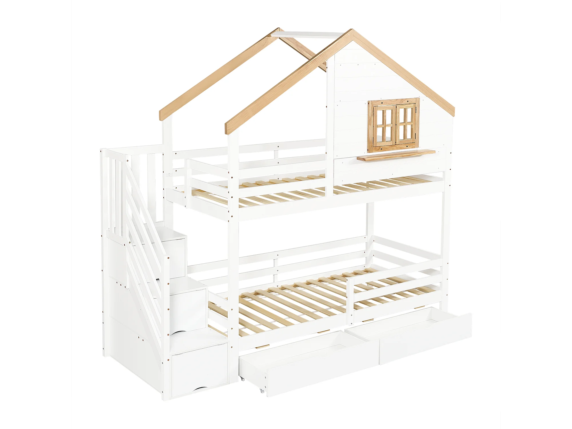 Etagenbett 90x200 cm - mit Aufbewahrungstreppen - mit 2 Schubladen - mit Dach und Fenstern - Massives Holz + MDF - Weiß + Natur