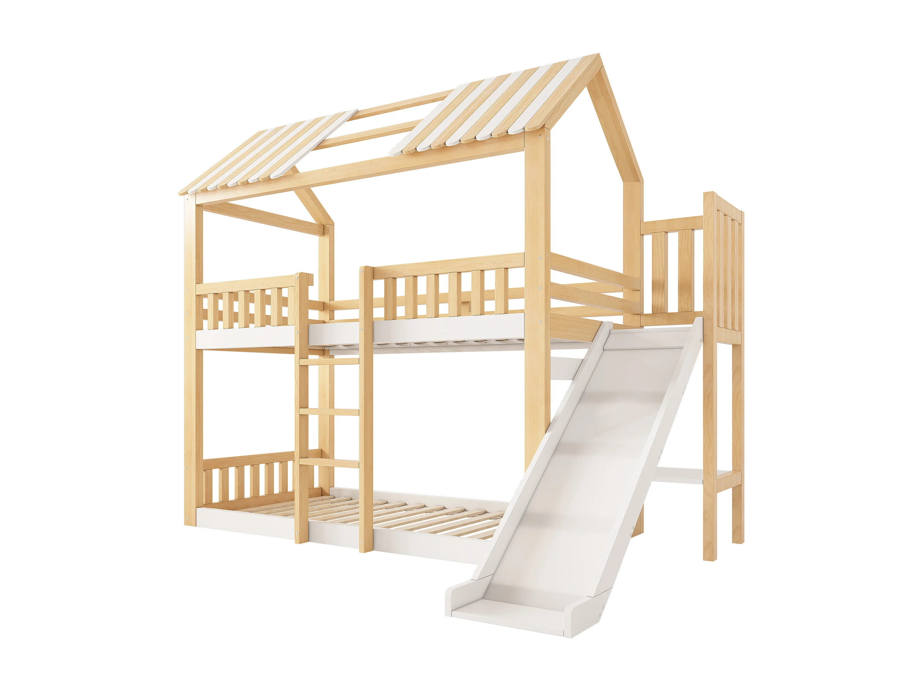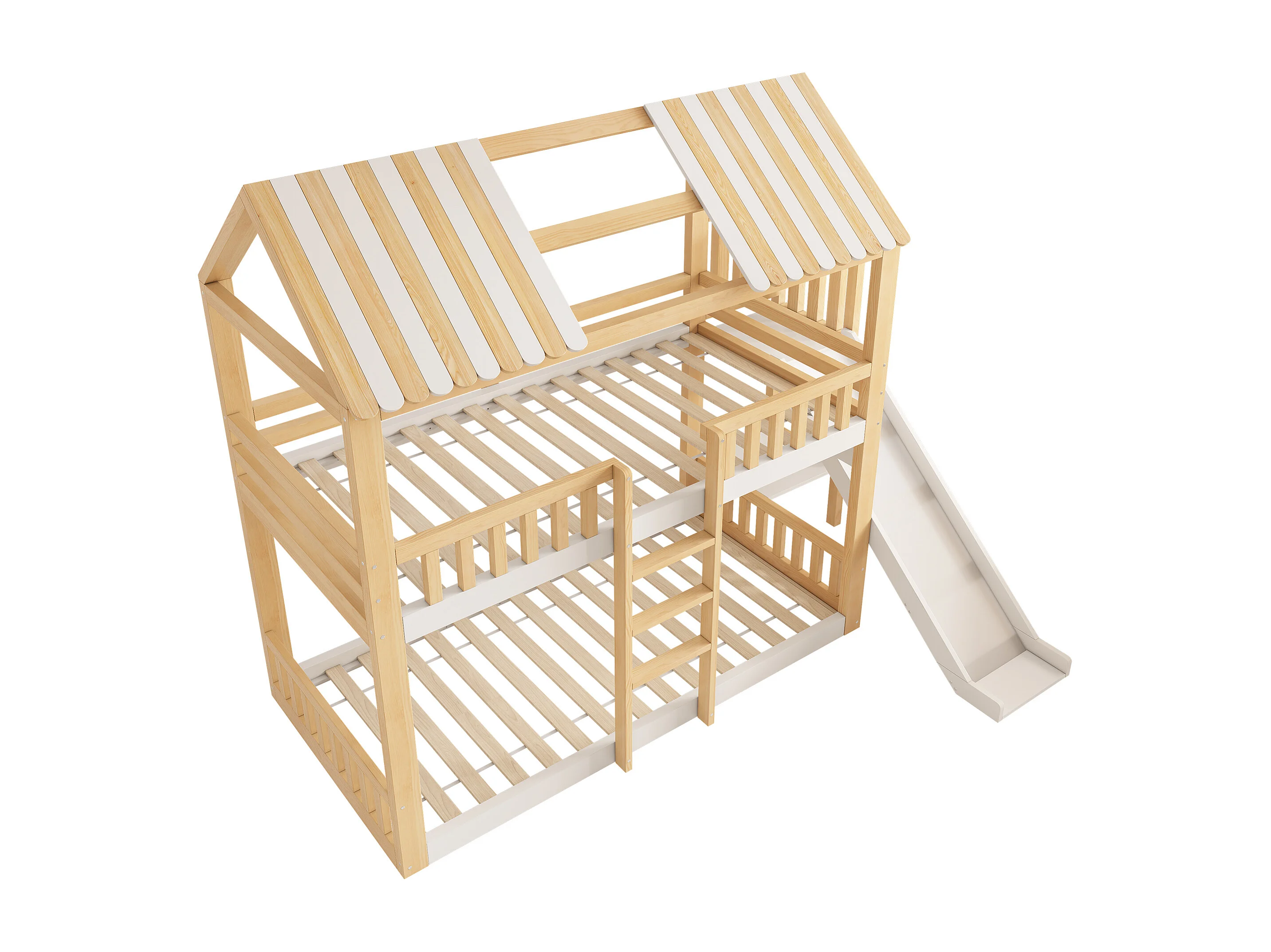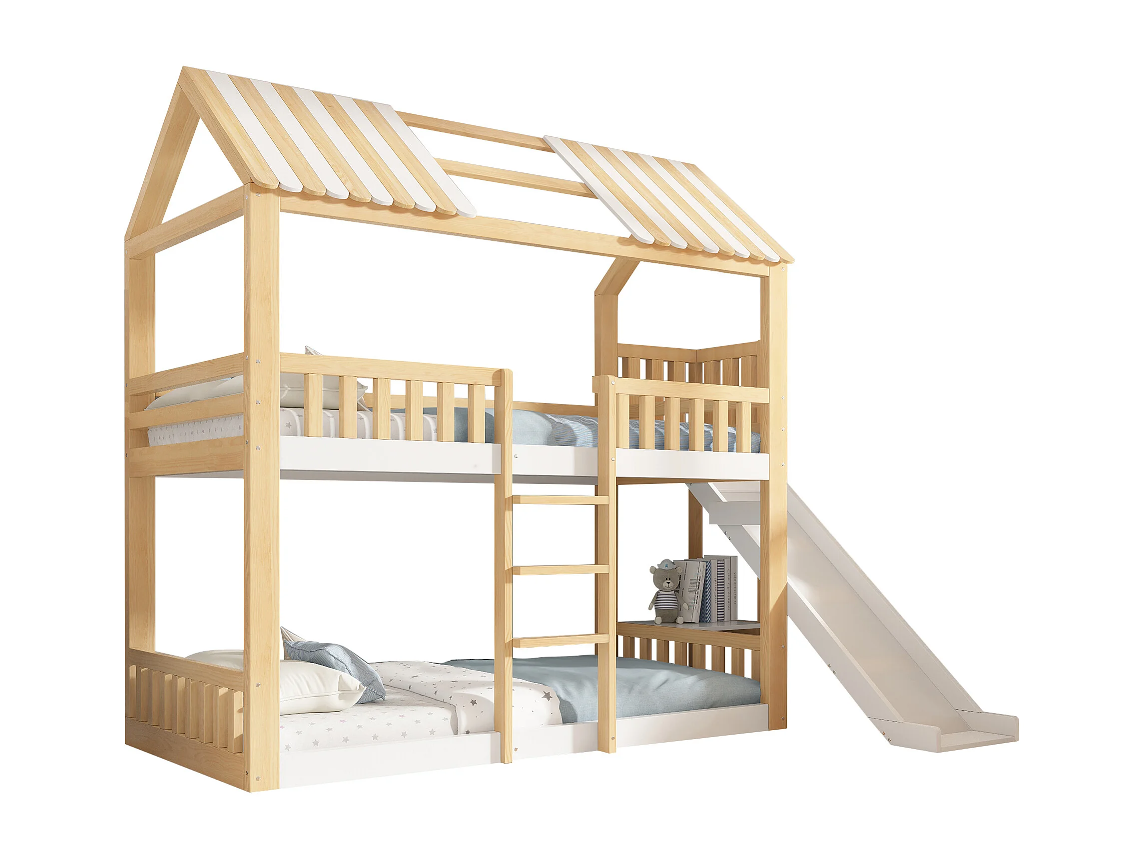 Etagenbett 90x200 cm - mit Leiter und Rutsche - mit Regalen und Schutzgittern - Weiß + Natur​ (ohne Matratze)