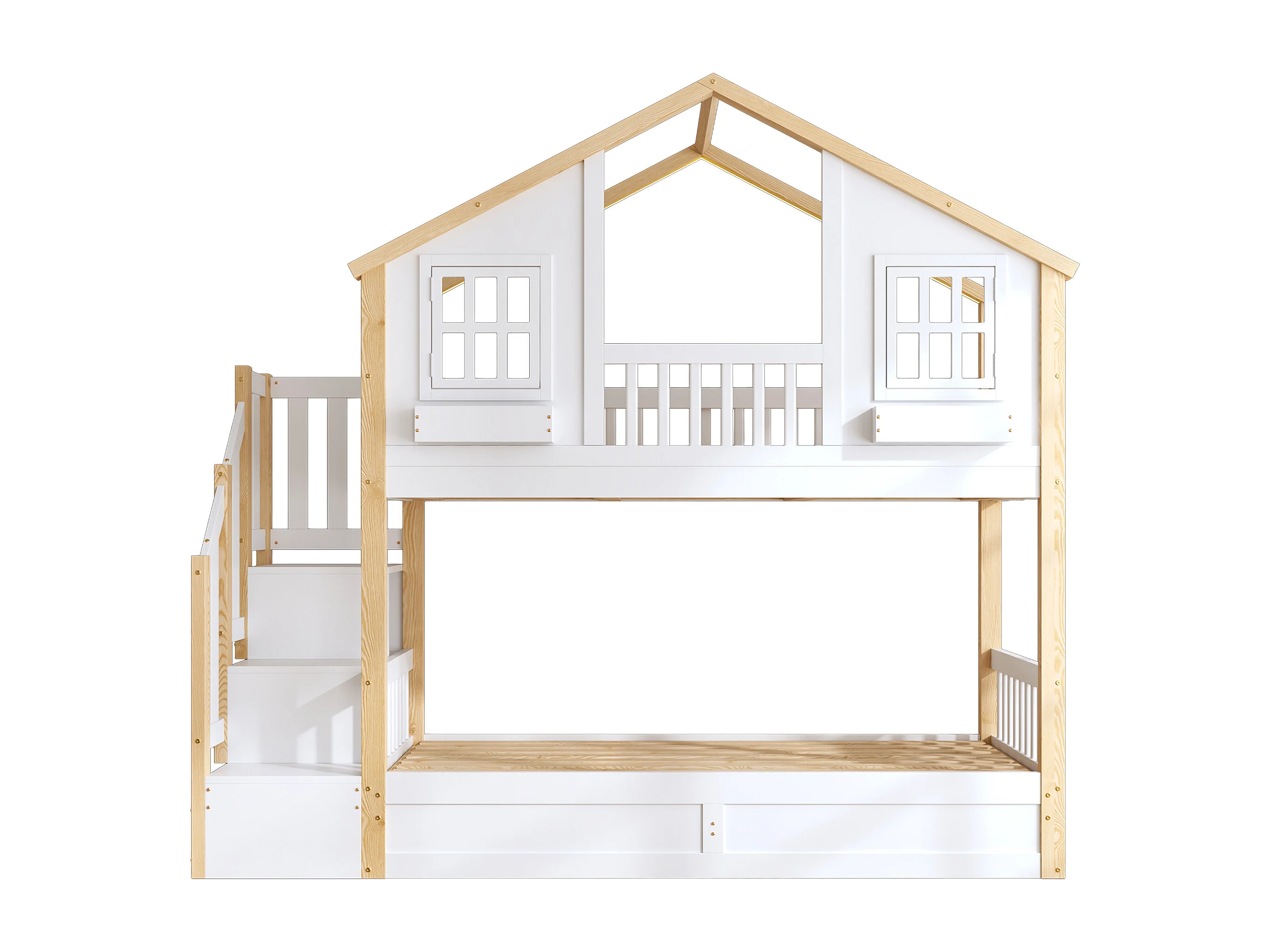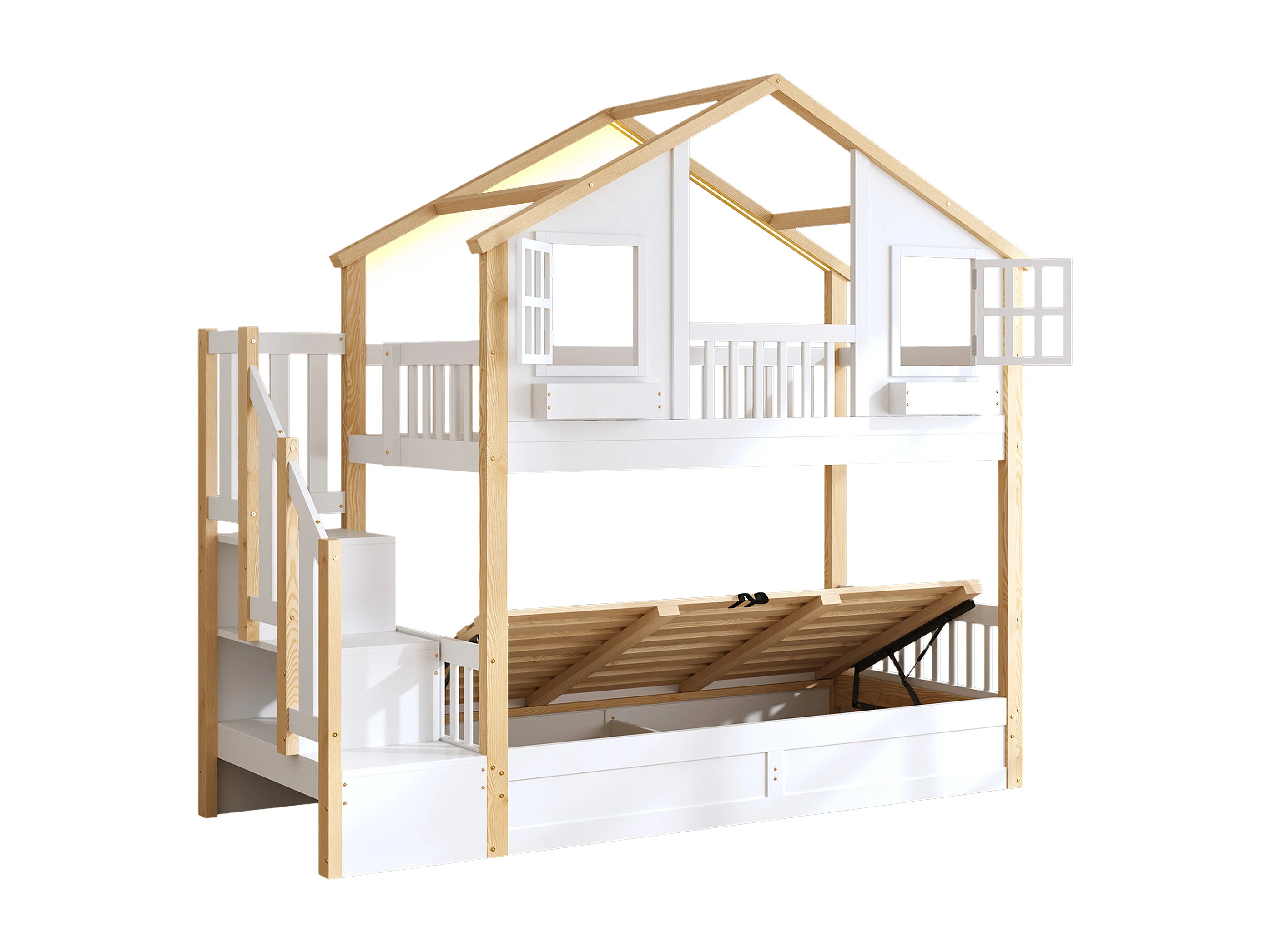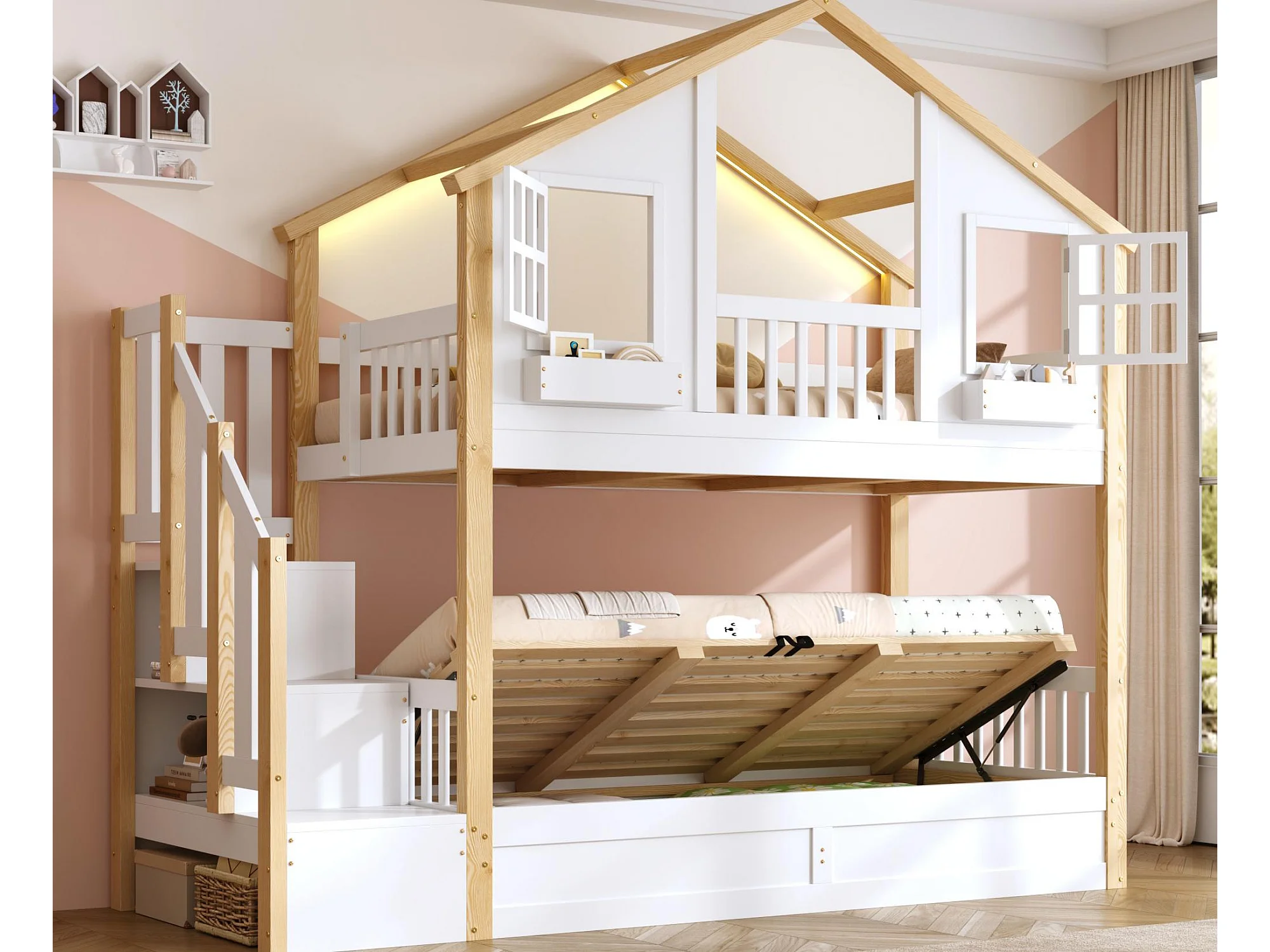 Etagenbett für Kinder 90x200 - mit unterem Bett mit Bettkasten - LED und Aufstiegsleiter mit Stauraum - weiß und natur​ (ohne Matratze)