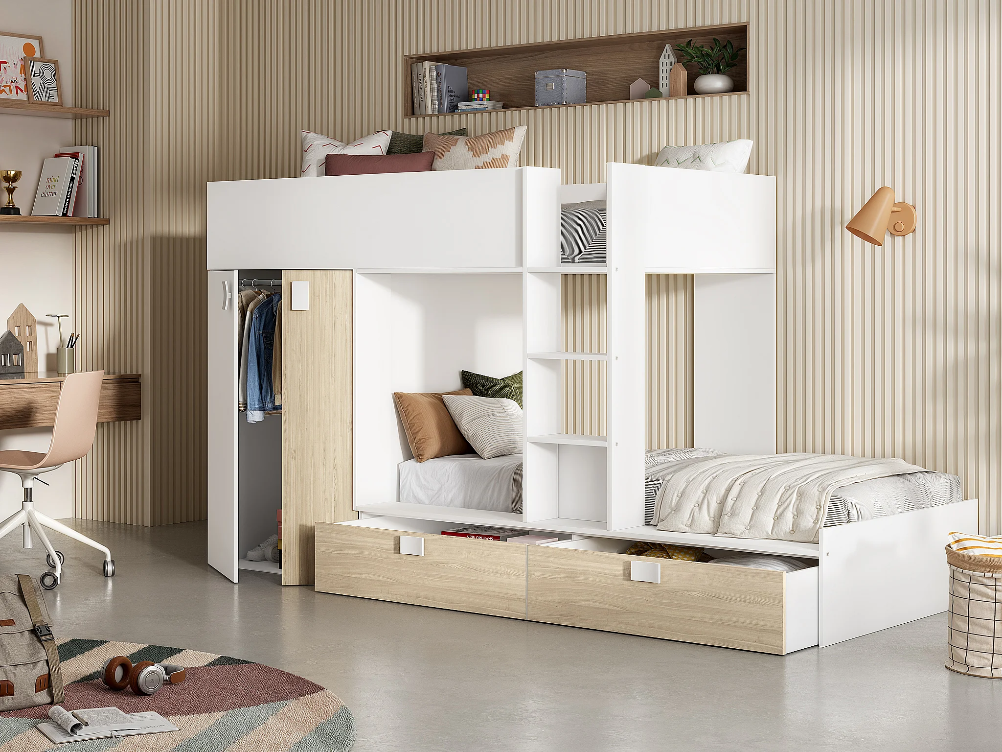 Etagenbett mit Kleiderschrank - 2x 90 x 190 cm - Weiß & Naturfarben - JUANITO