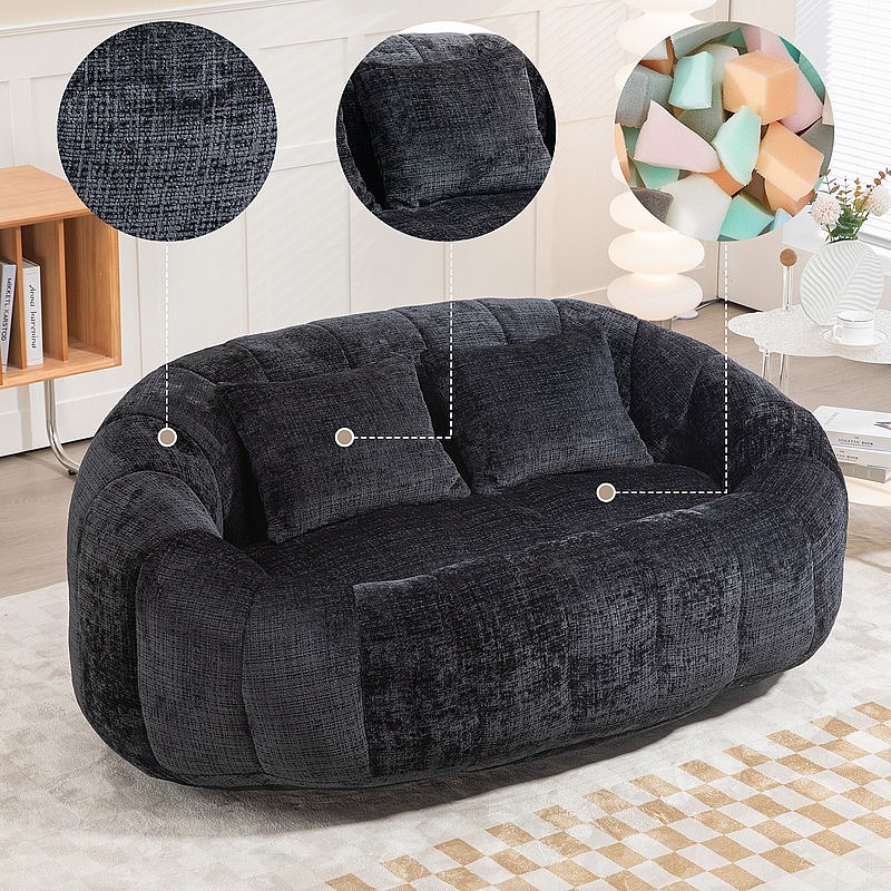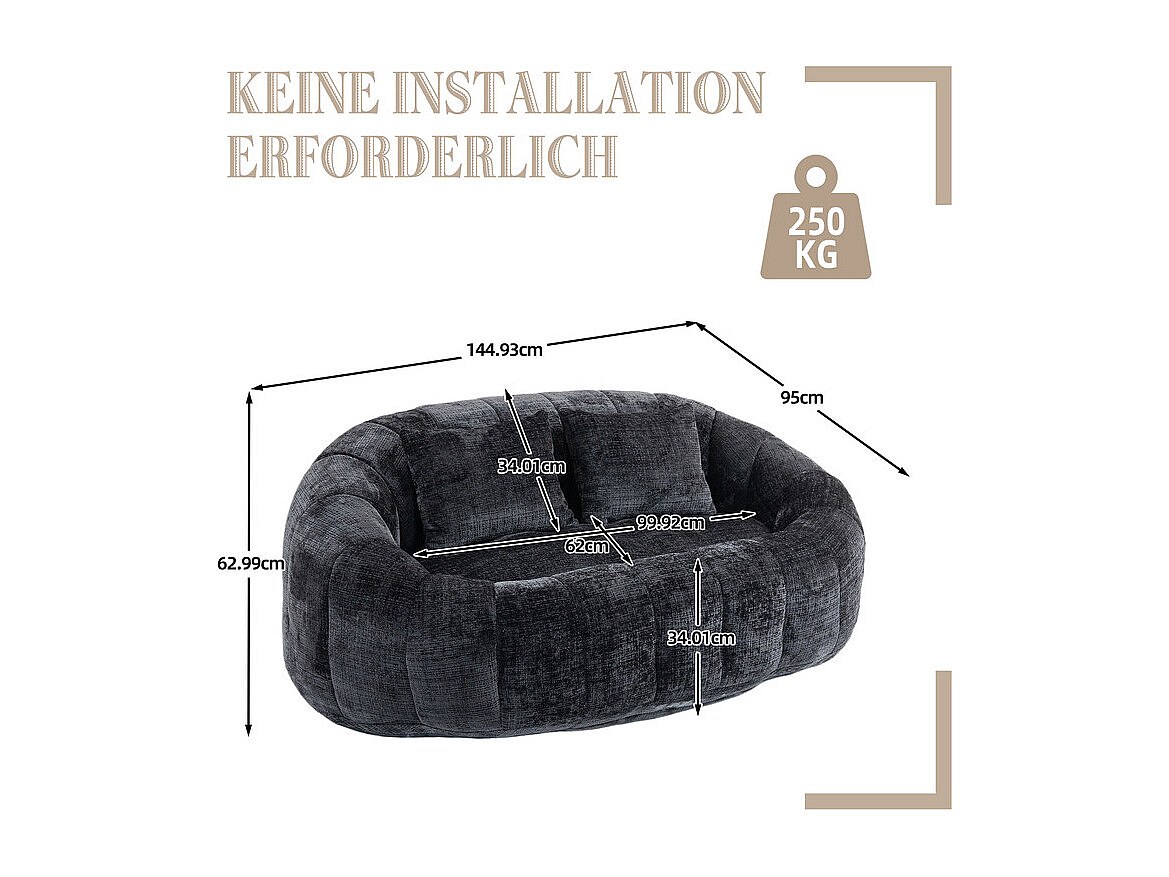 Faulenzer Sessel aus Chenille - 2-sitzer - mit 2 Kissen - 62cm Sitztiefe - Max. Belastung 250kg - Schwarz