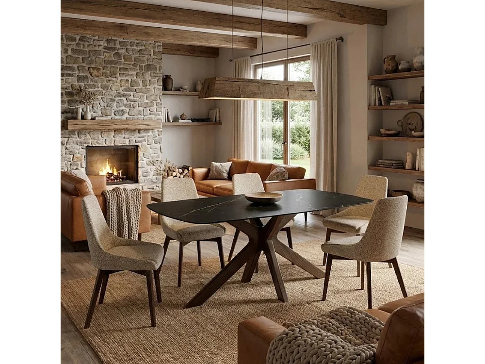 Fester Tisch Thiago 180x90 cm mit schwarzer Marmor-Effekt-Keramikplatte und massivem Walnussfuß, elegantes Design, 8 Plätze