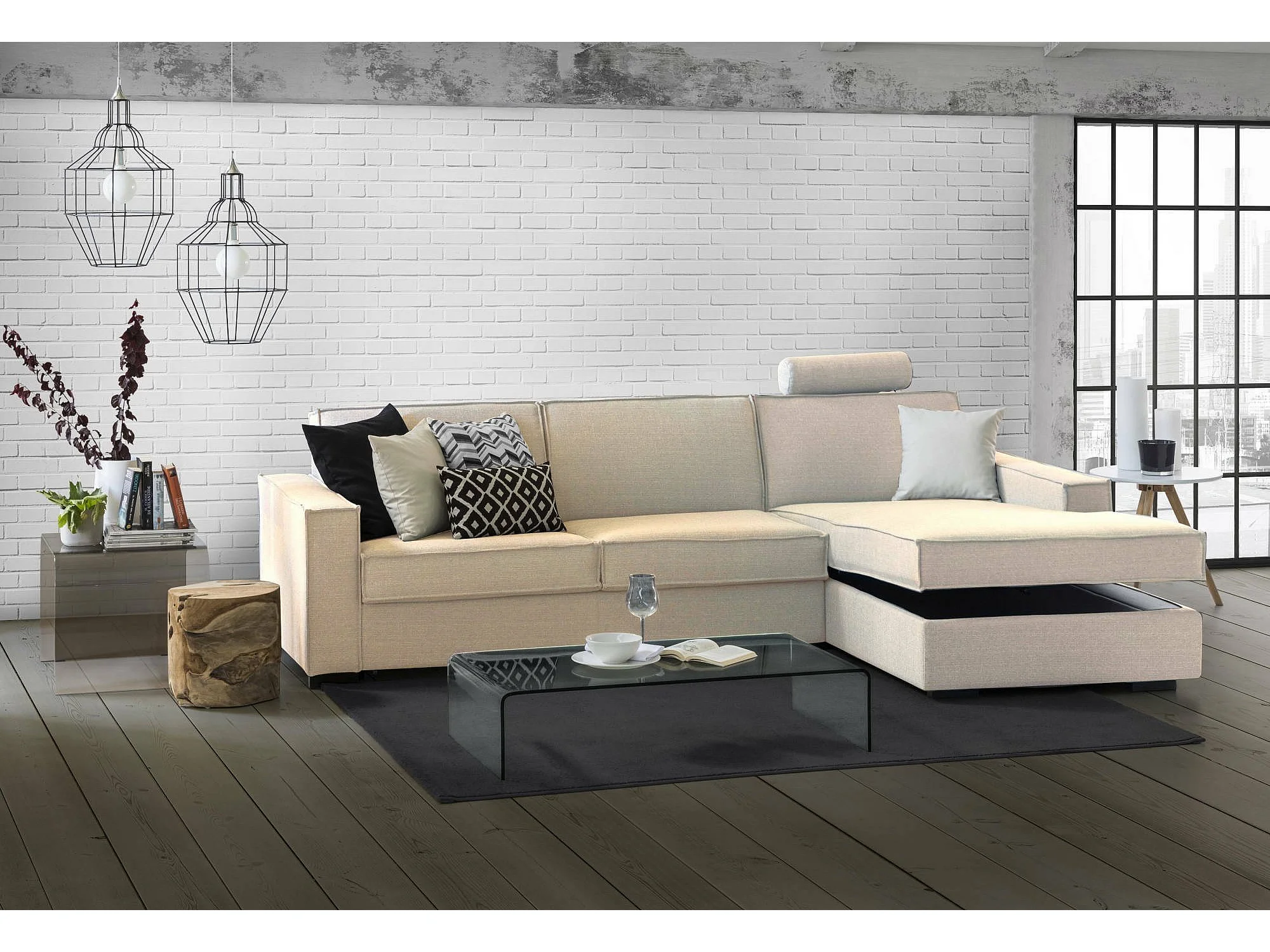 Festes Sofa Dkiyin, Ecksofa, 100% Made in Italy, Sofa Wohnzimmer mit, Rechte Containerhalbinsel, mit Standard-Armlehnen, Cm 280x95h90, Beige