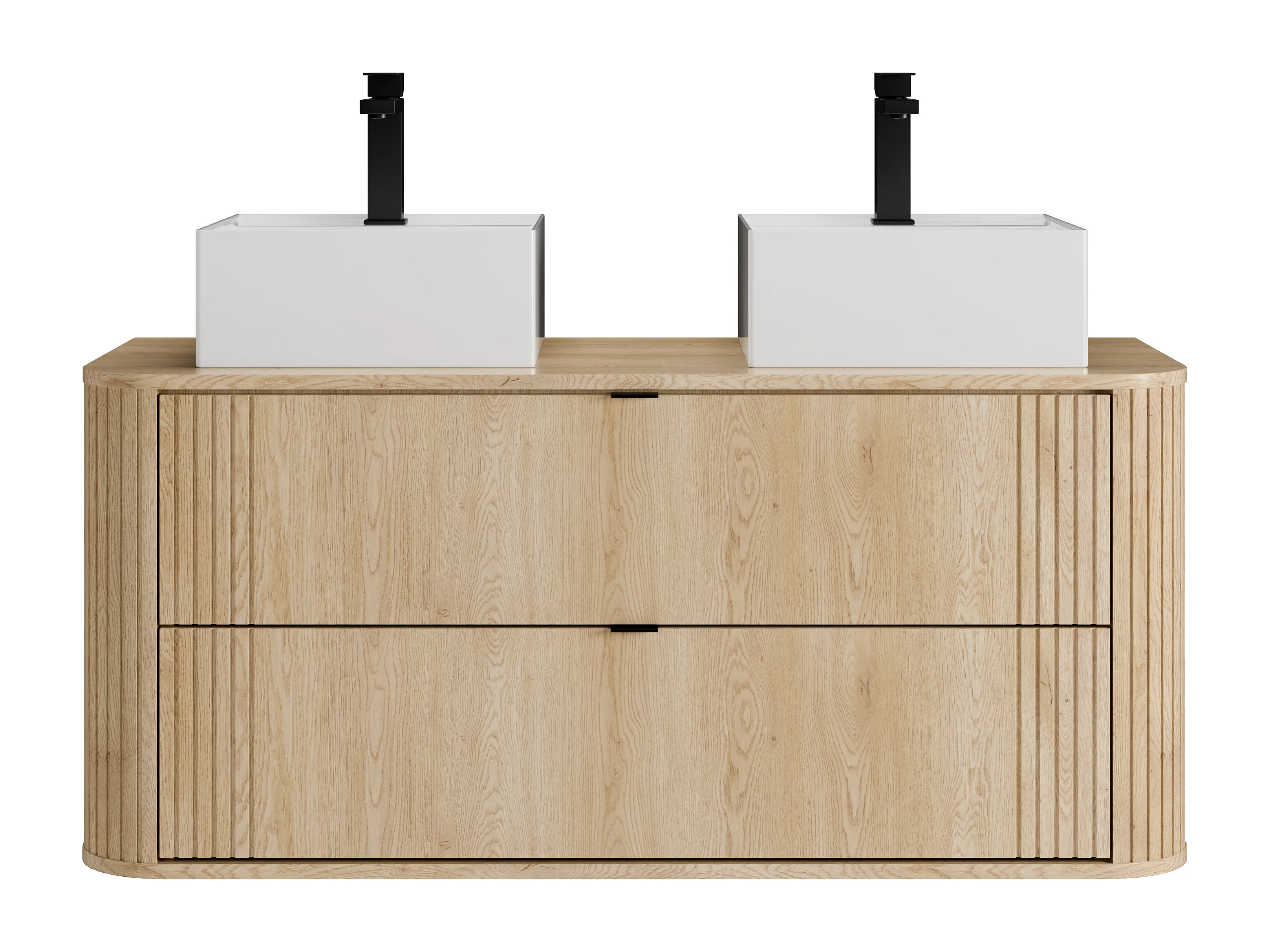 Hängender Waschtischunterschrank mit Doppel-Waschbecken quadratisch zum Aufstellen und Armatur, helles Naturholz, L120 cm - FILOR