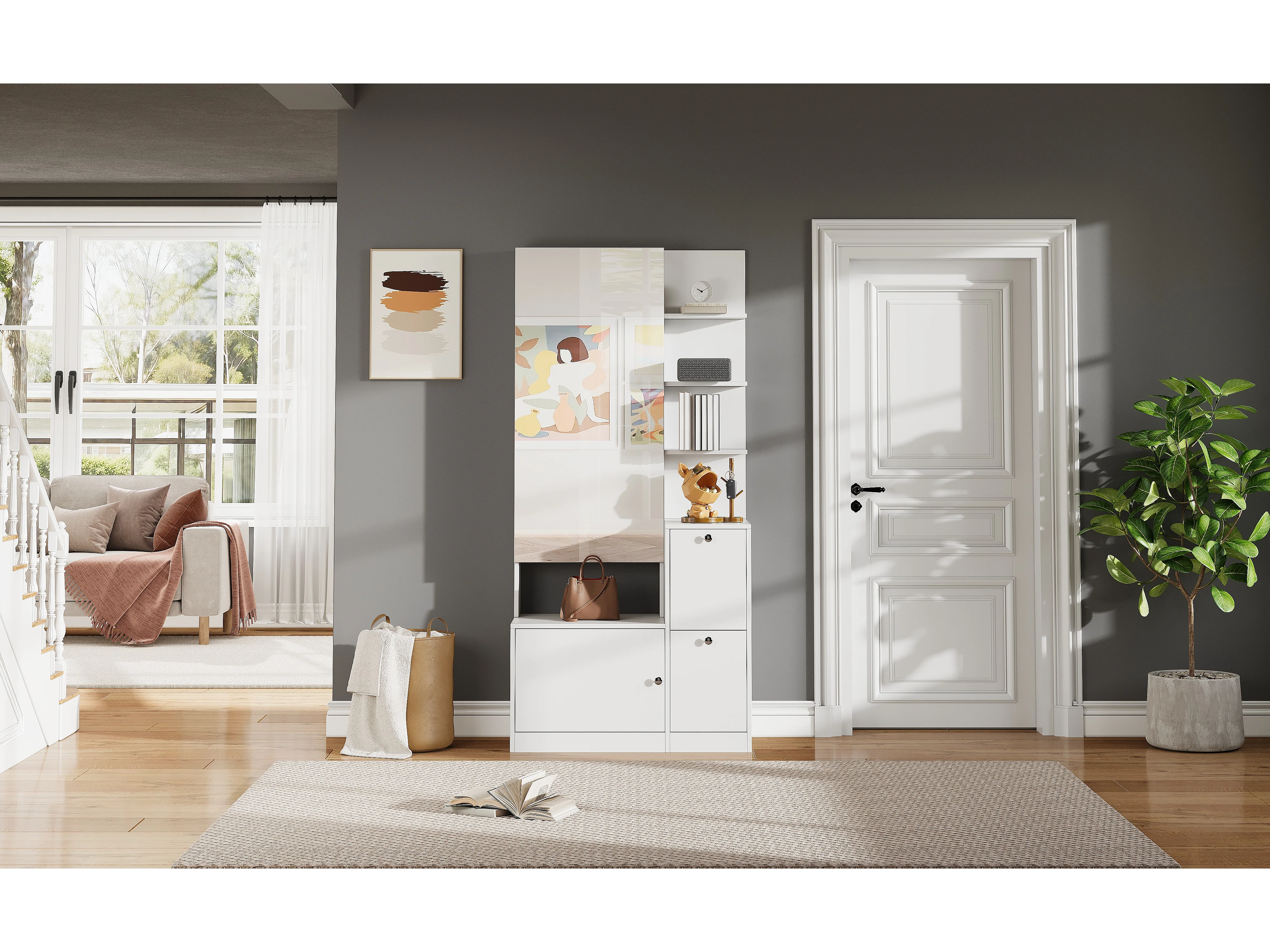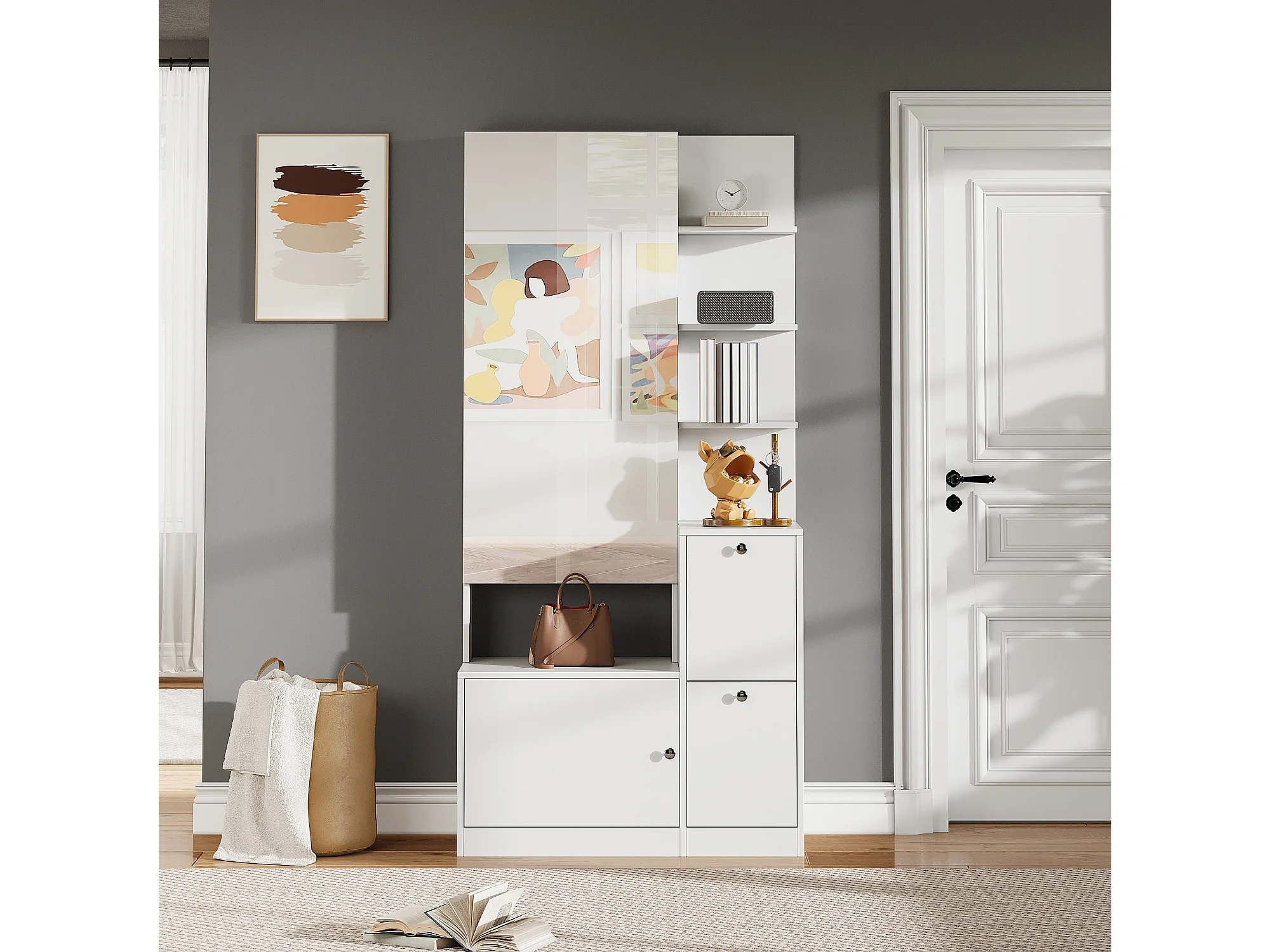 Flurschrank/Eingangsbereich – 85 x 40 x 180 cm – mit Spiegel, Schuhregal, 2 Türen und 5 Einlegeböden – Spanplatte – weiß