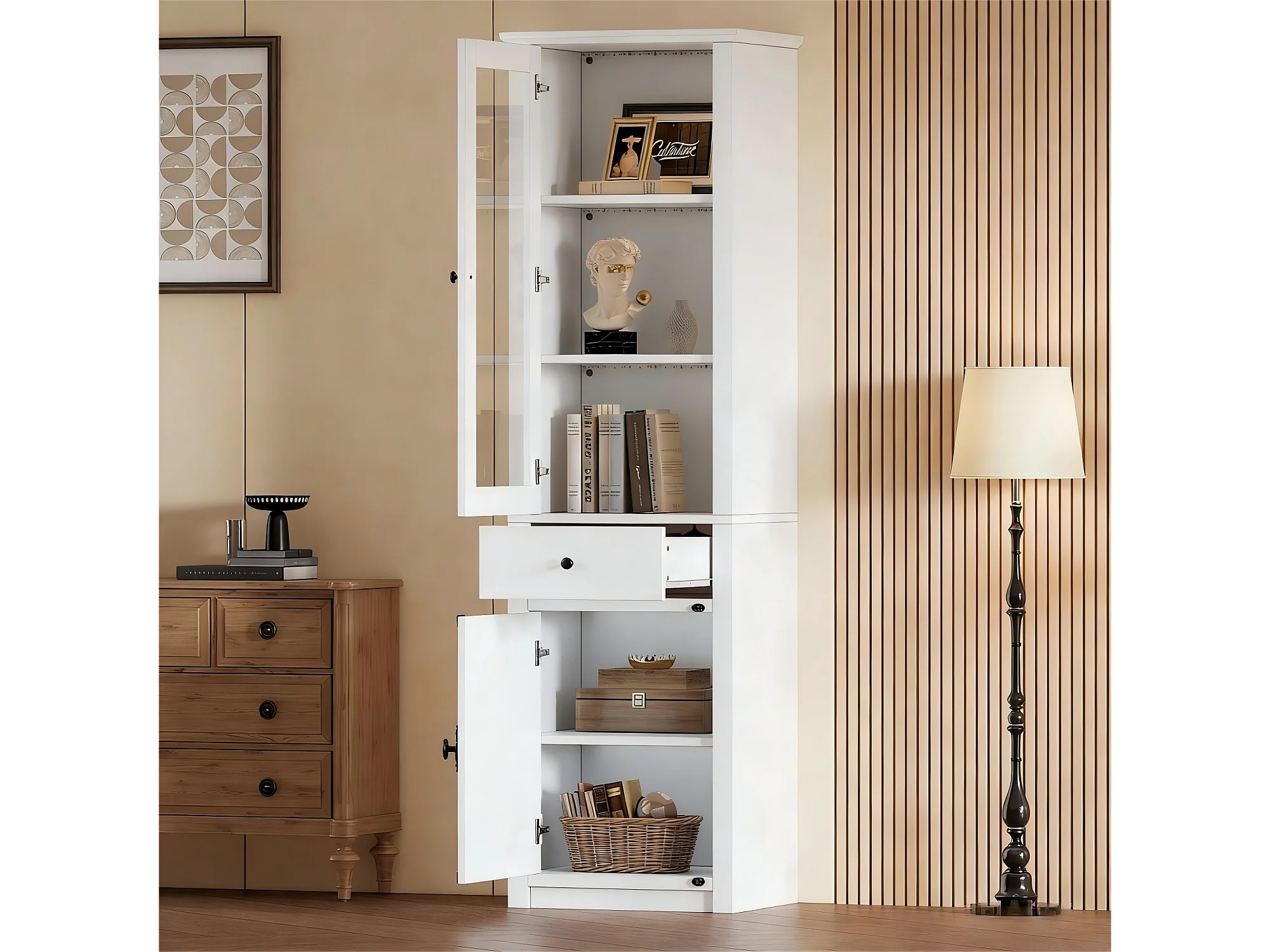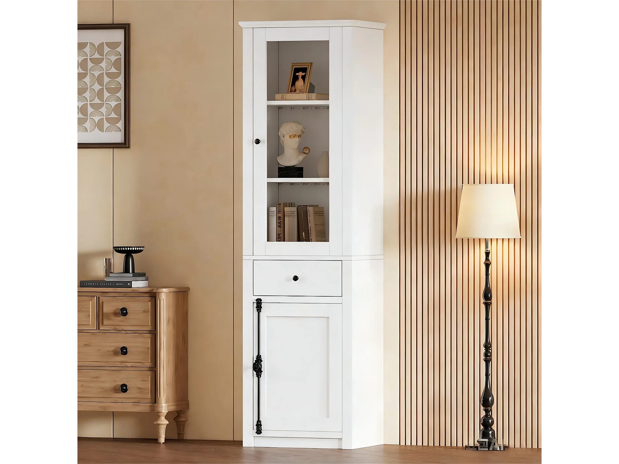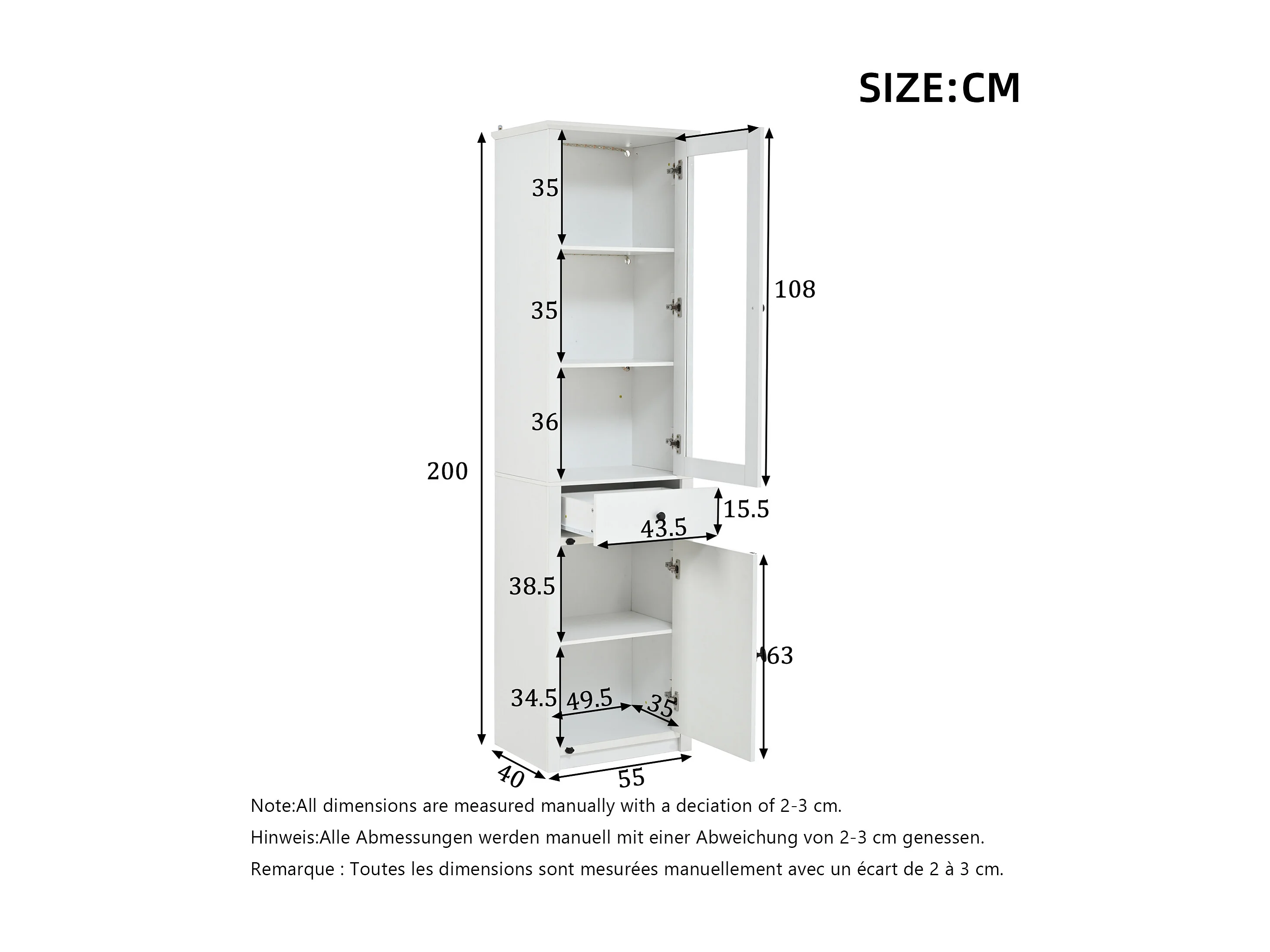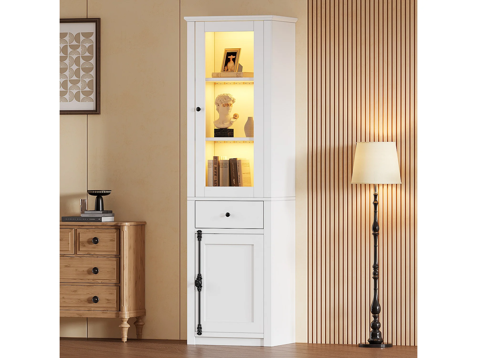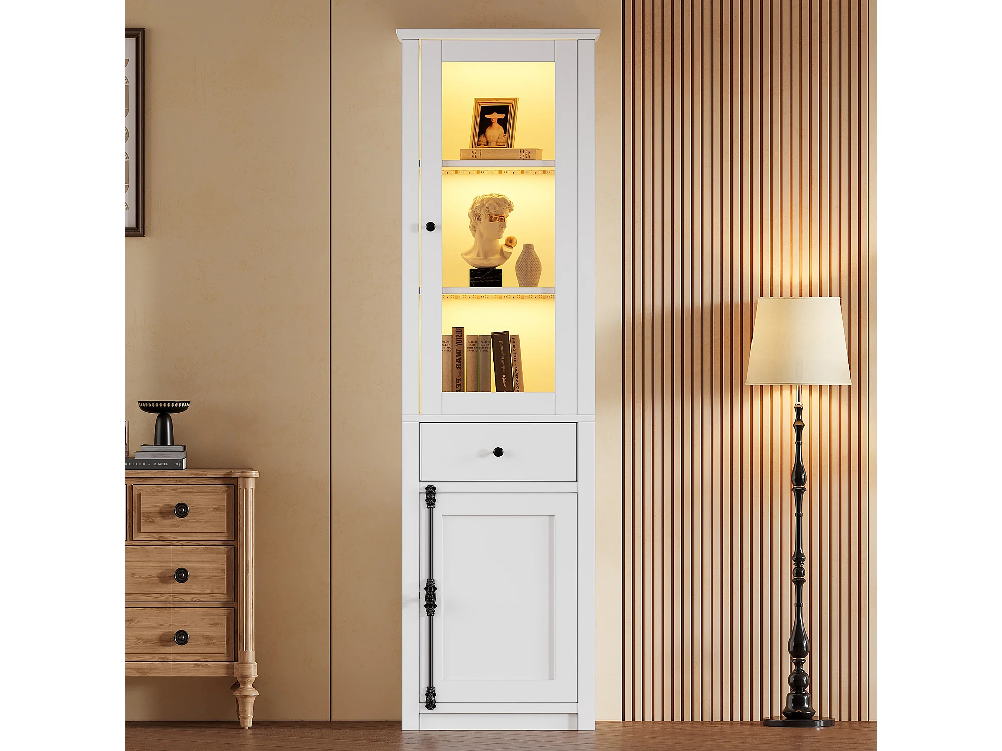 Freistehende Glasvitrine – 55 x 40 x 200 mm – mit 2 Türen + 1 Schublade + LEDs – Spanplatte – weiß