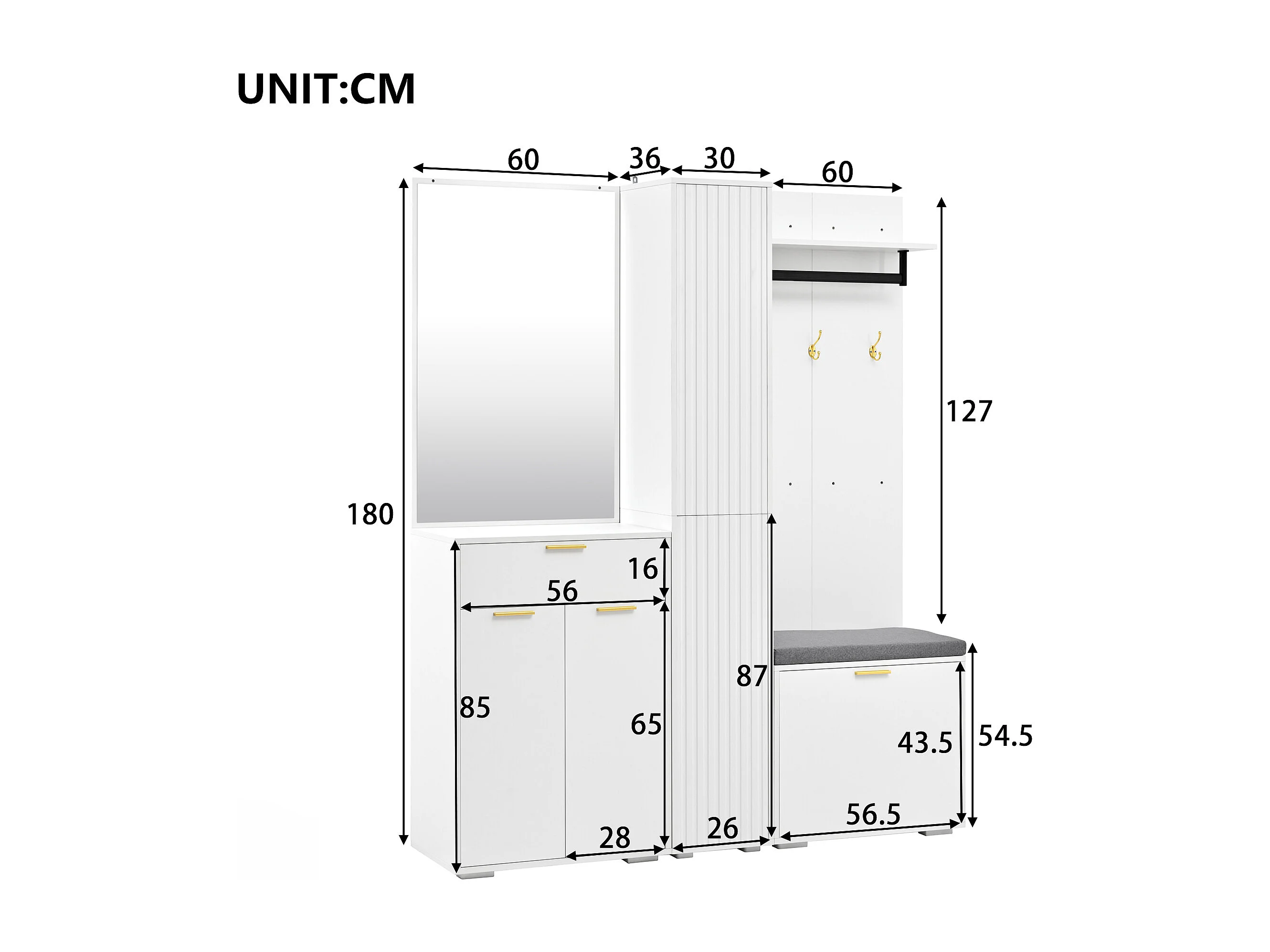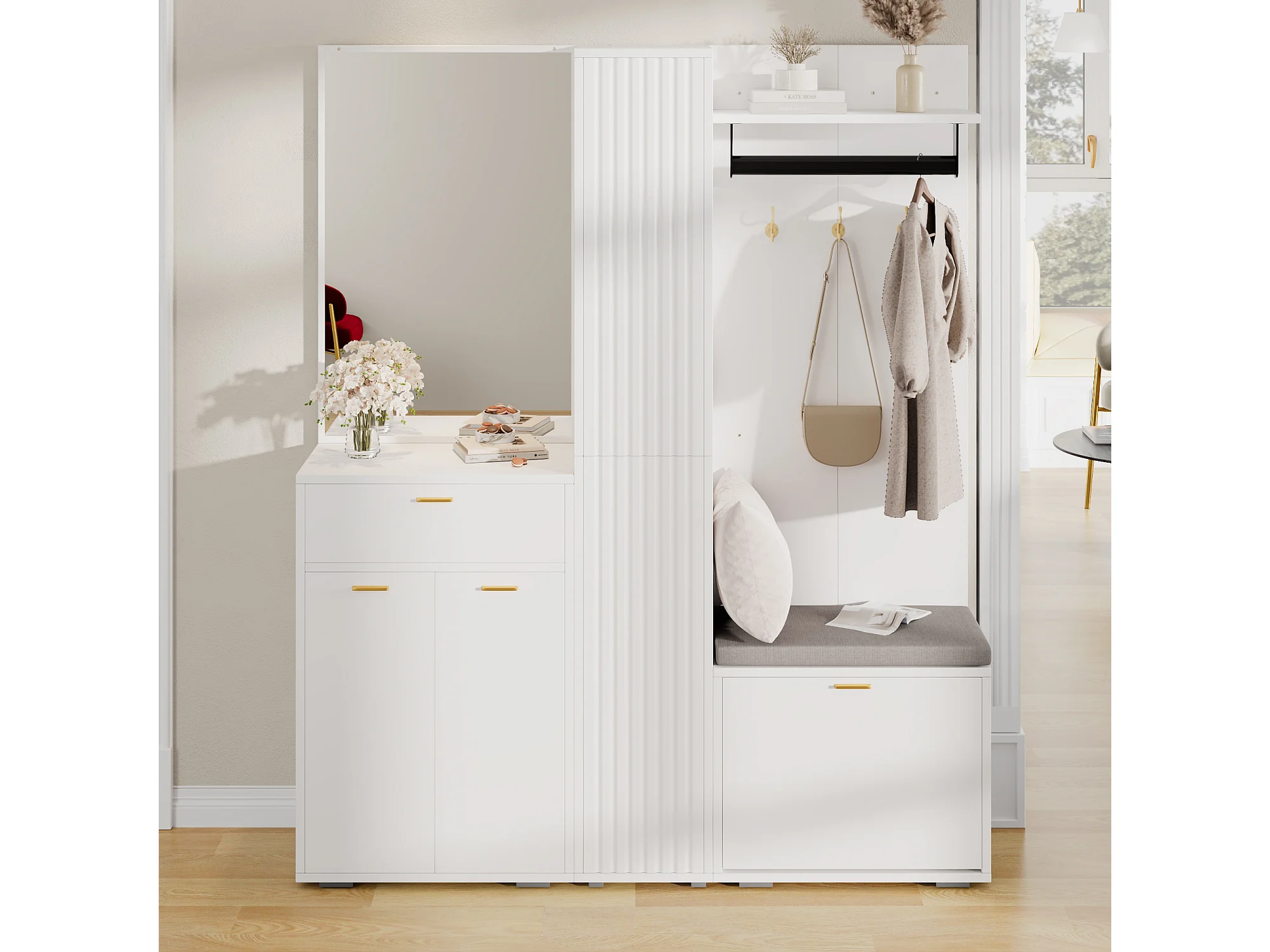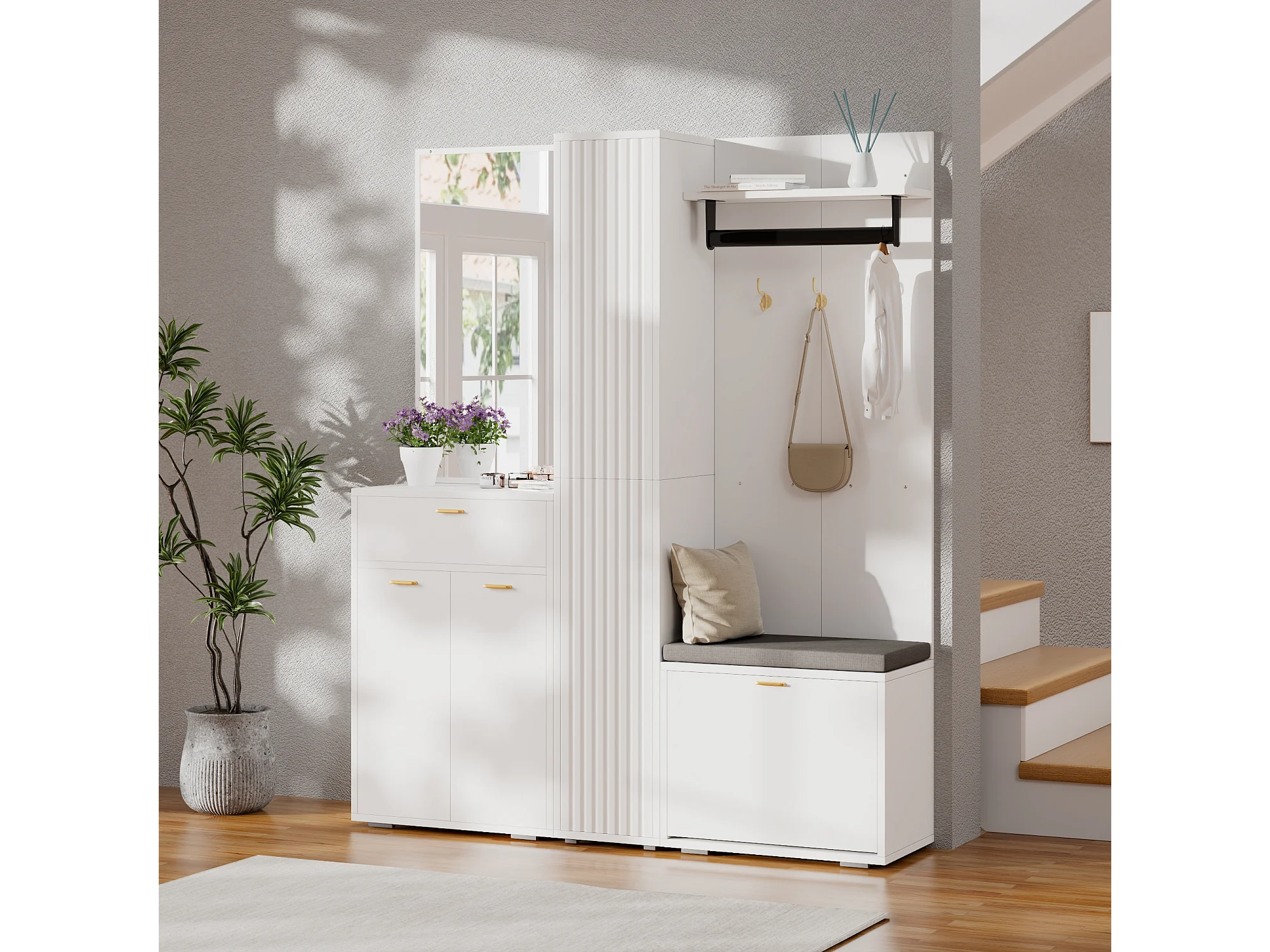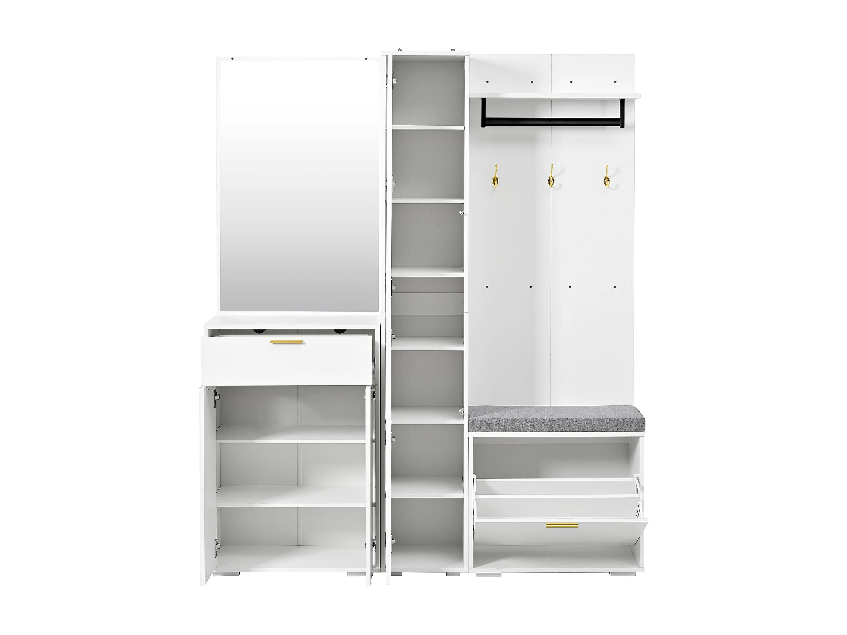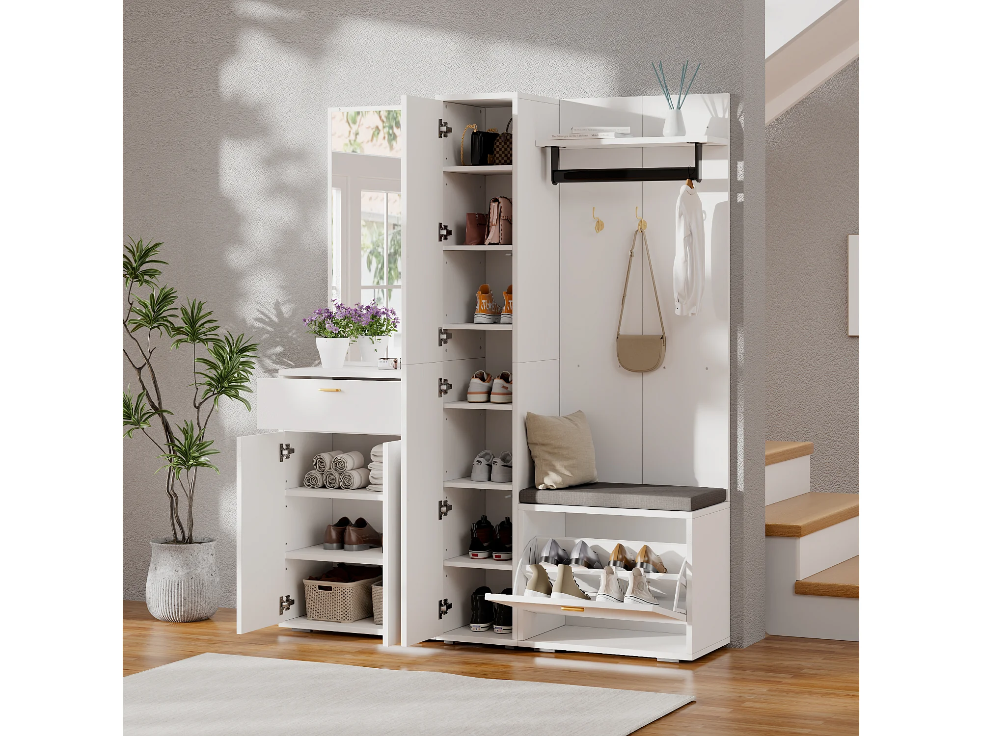 Garderobe/Kleiderschrank – 150 x 36 x 180 cm – mit Schuhbank, Ablagefach, Spiegel und Schubladen – Spanplatte – weiß