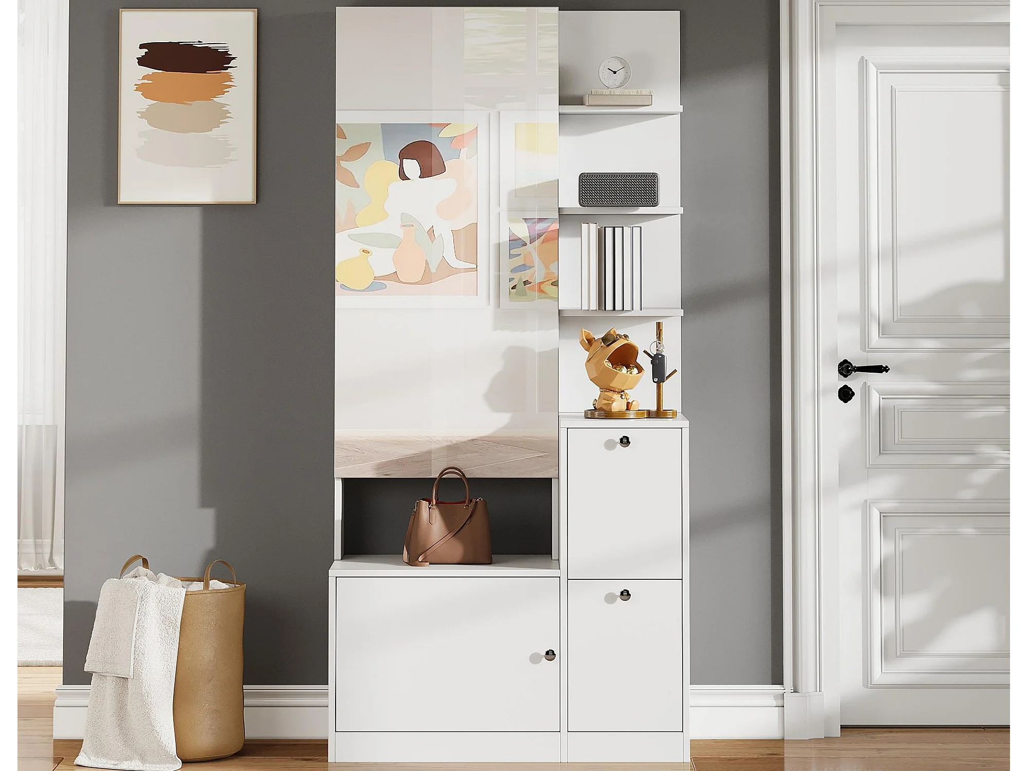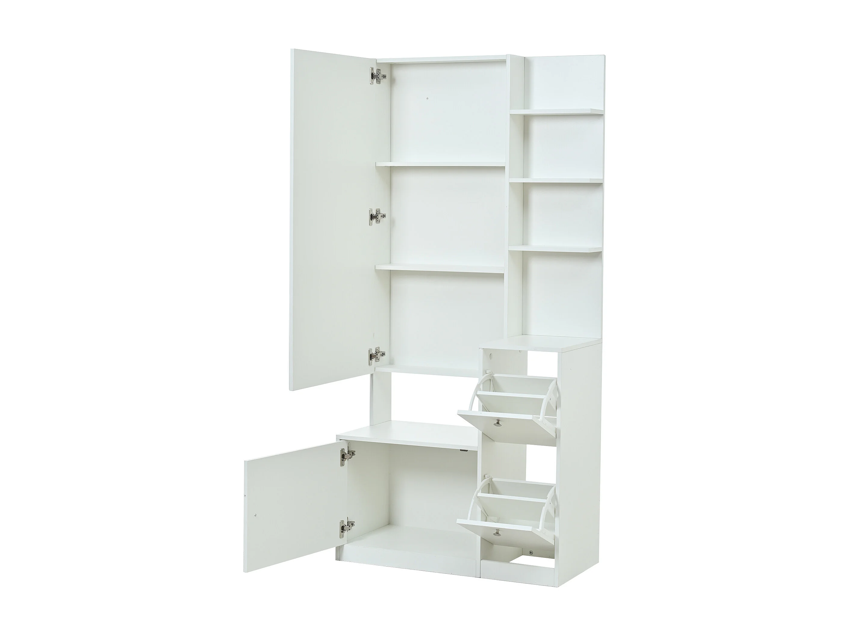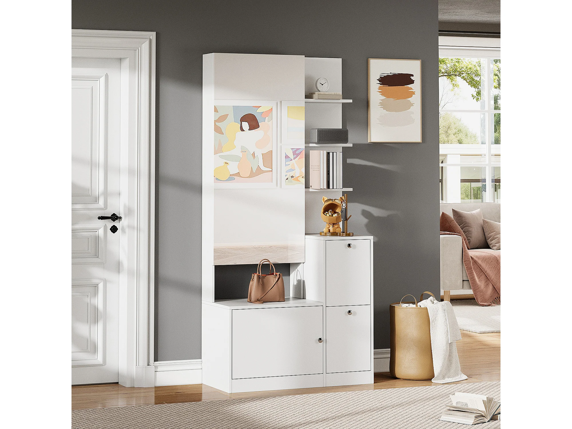 Garderoben-Set für den Eingangsbereich 85x40x180 cm - mit Spiegel und 2 Schuhregalen - 2 Türen - offene Regale - weiß