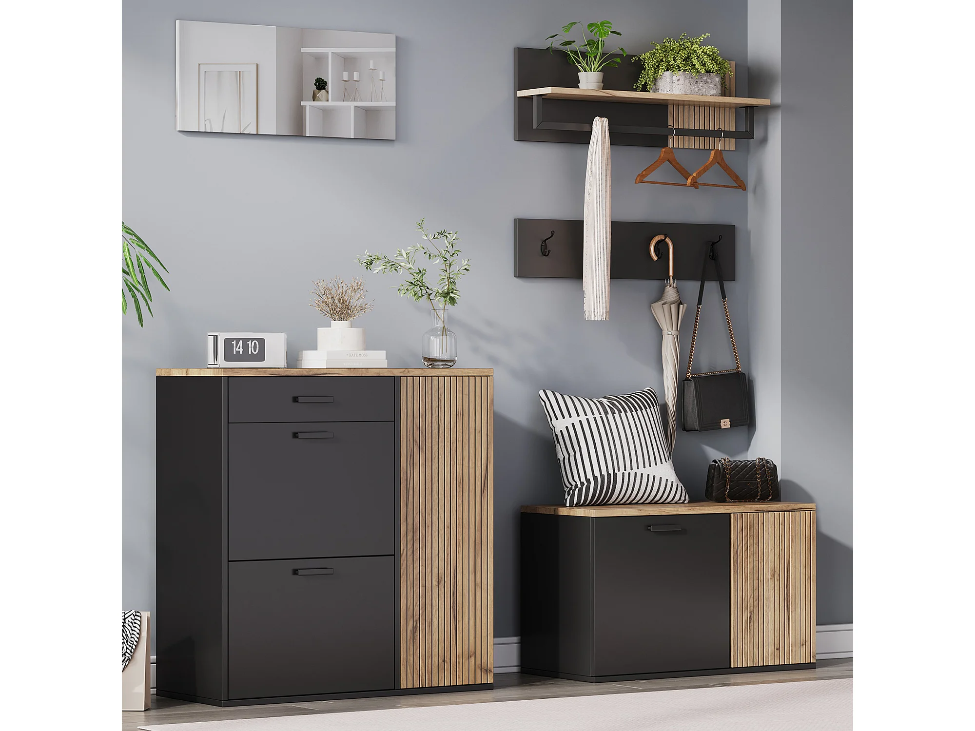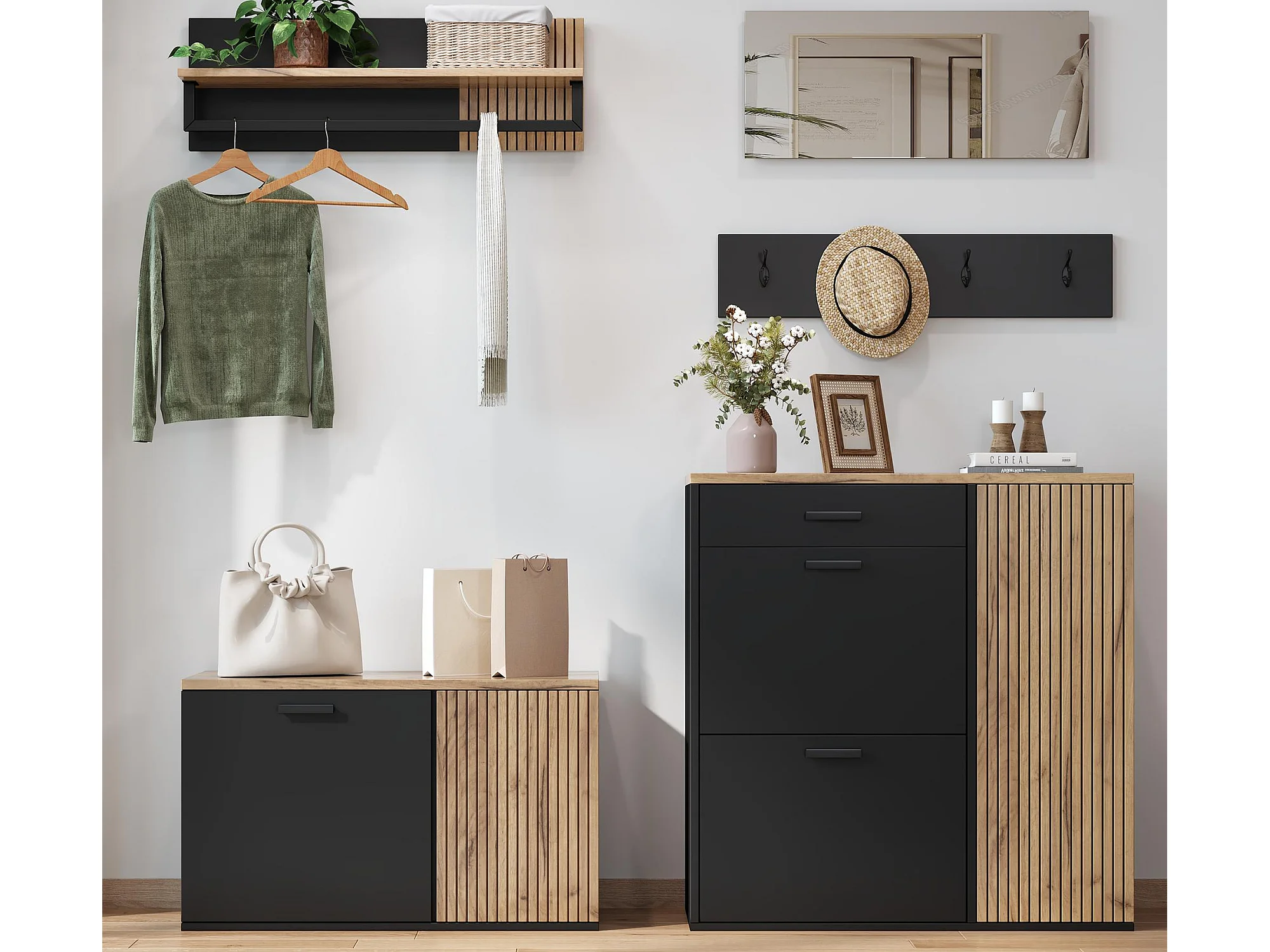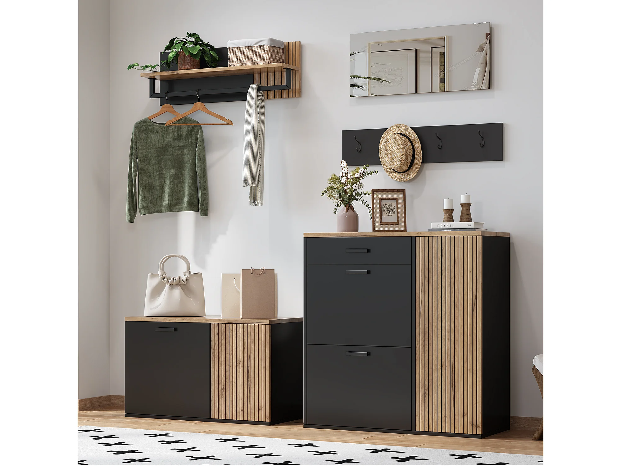 Garderobenset für den Eingangsbereich - 2 Schuhschränke - Kleiderstange und 4 Haken - Spiegel - Natur + Schwarz
