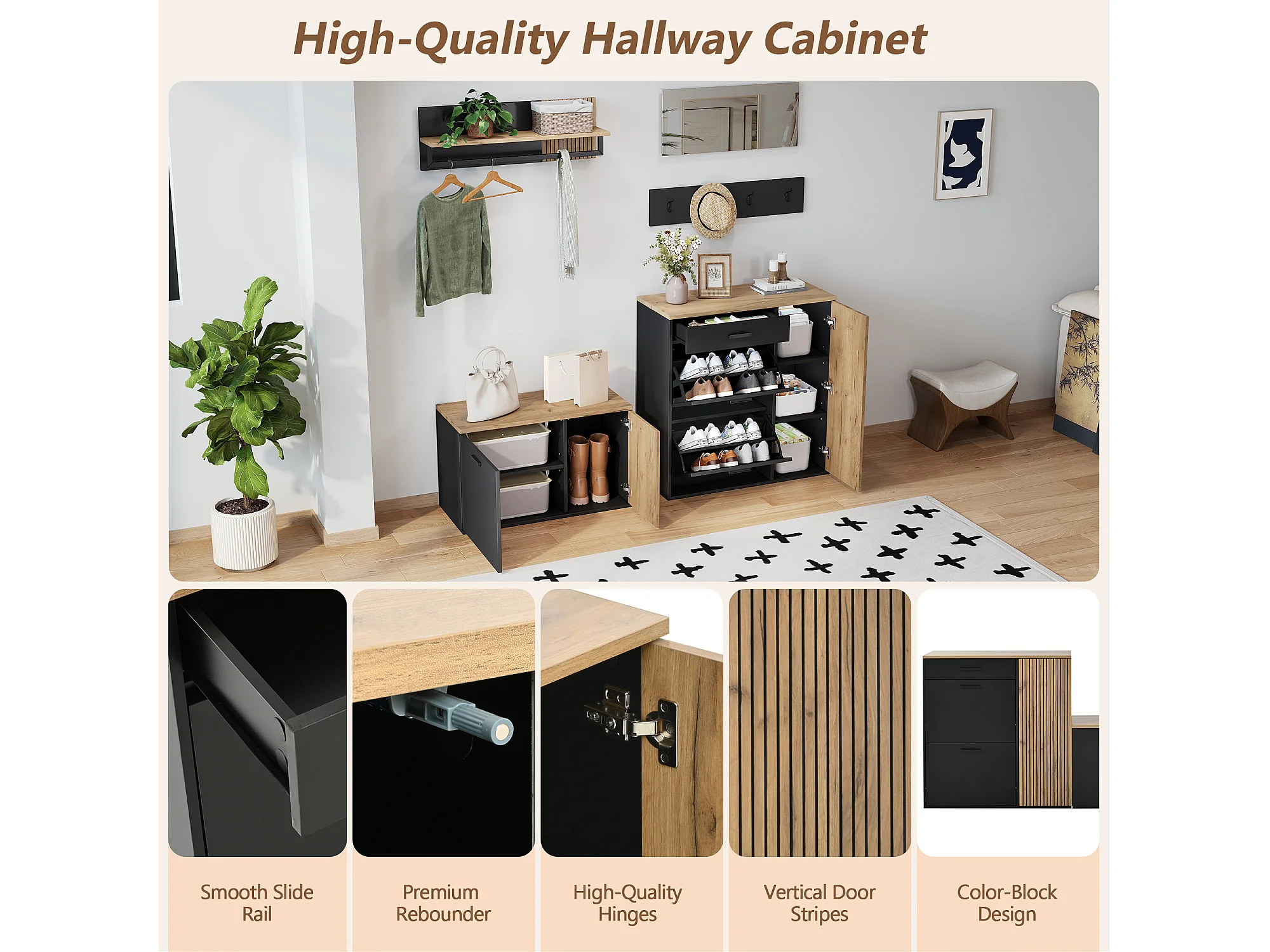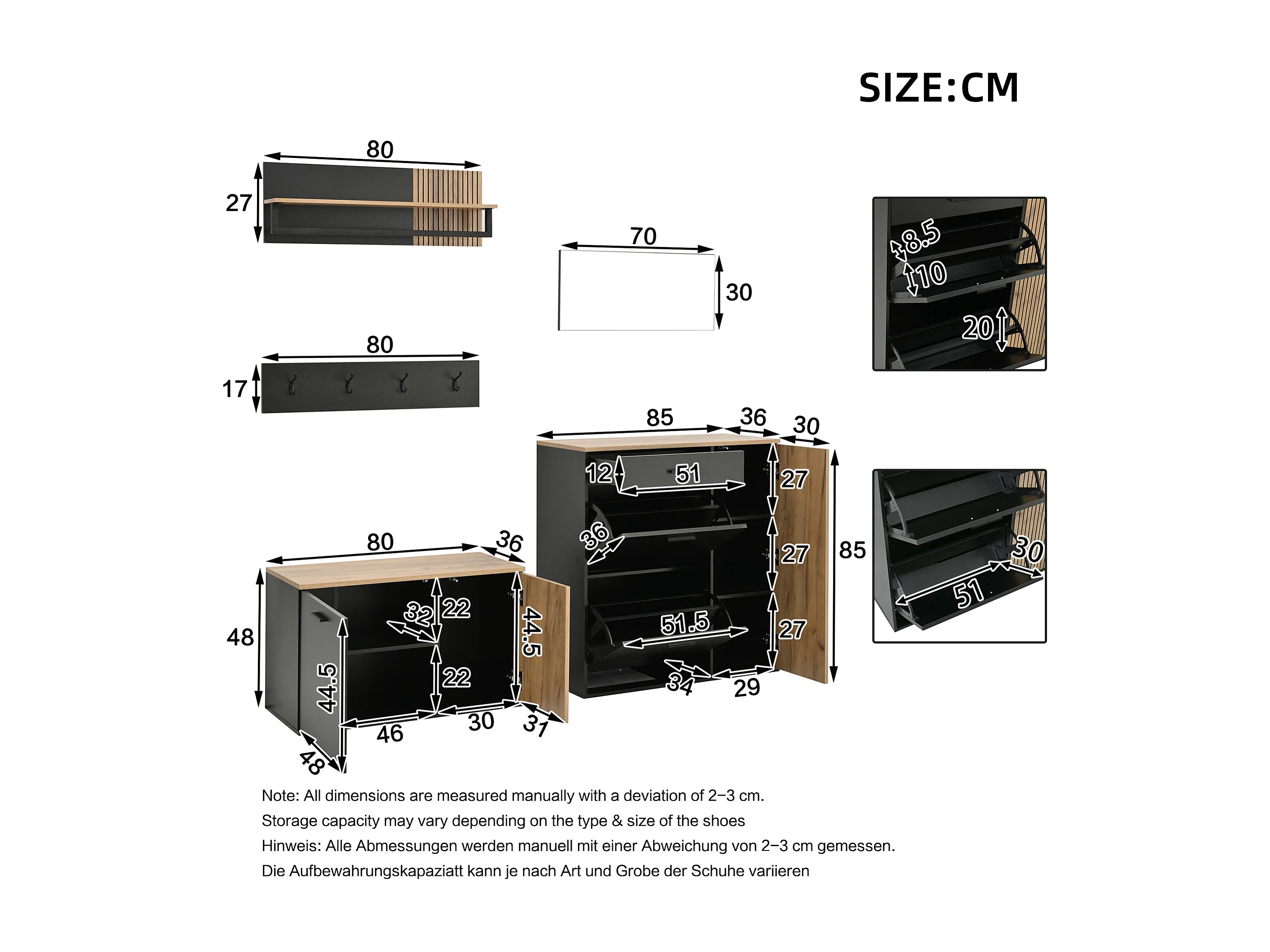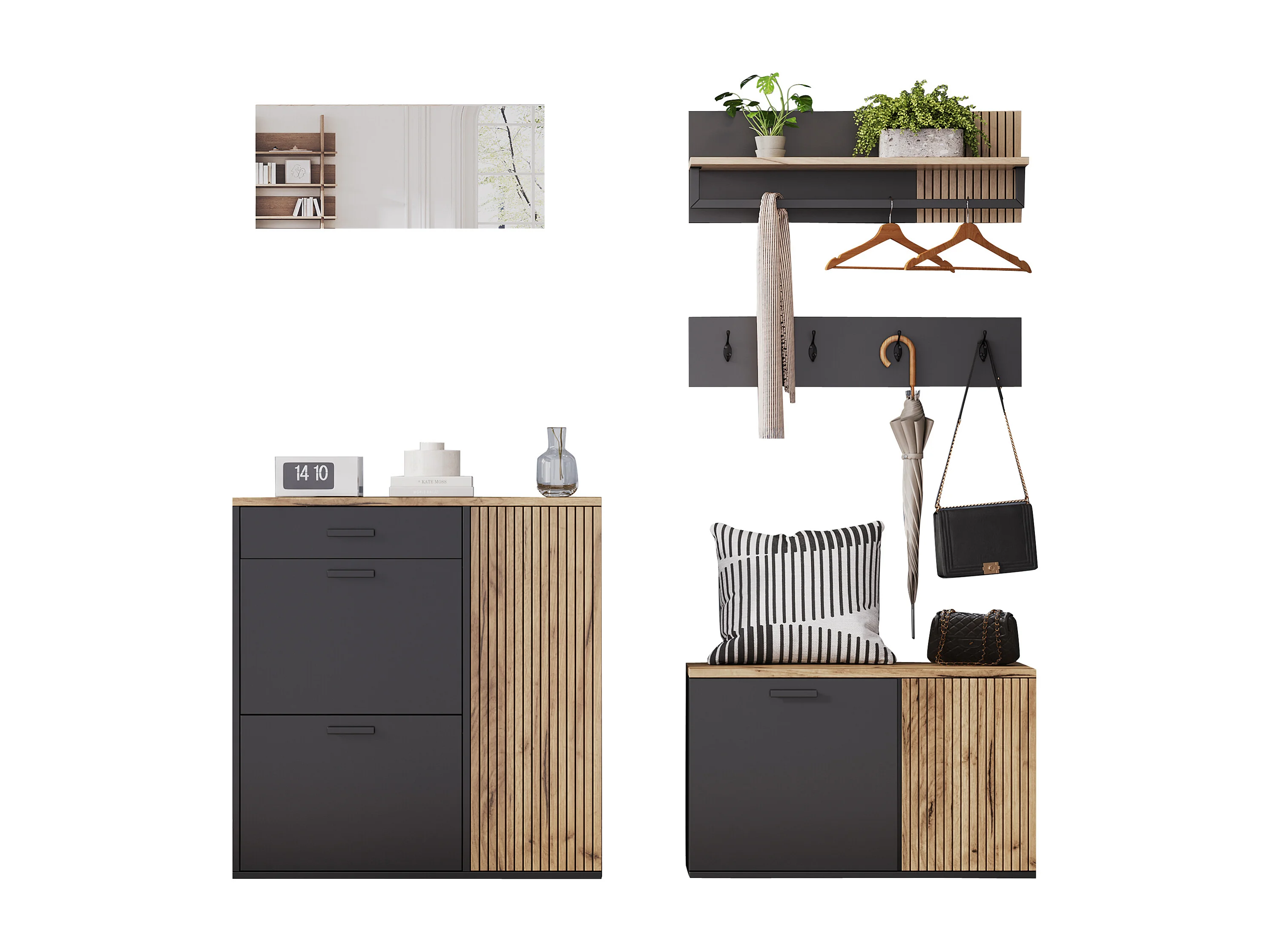 Garderobenset für den Eingangsbereich - 2 Schuhschränke - Kleiderstange und 4 Haken - Spiegel - Natur + Schwarz