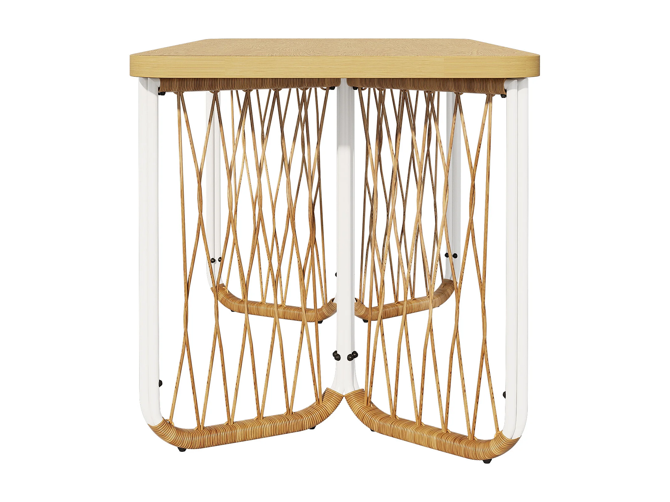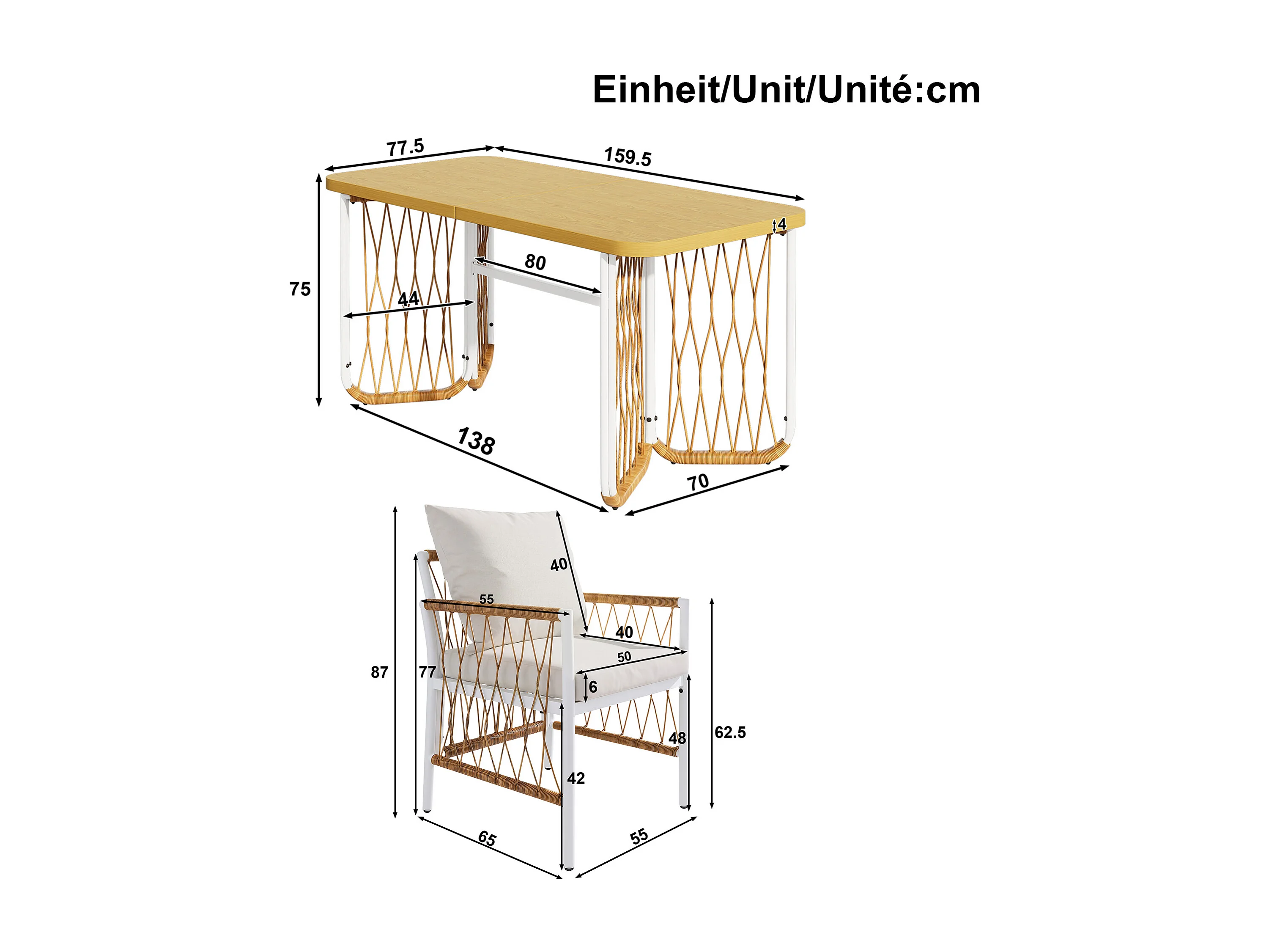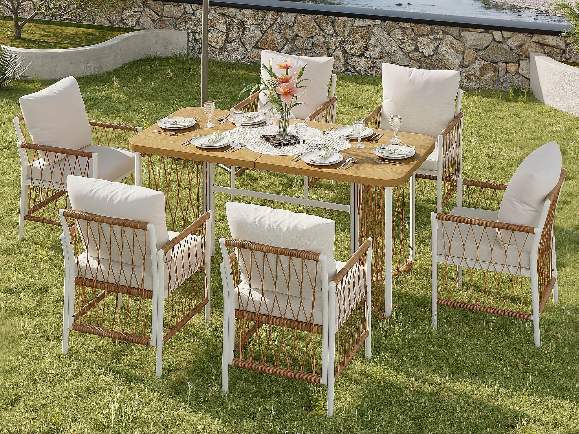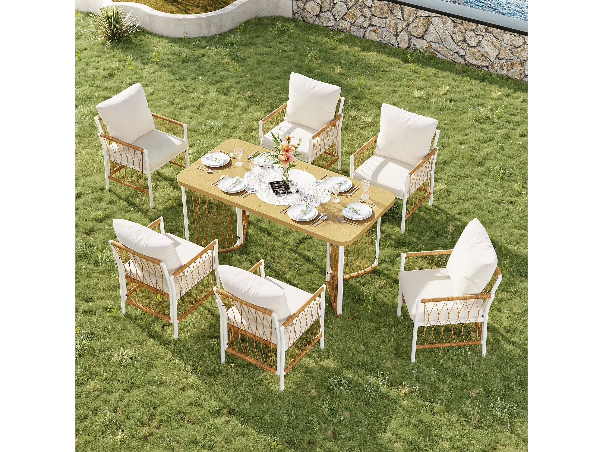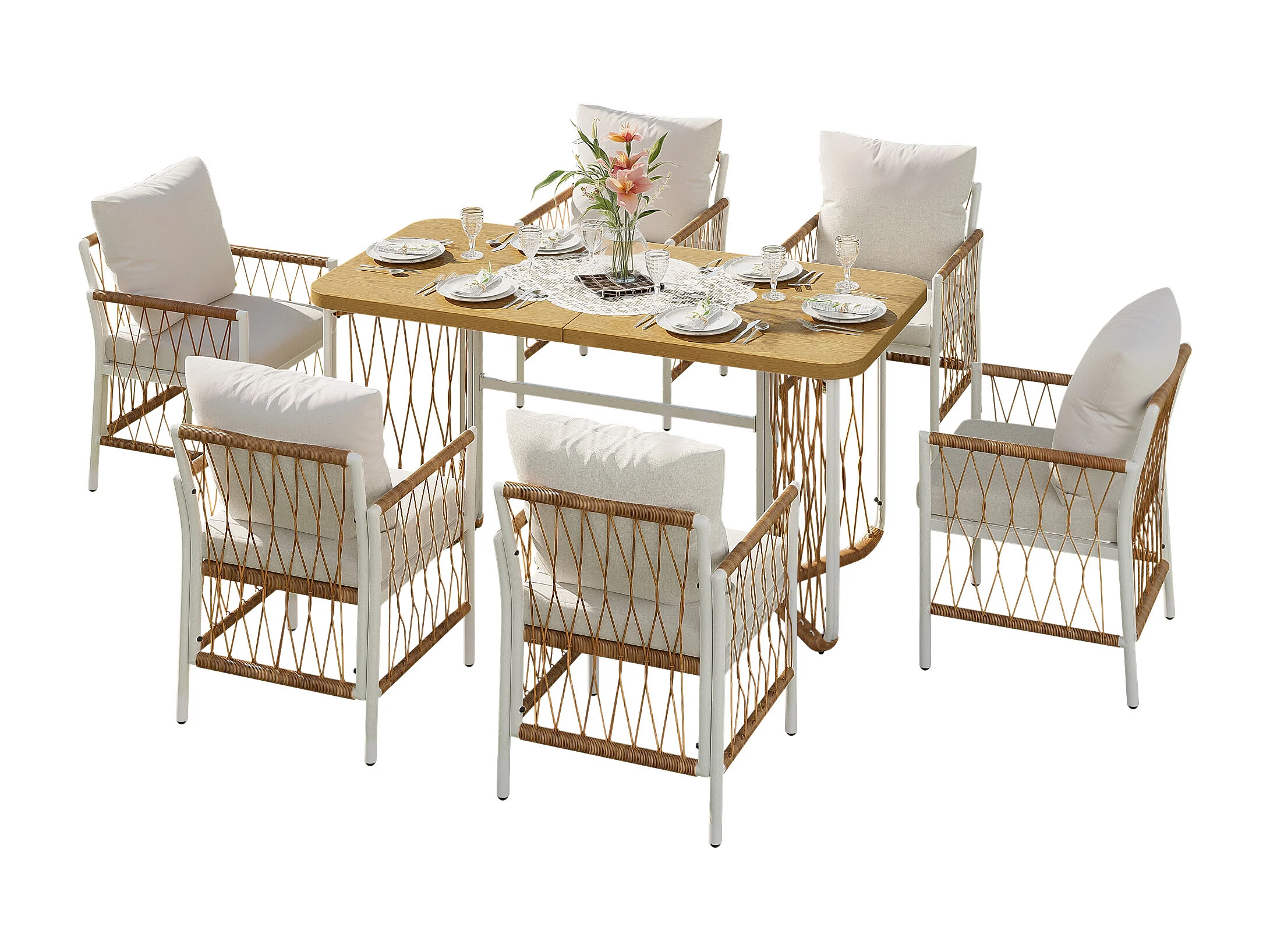 Garten-Esszimmer-Set für 6 Personen, Esstisch aus Eisen, Gestell aus verzinktem Eisen, 6 Rattan-Stühle, Beige