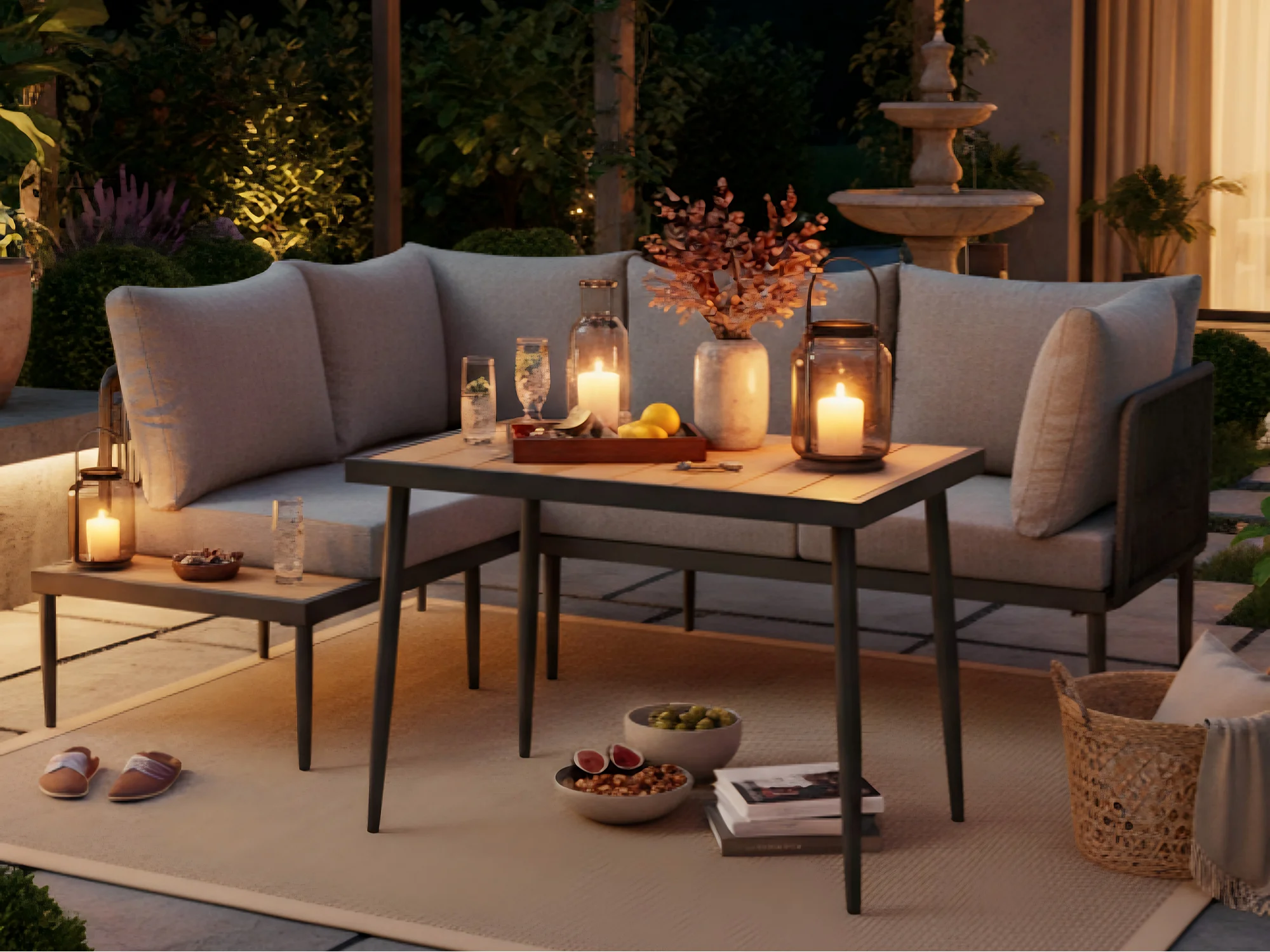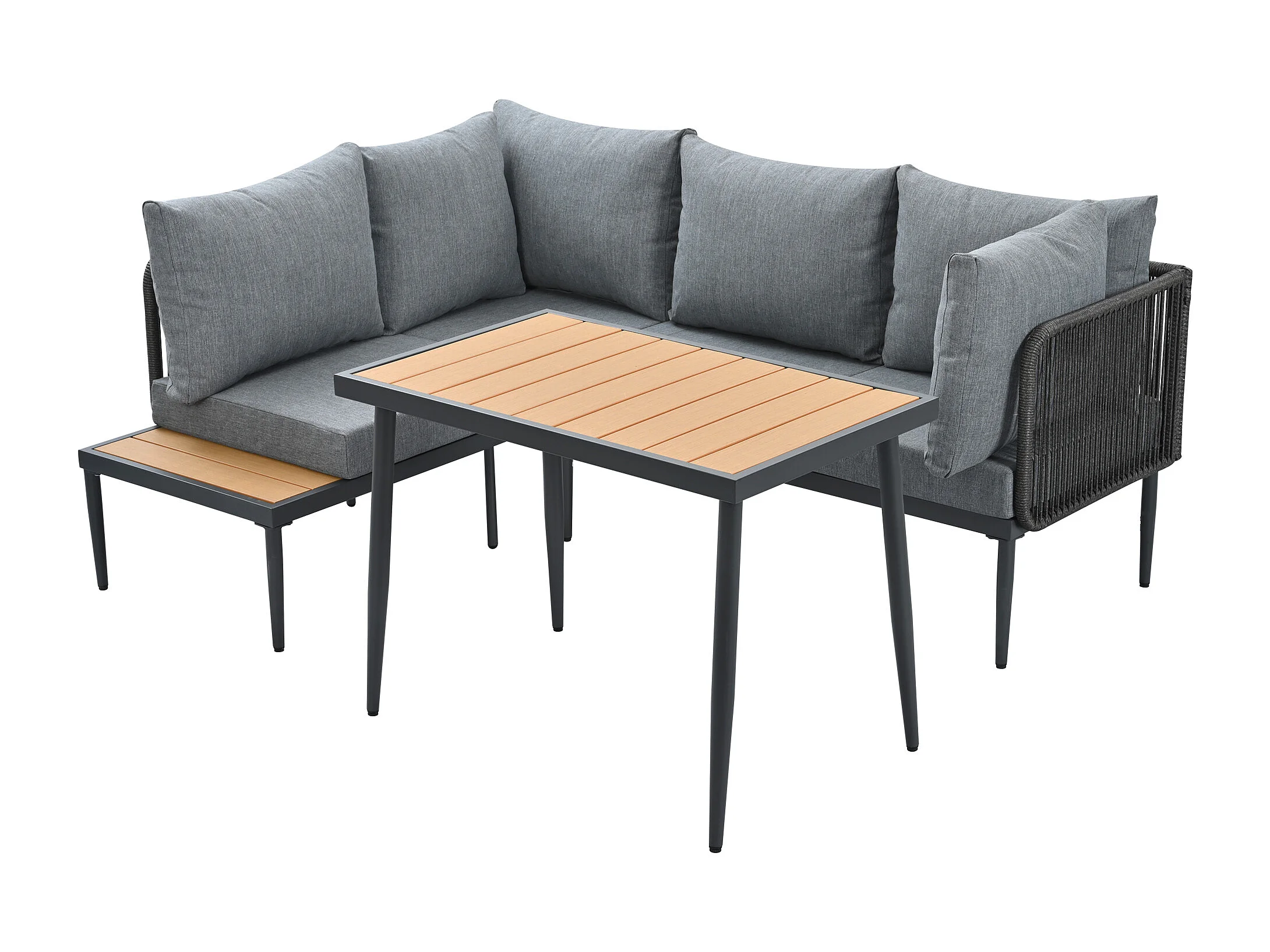 Garten-Salon, 4 Plätze - aus leichtem galvanisiertem Eisen - Platte aus Kunststoff-Holz - Ecksofa + Esstisch - Grau