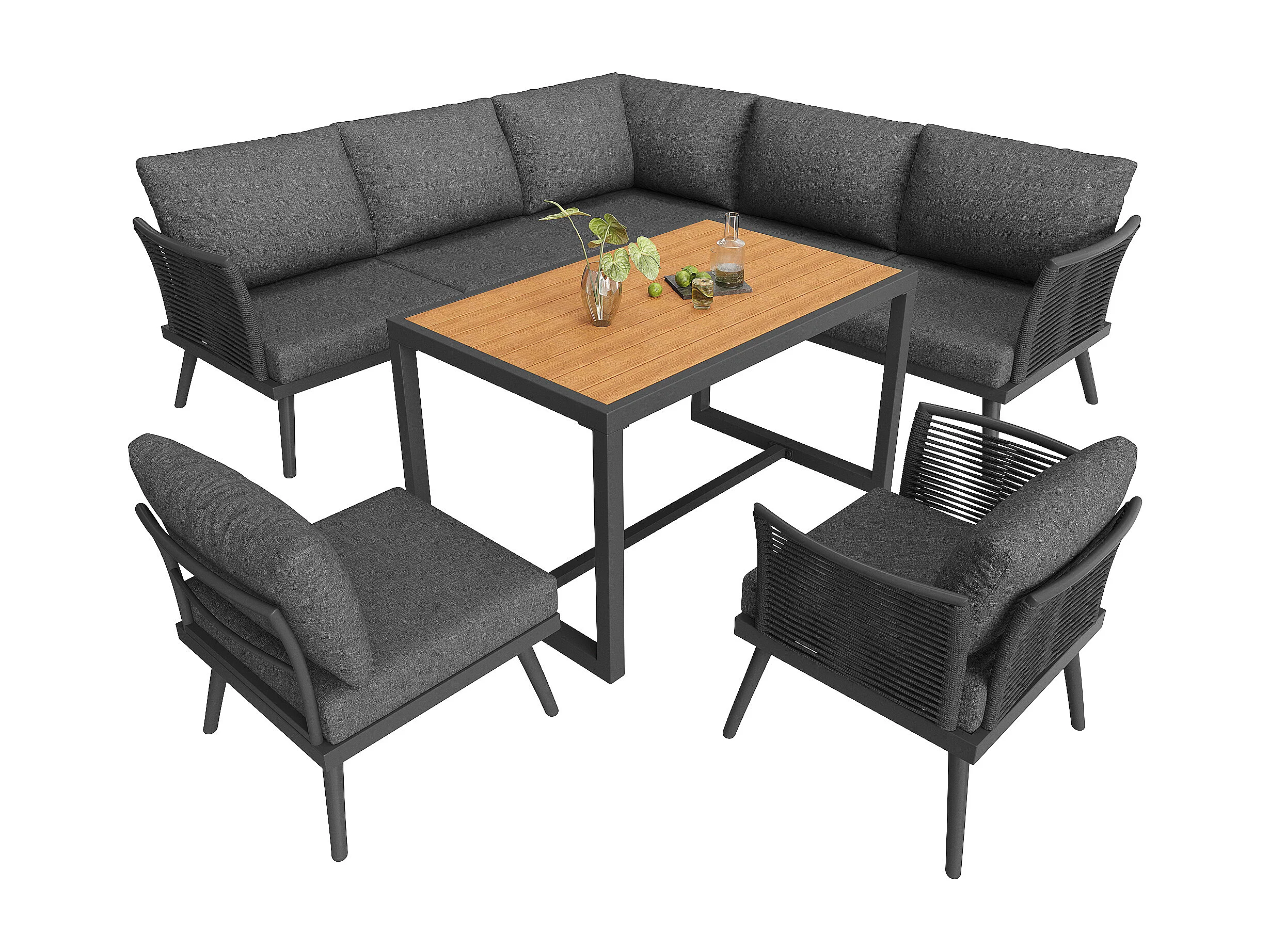 Garten-Salon, Möbelset, für 6-7 Personen - Ecksofa - 2 Sessel - Tisch - Tauwerk - aus verzinktem Eisen, Grau