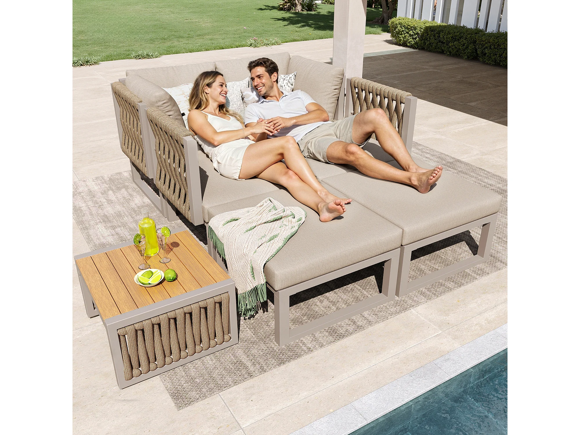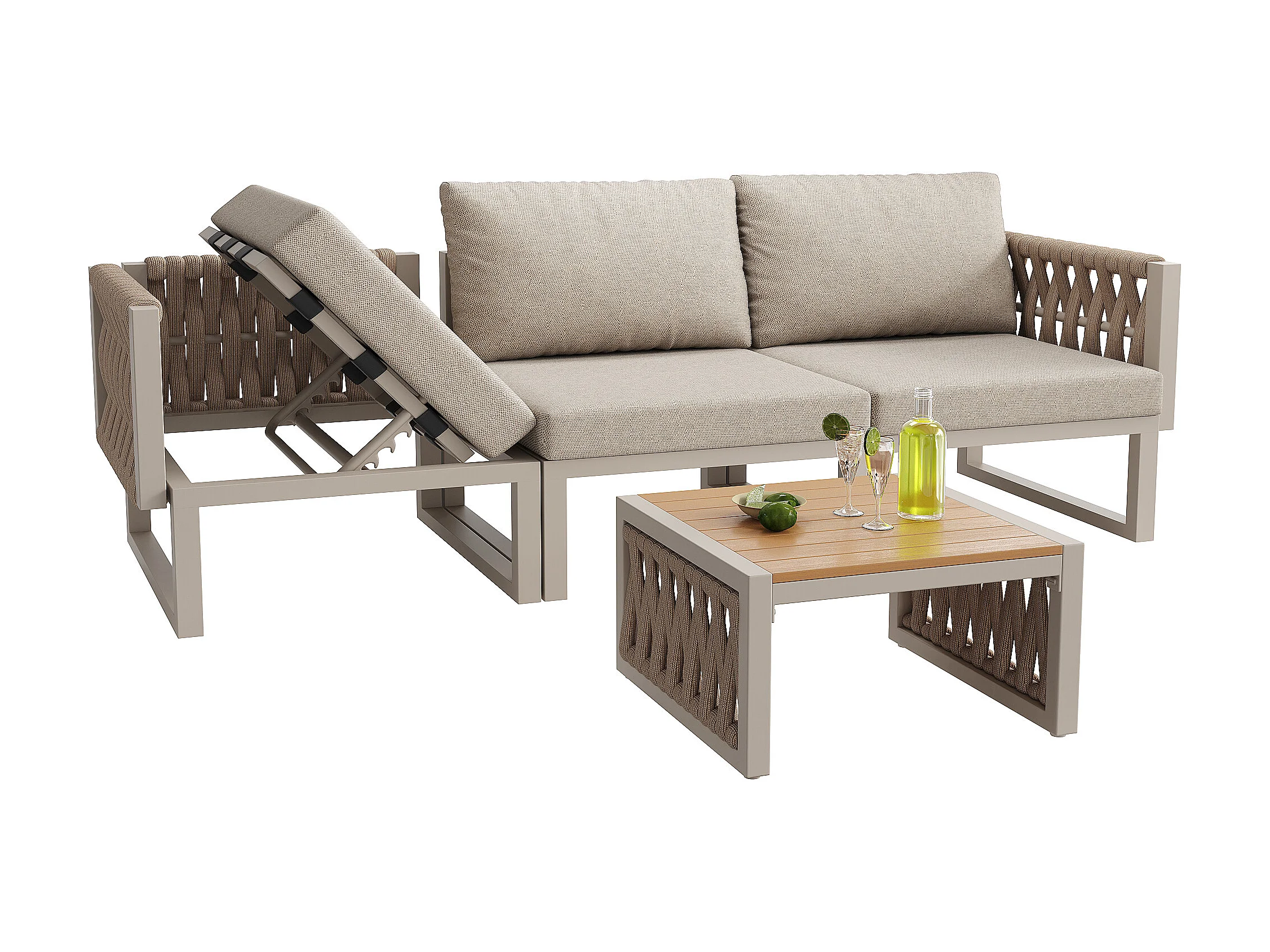 Garten-Salon, Möbelset, Tauwerk, für 5 Personen - Ecksofa - Beistelltisch und Holzplatte - aus verzinktem Eisen, Beige