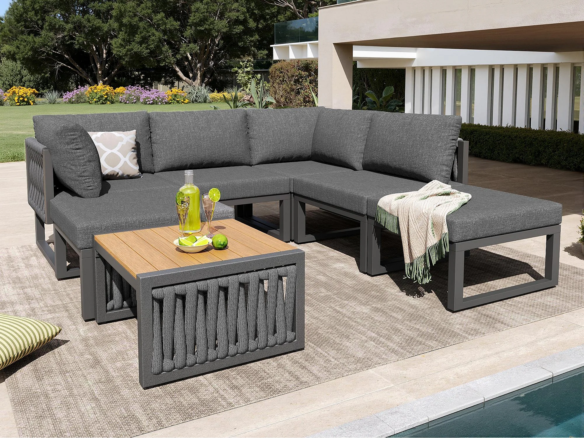 Garten-Salon, Möbelset, Tauwerk, für 5 Personen - Ecksofa - Beistelltisch und Holzplatte - aus verzinktem Eisen, Grau