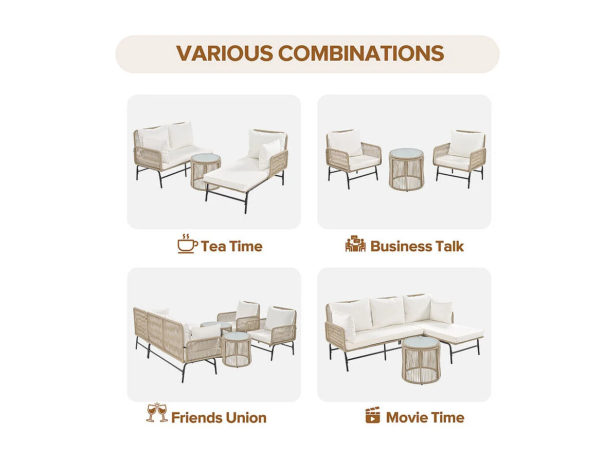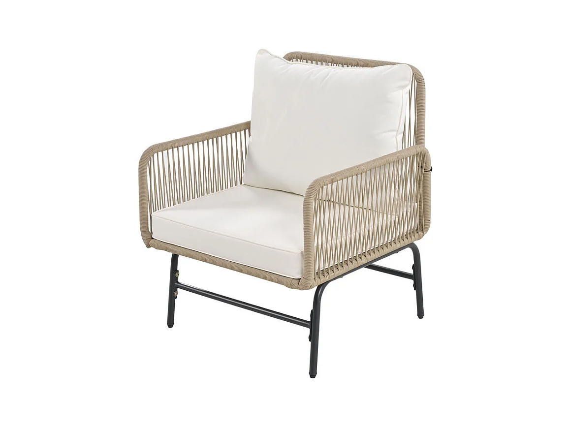 Garten-Set aus Eisen und Seil: 2 Sofas, 2 Sessel und 2 Beistelltische - Mit Kissen - Beige