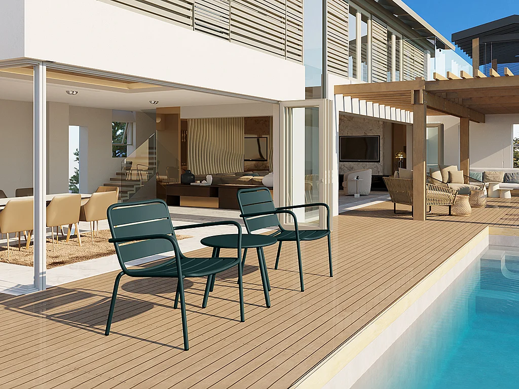 Garten-Sitzgruppe: 2 niedrige, stapelbare Sessel + Beistelltisch - Metall - Tannengrün - MIRMANDE von MYLIA