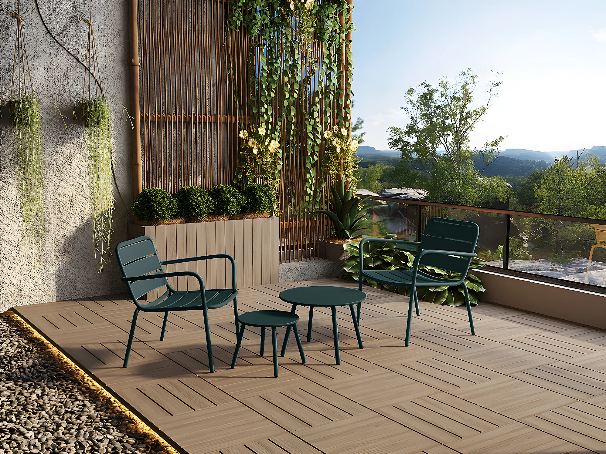 Garten-Sitzgruppe: 2 niedrige, stapelbare Sessel + Beistelltische - Metall - Tannengrün - MIRMANDE von MYLIA