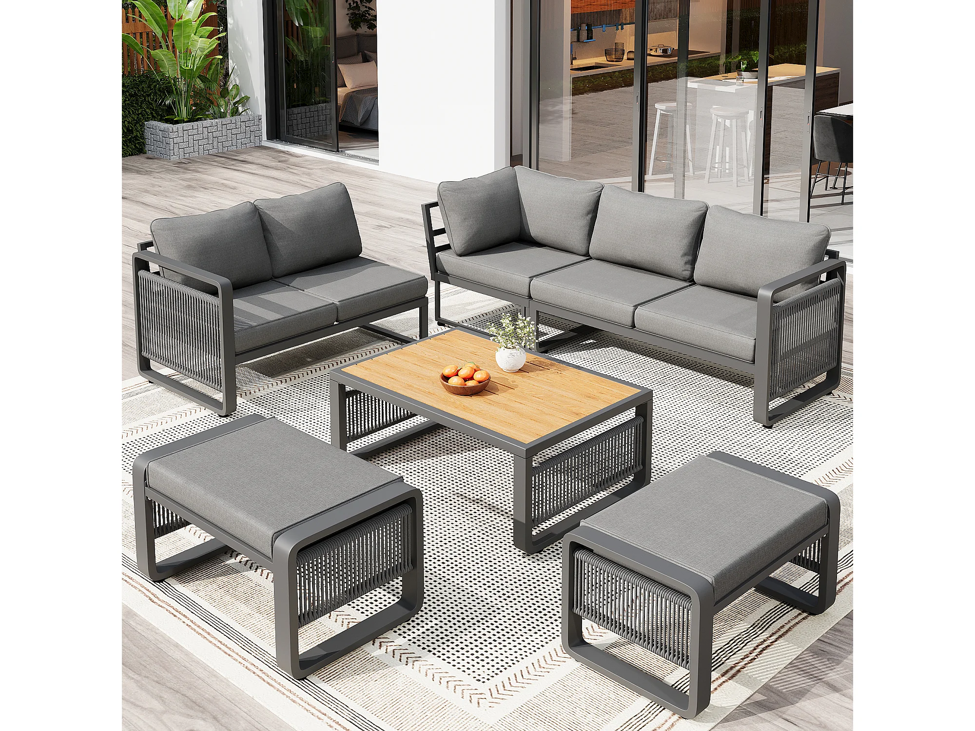 Gartenmöbelset für 6-7 Personen – bestehend aus Sofa, Tisch, 2 Hockern sowie Sitz- und Rückenkissen – Metall – grau