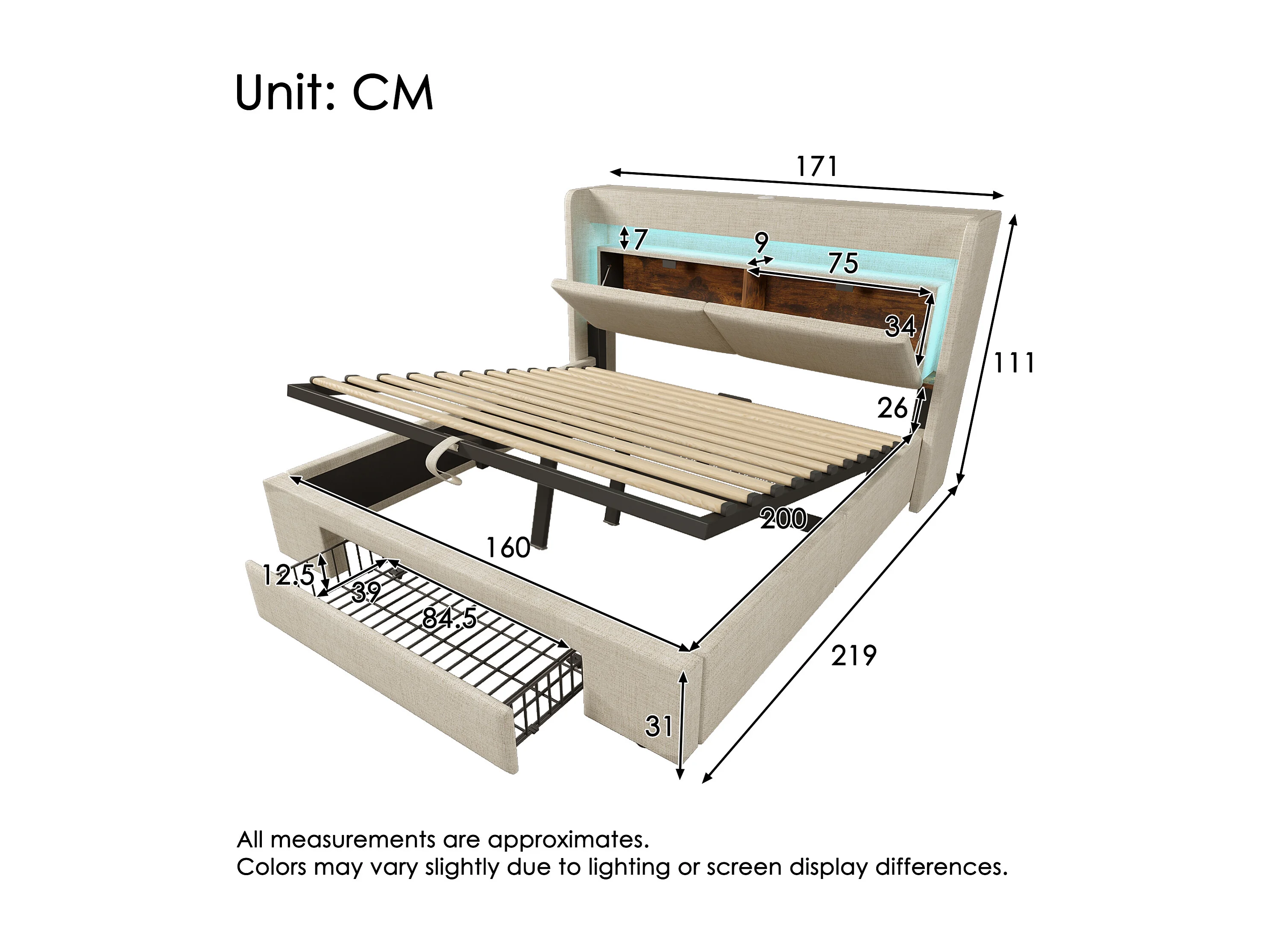 Gepolstertes Bett mit Stauraum 160x200cm - mit LED und USB-Anschluss - mit 1 Schublade - Kopfteil mit Stauraum - Leinen - Beige​ (ohne Matratze)