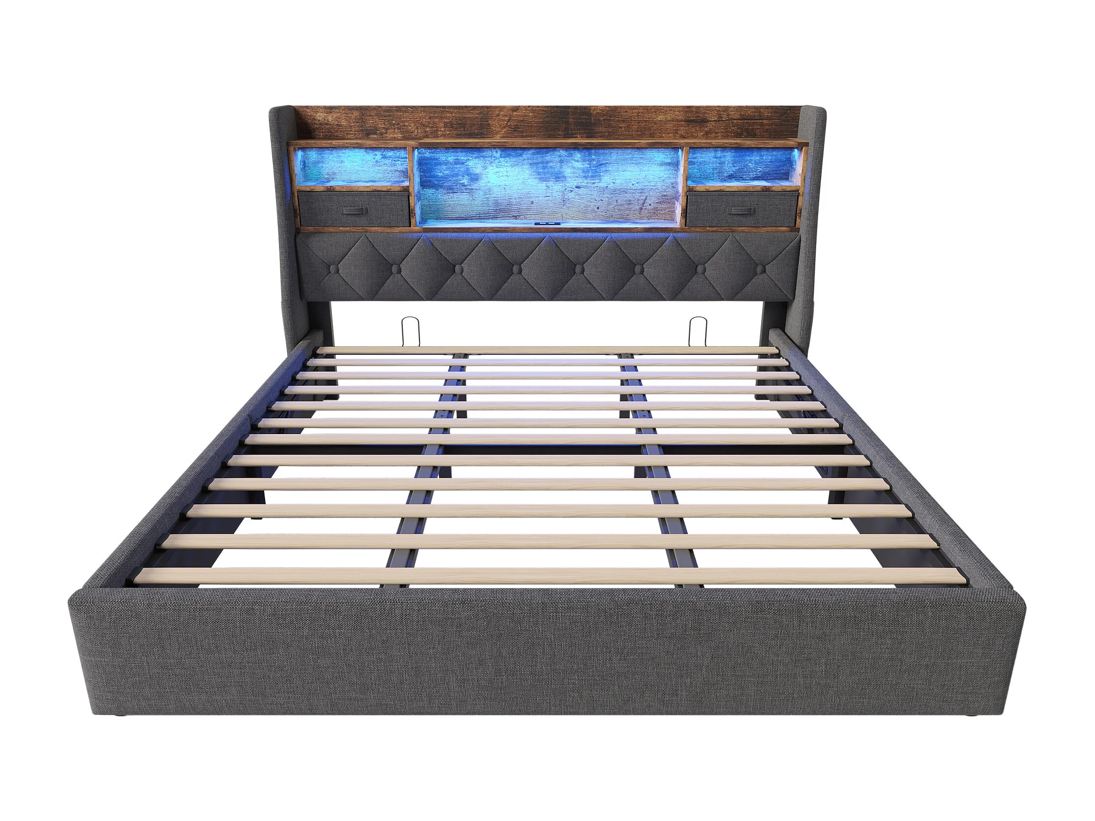 Gepolstertes Bett mit Stauraum 180x200cm - mit LED - mit 4 Ladeports (USB/Type-C) - Kopfteil mit Staufach - Leinen - Grau (ohne Matratze)