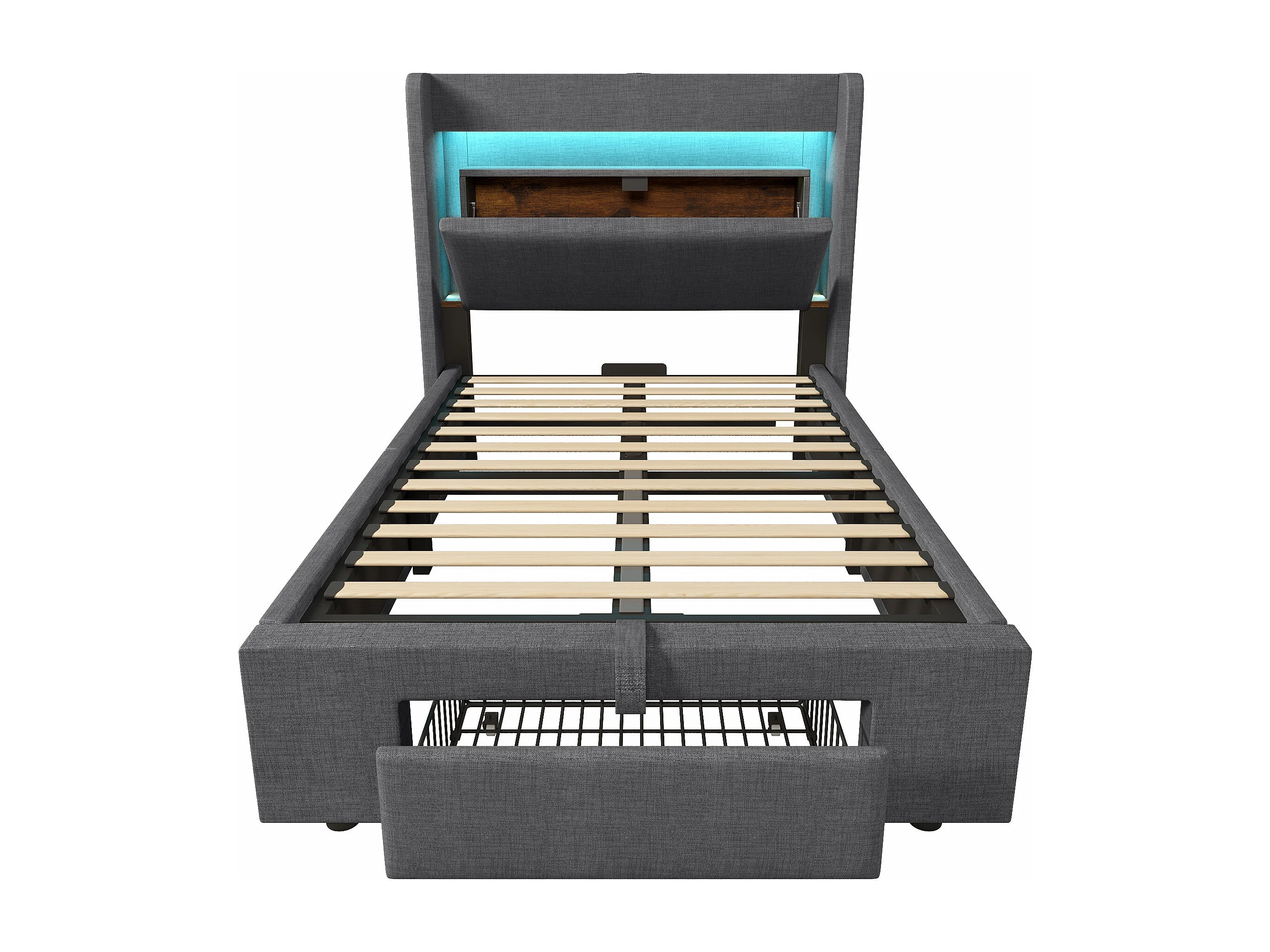 Gepolstertes Bett mit Stauraum 90x200cm - mit LED und USB-Anschluss - mit 1 Schublade - Kopfteil mit Stauraum - Leinen - Grau​ (ohne Matratze)