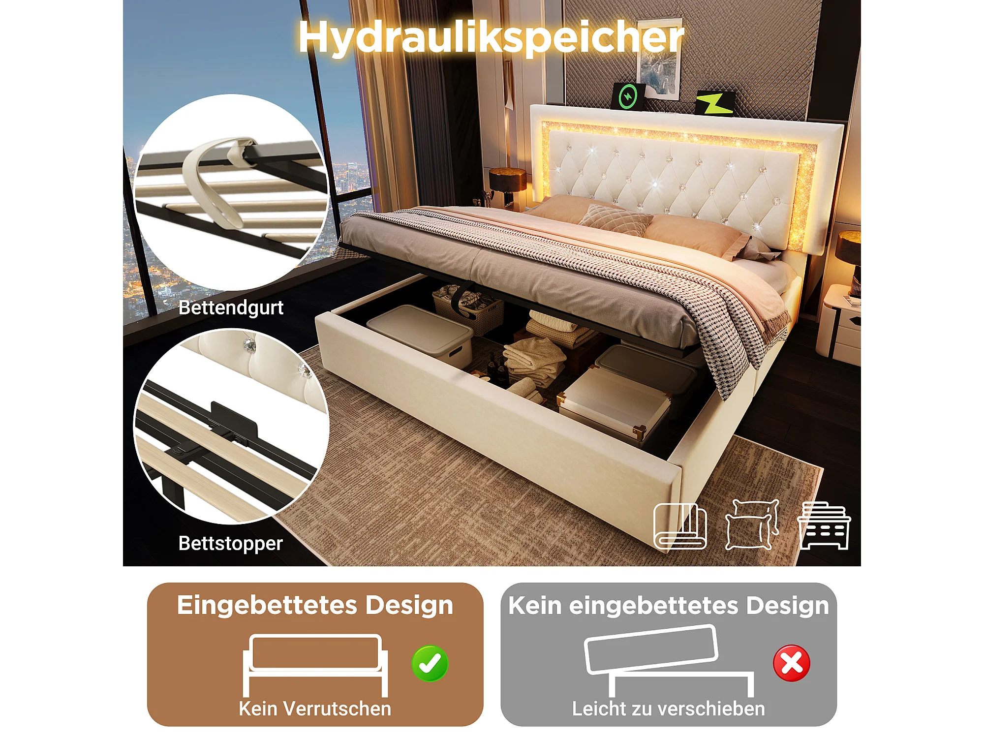 Hydraulisches Stauraumbett – 140 x 200 cm – verstellbares Kopfteil mit Stauraum – mit LEDs + USB/Typ-C – Samt – Beige (mit Matratze)