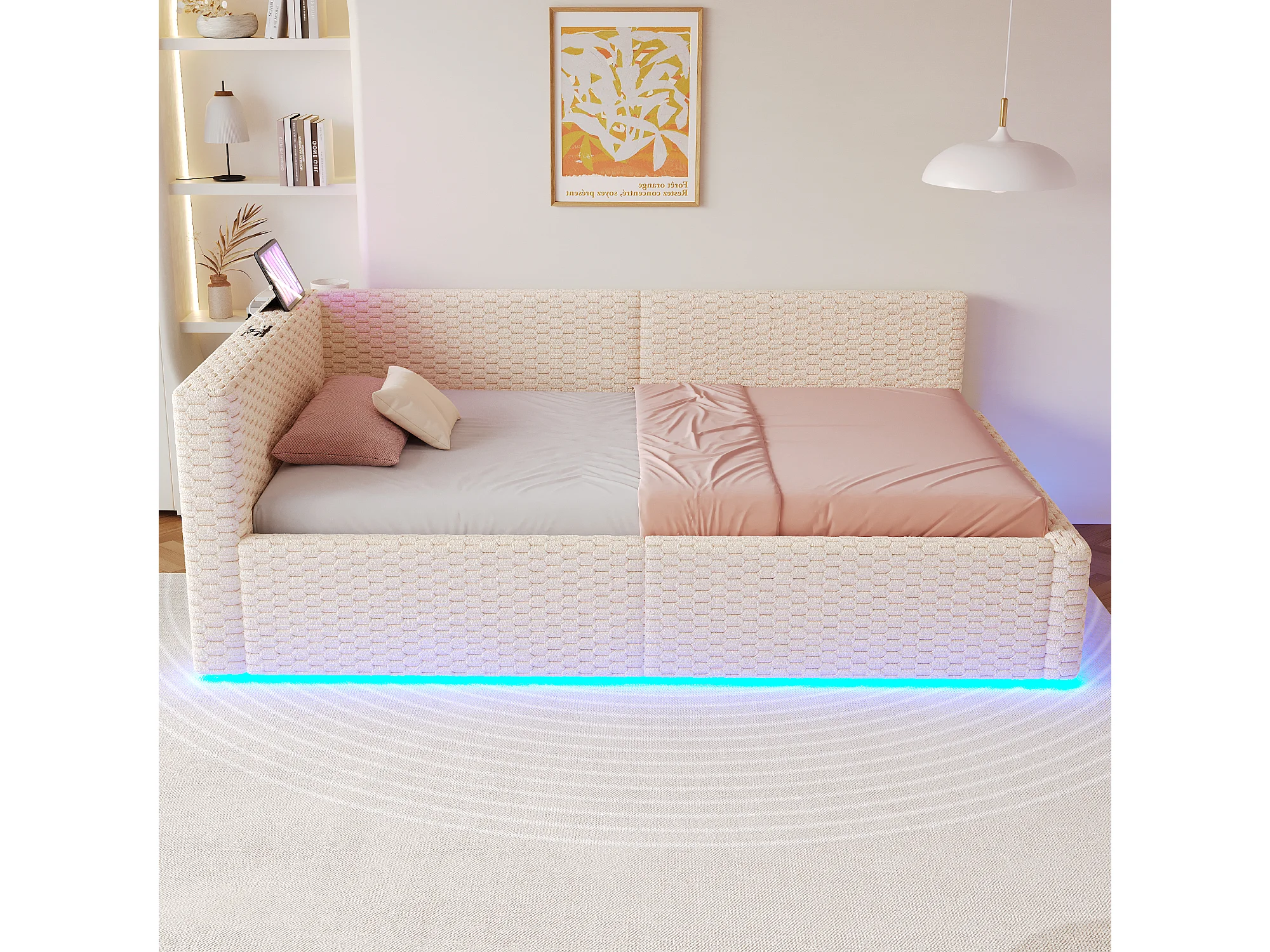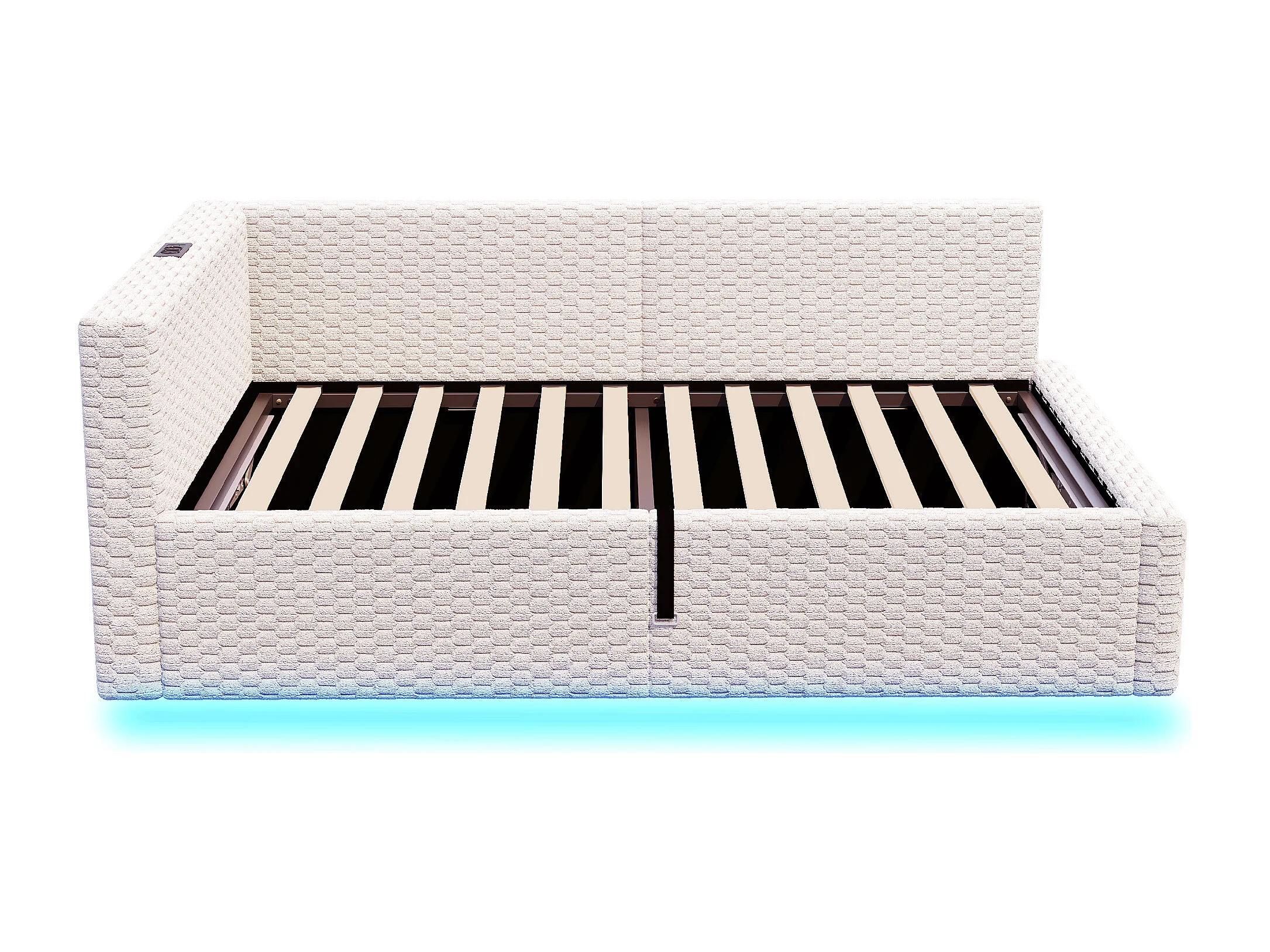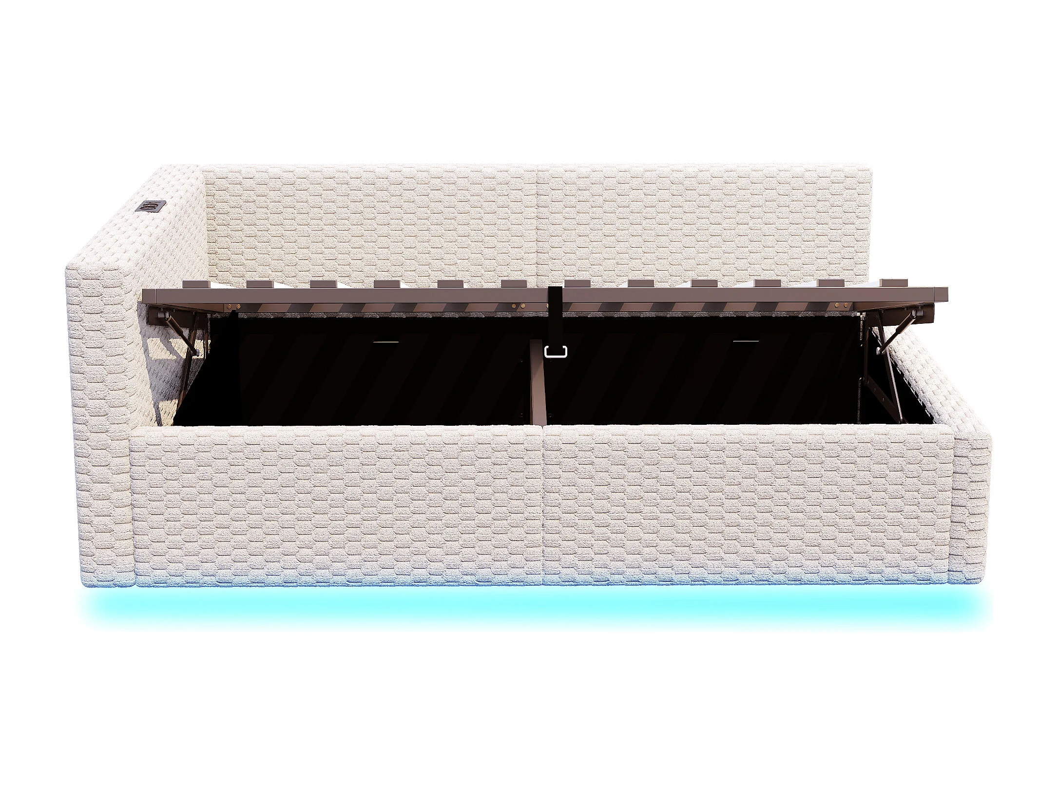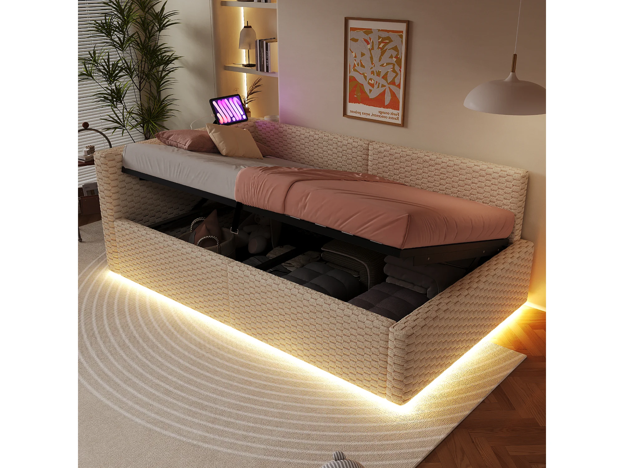 Gepolstertes Kinderbett mit hydraulischem Stauraum – 90 x 200 cm – mit LED-Beleuchtung und 2 USB-Anschlüssen – L-förmiges Kopfteil – Samt – beige