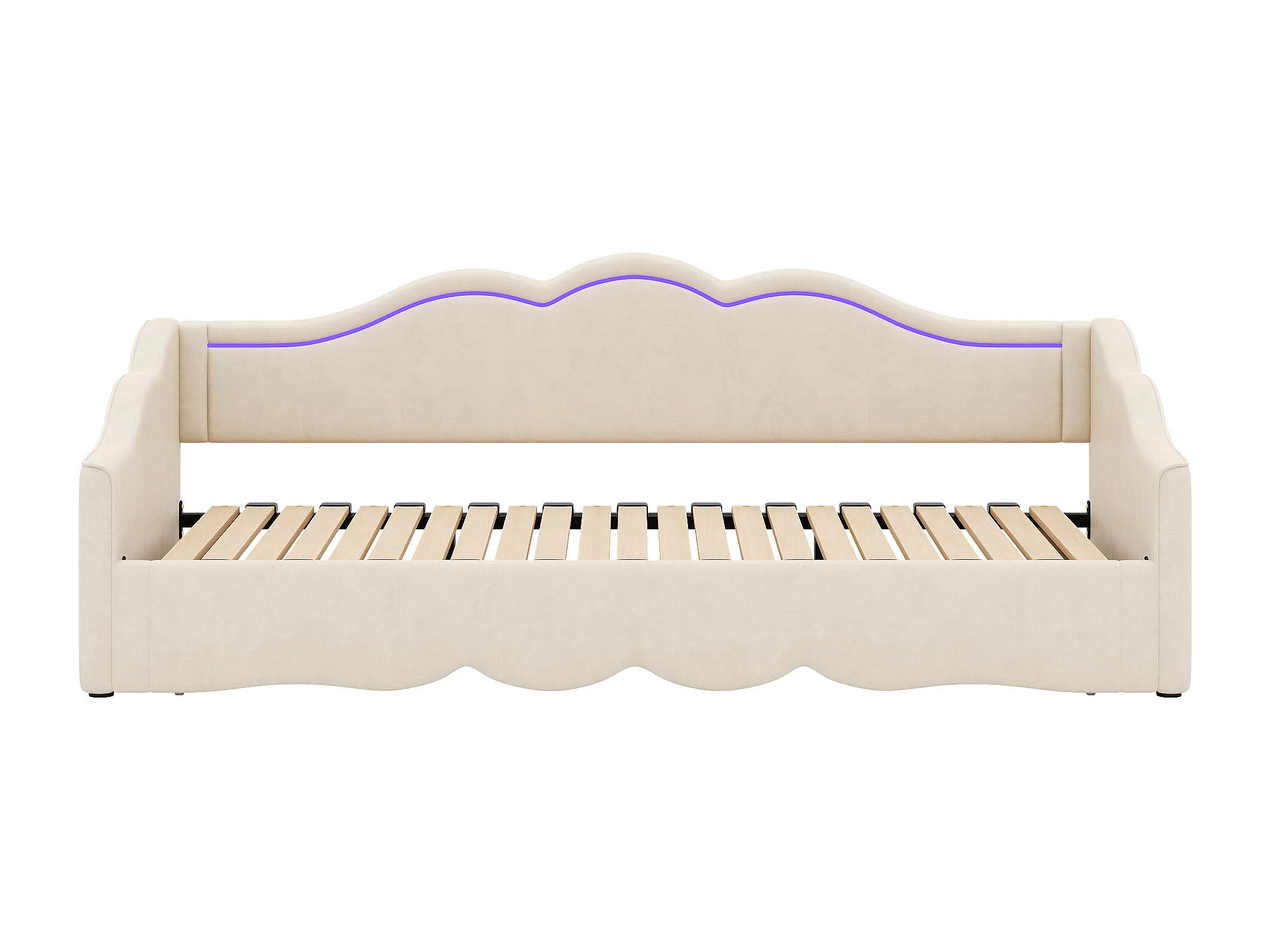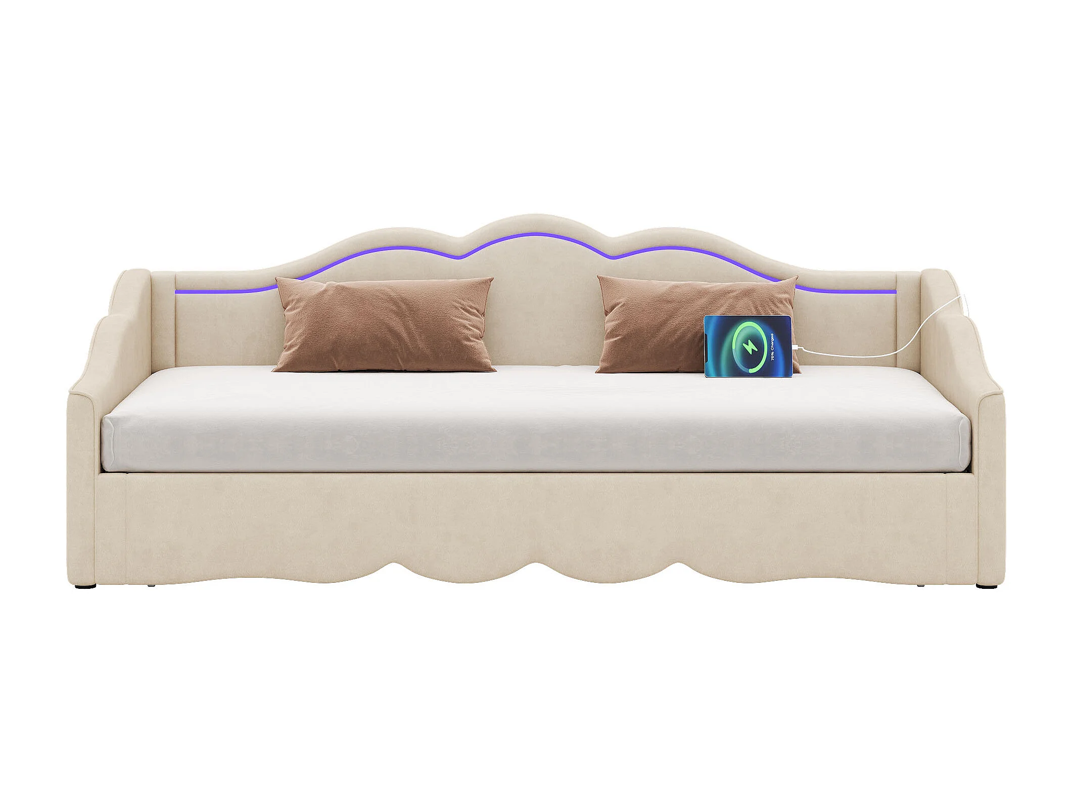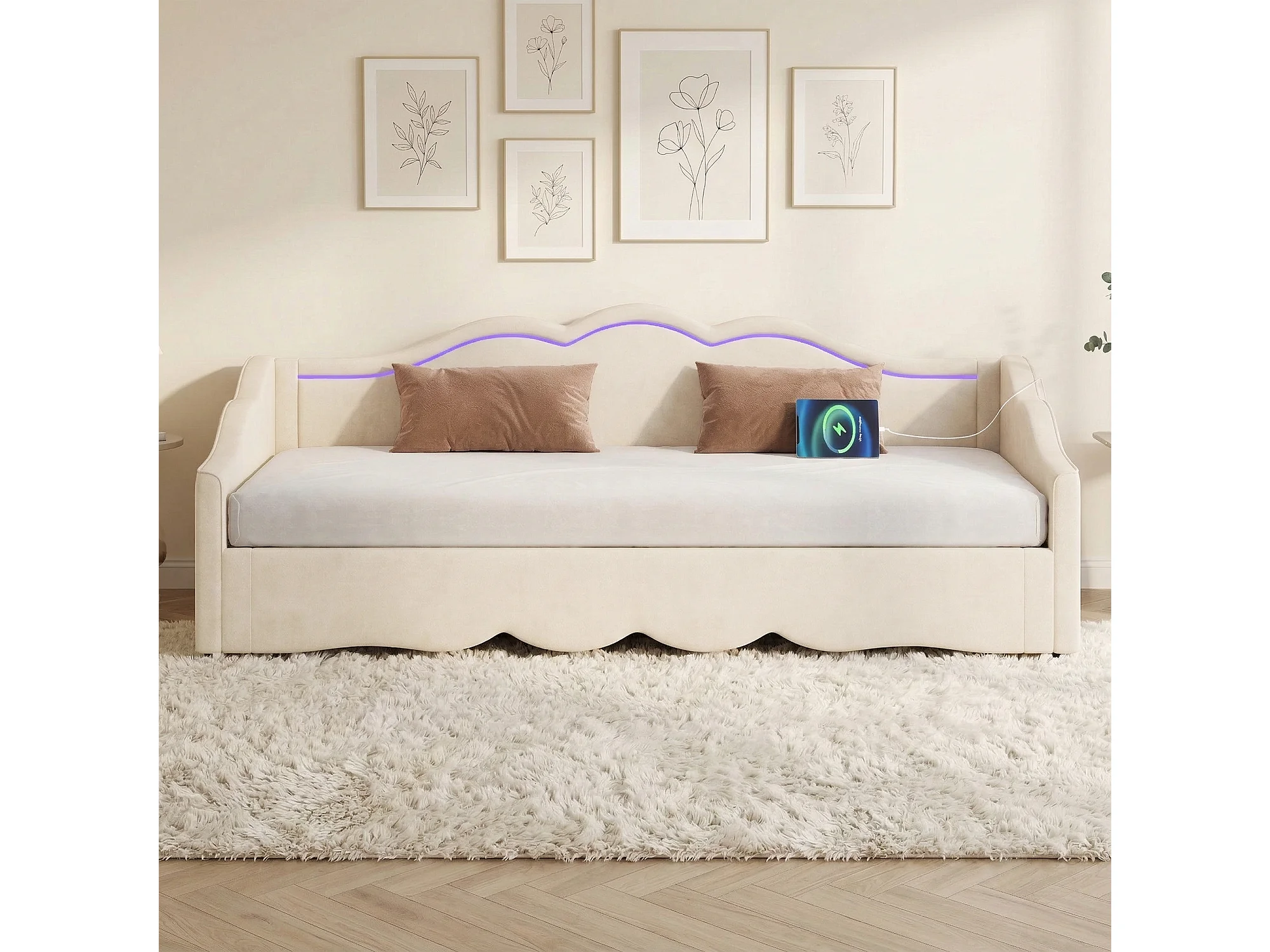 Gepolstertes Schlafsofa 90x200 cm - Mit Gästebett - LED-Beleuchtung und USB-Anschlüsse - Bezug aus Samt - Beige​ (Matratze nicht inbegriffen)