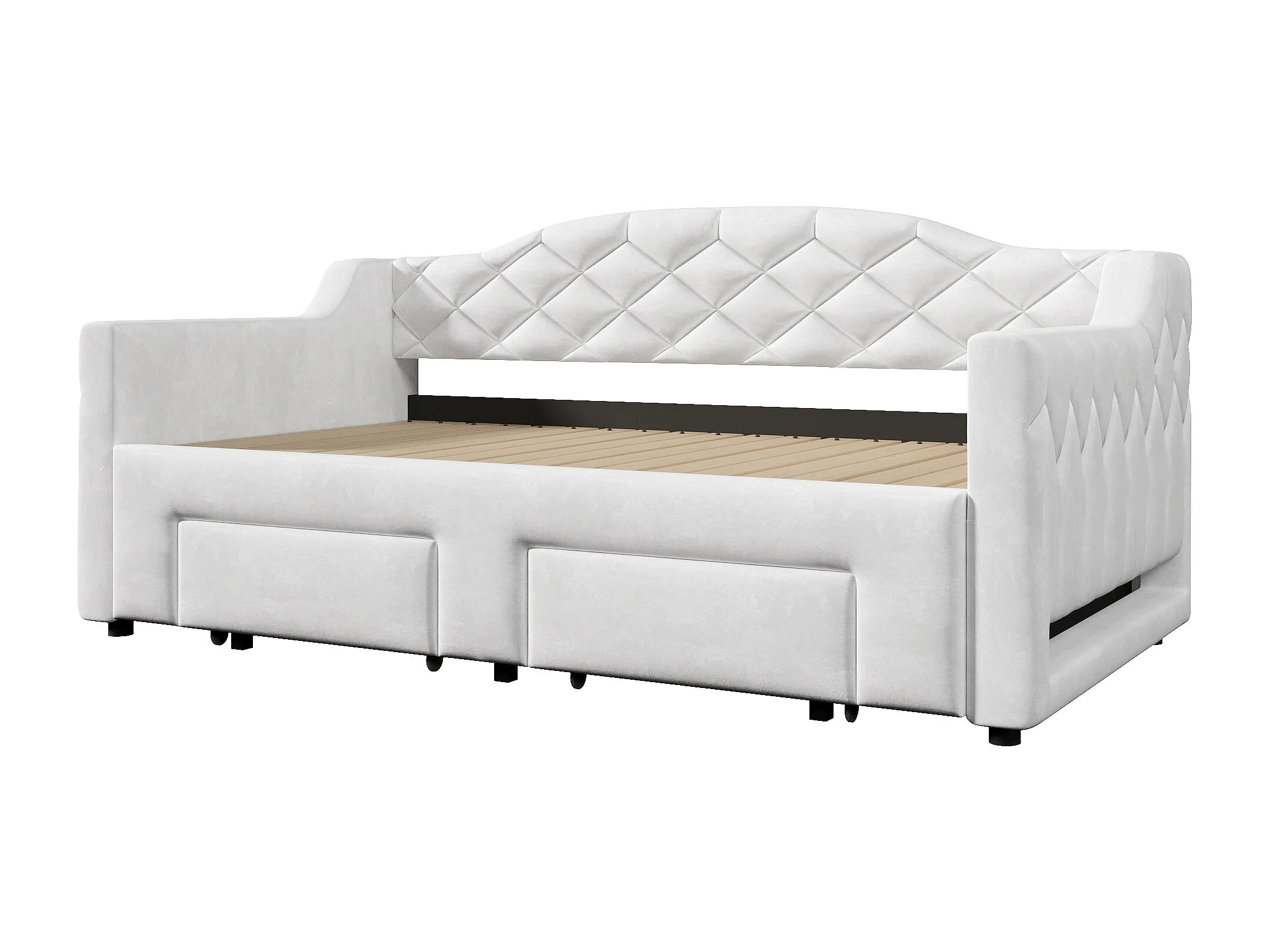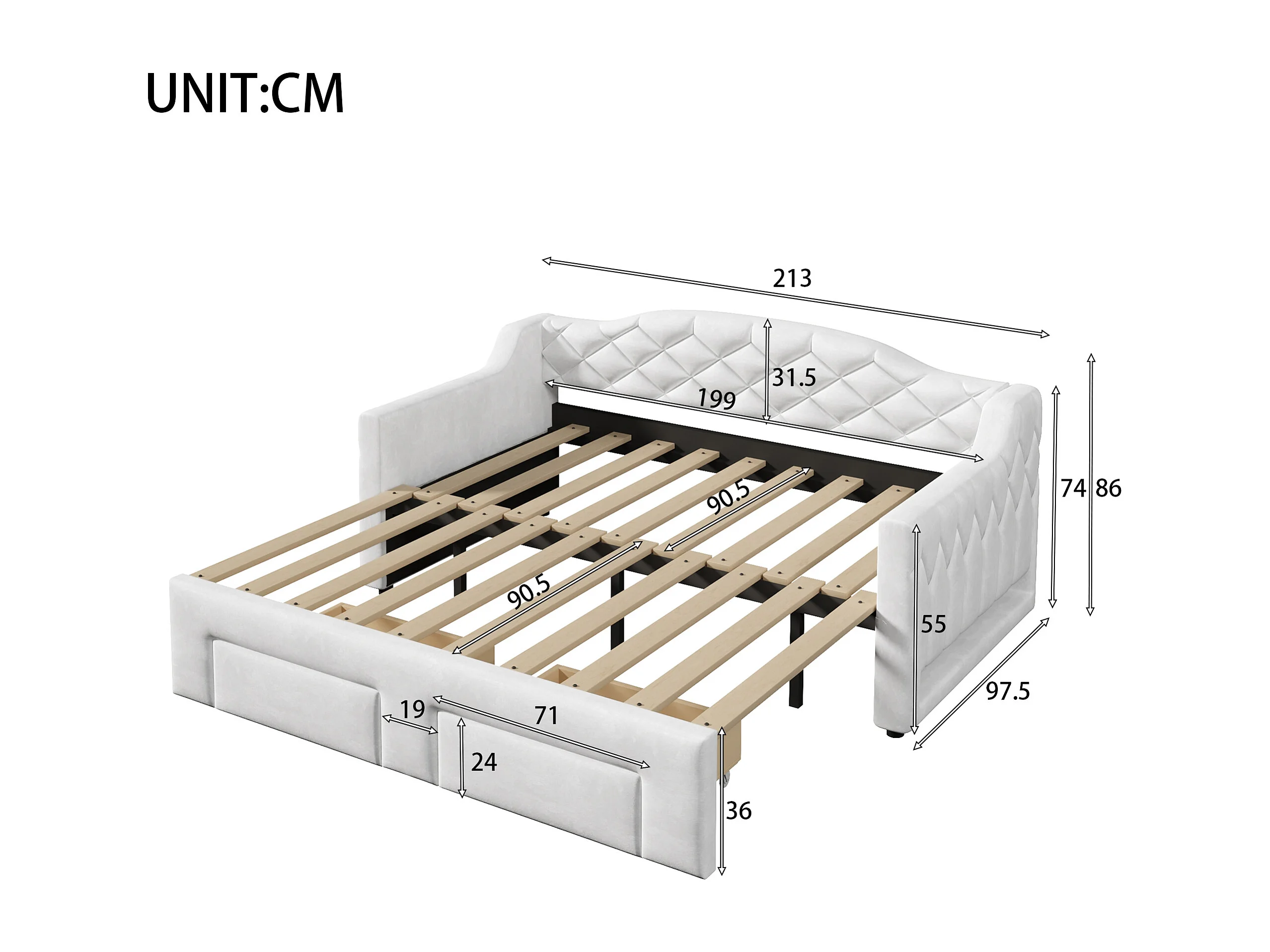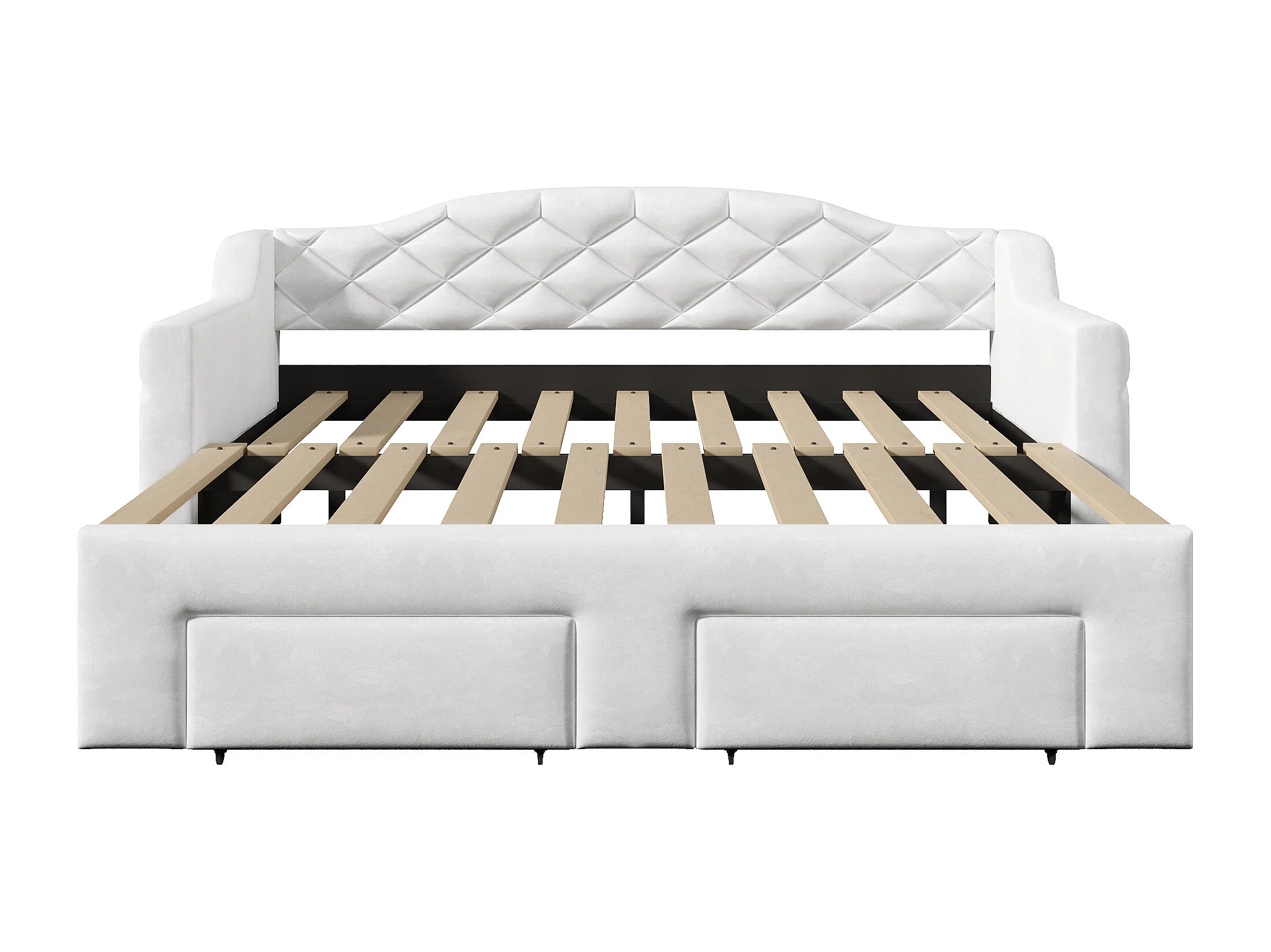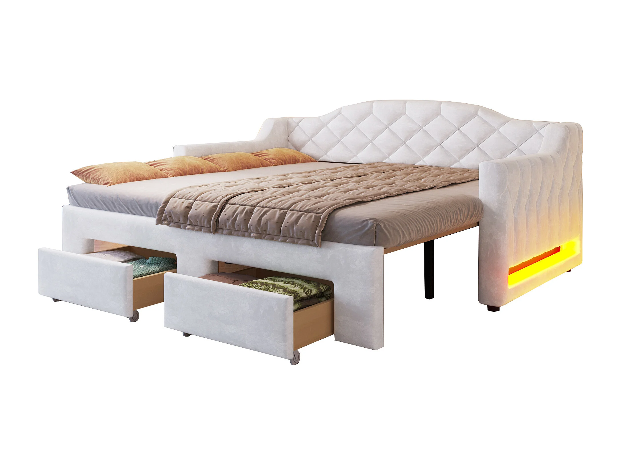 Gepolstertes Schlafsofa 90x200cm - Ausziehbar auf 180x200cm - Gästebett - Mit 2 Schubladen und LED-Beleuchtung - Weiß​ (ohne Matratze)