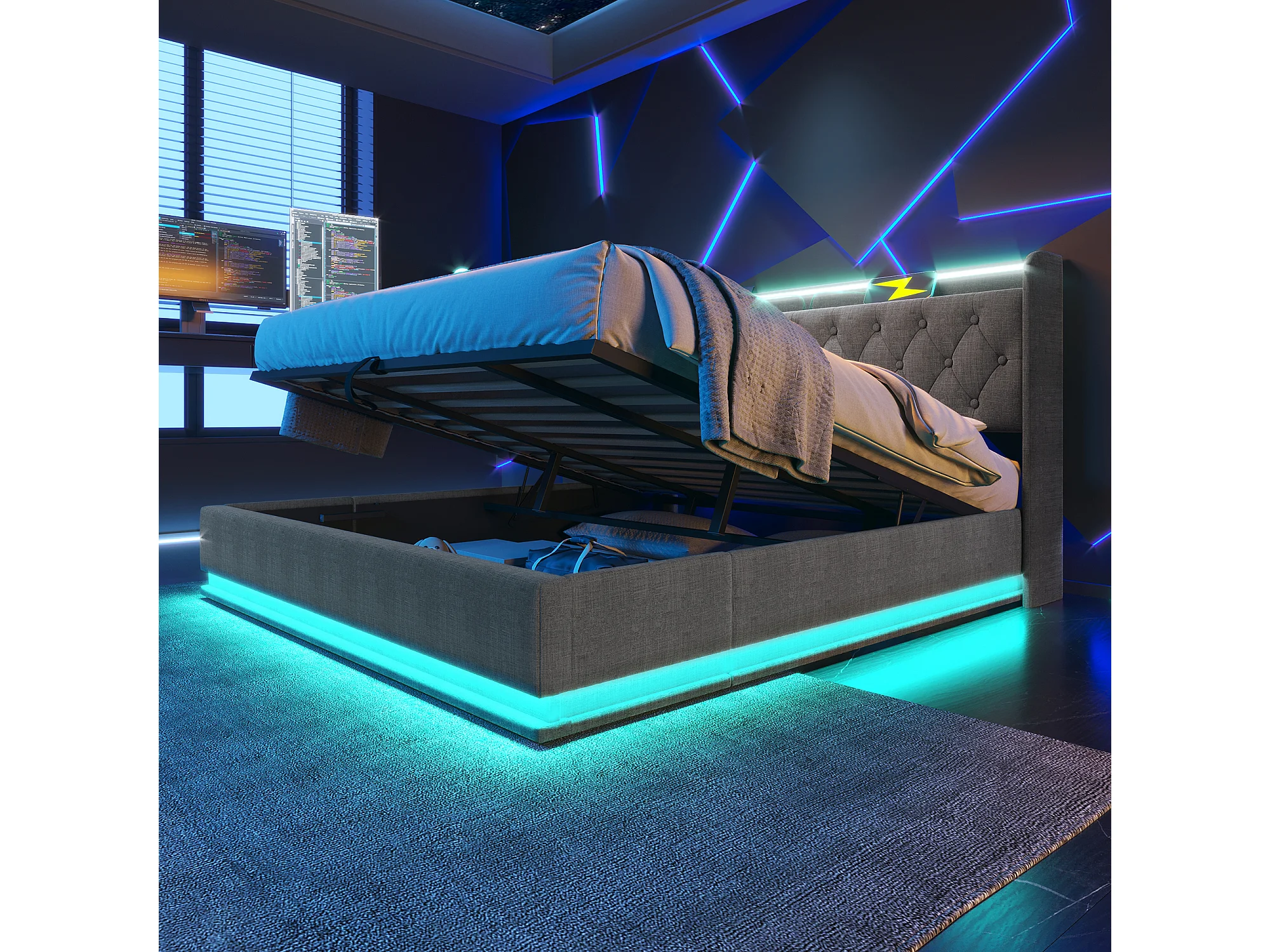 Gepolstertes Stauraumbett – 180 x 200 cm – mit LED-Beleuchtung, hydraulischem Stauraum und USB-Anschluss – Leinenbezug – grau