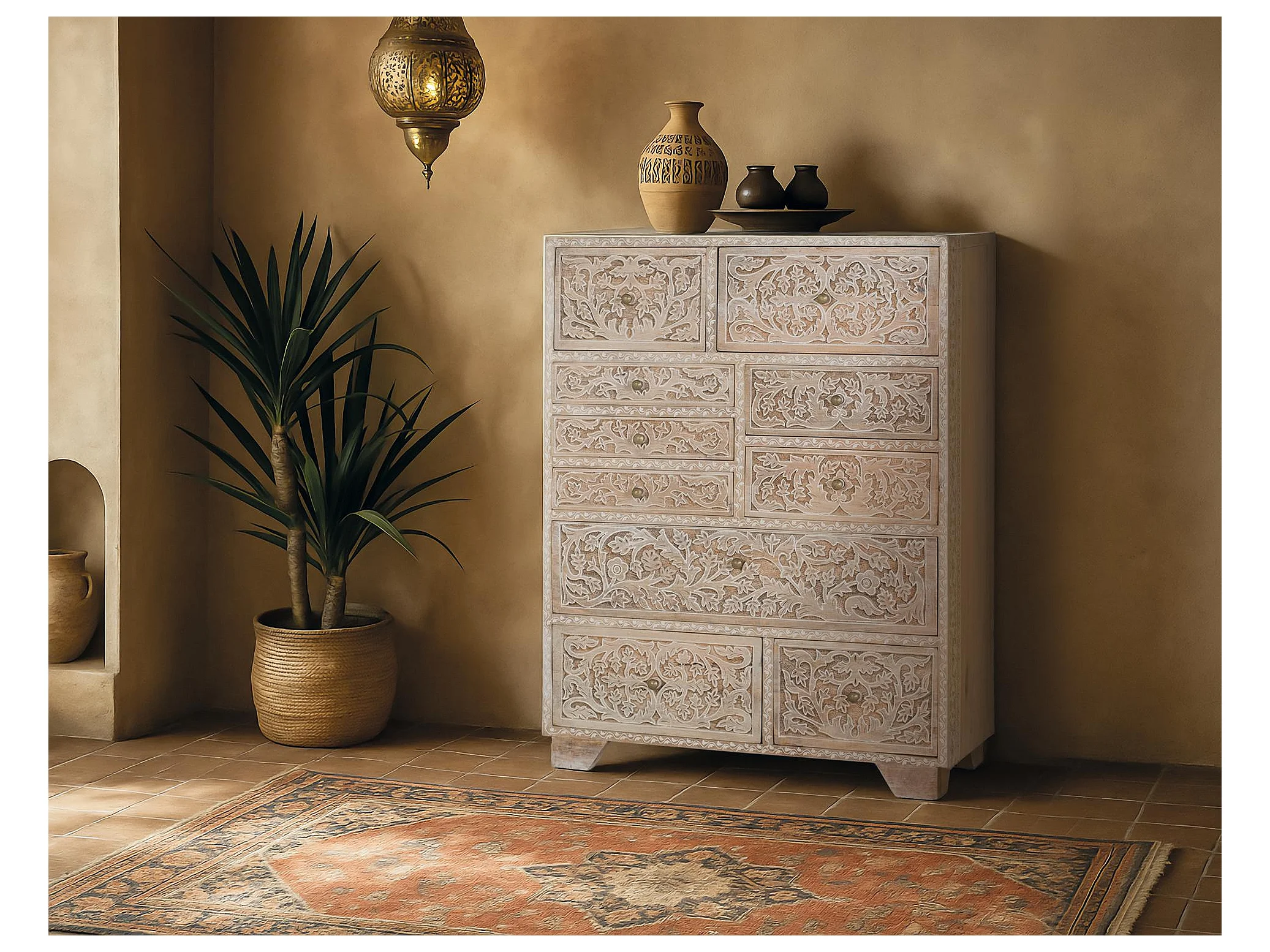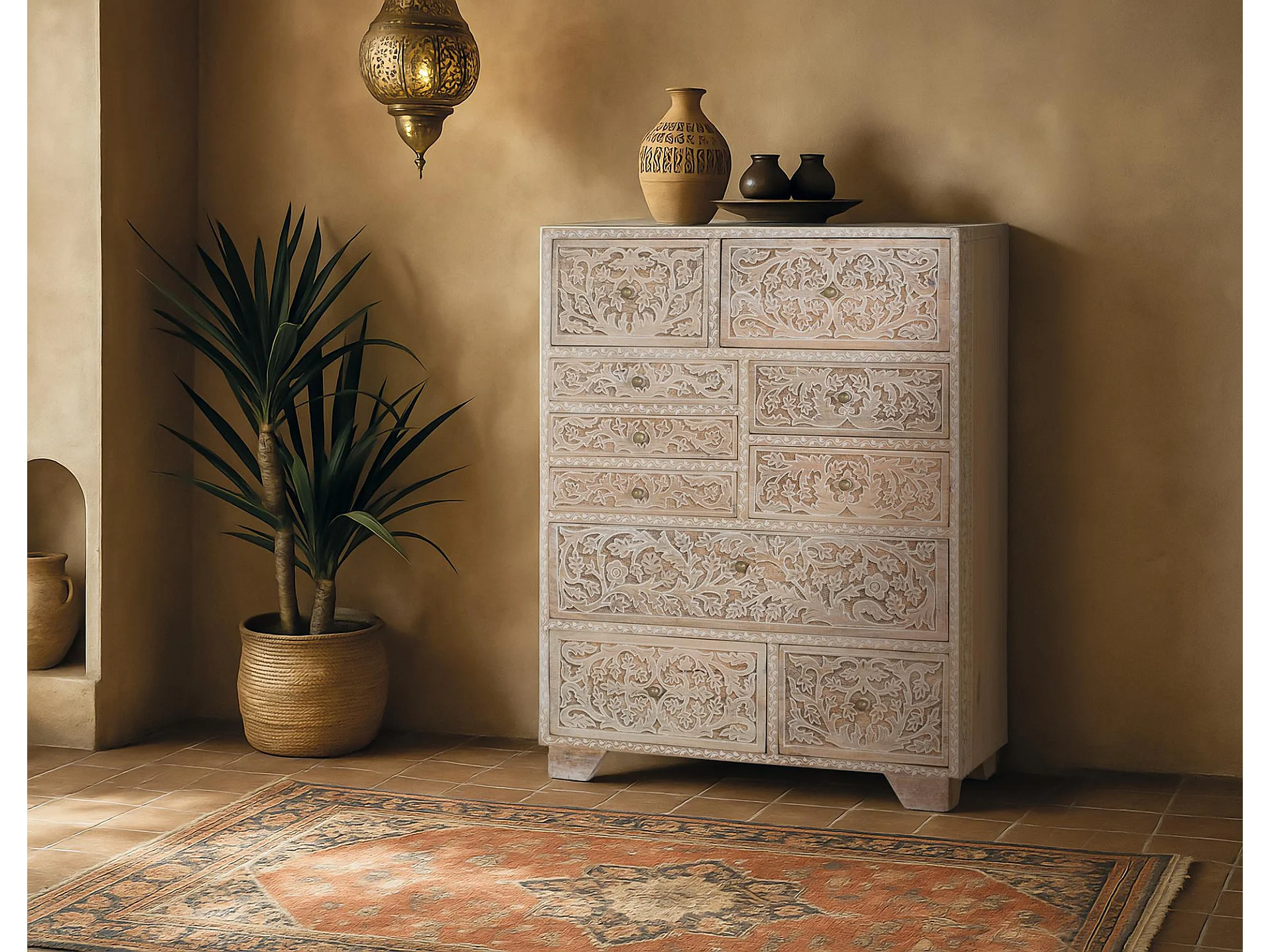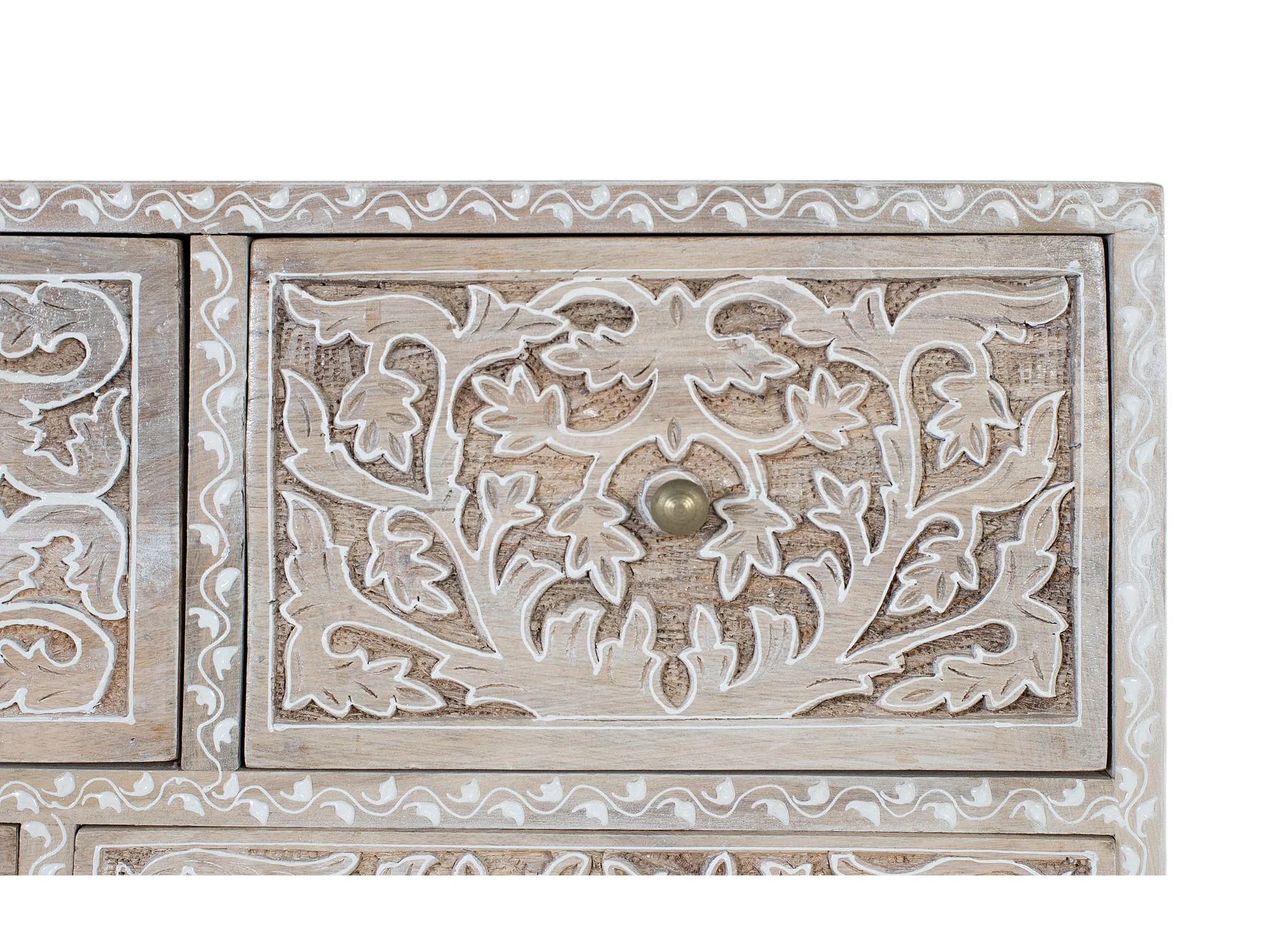 Handgeschnitzte Kommode aus Mangoholz mit zehn Schubladen