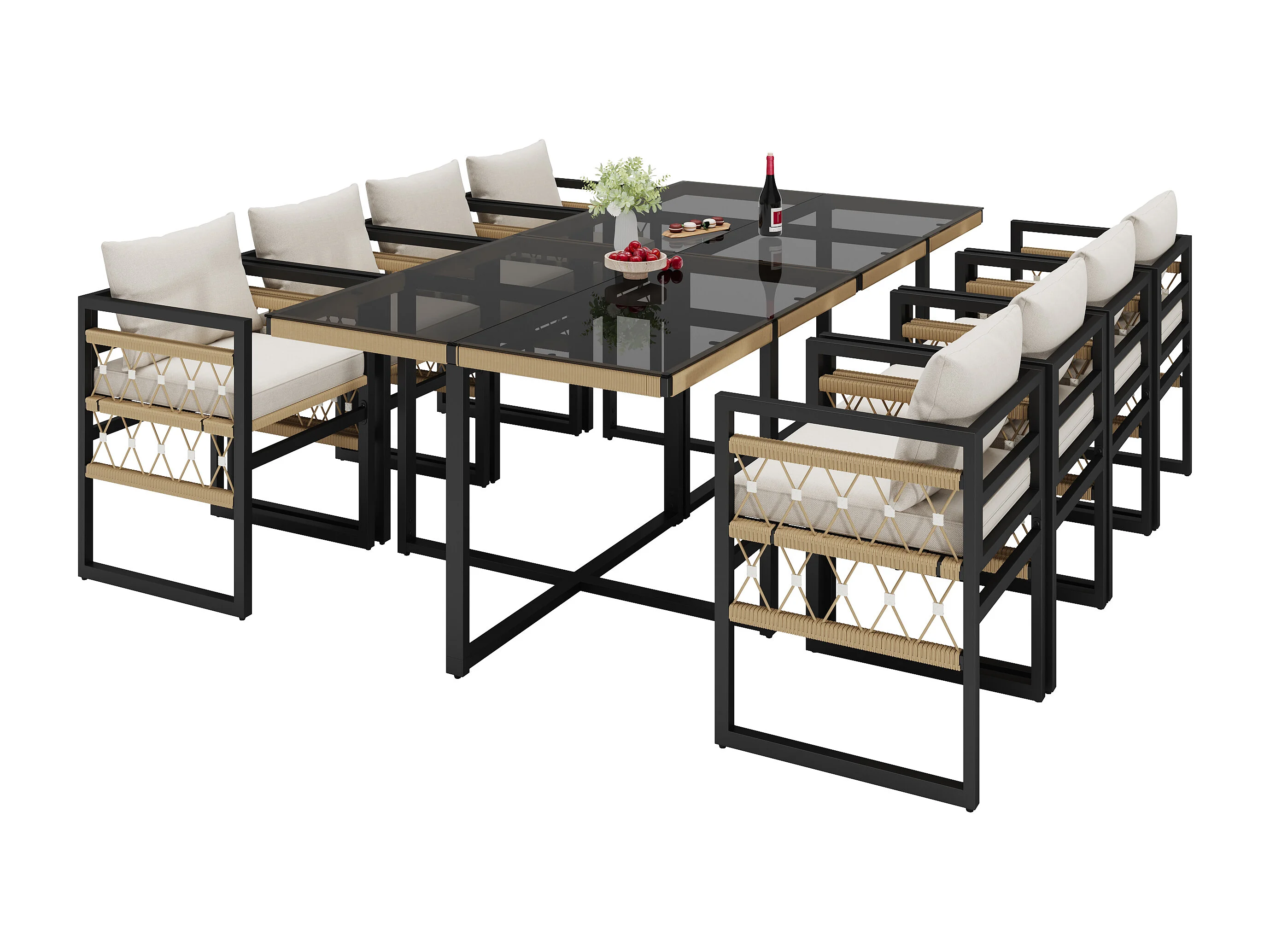 Handgewebte 8-Sitzer-Gartenmöbelgarnitur – mit 8 Kissen, 2 Tischen und 8 Sesseln – Metall – beige und schwarz
