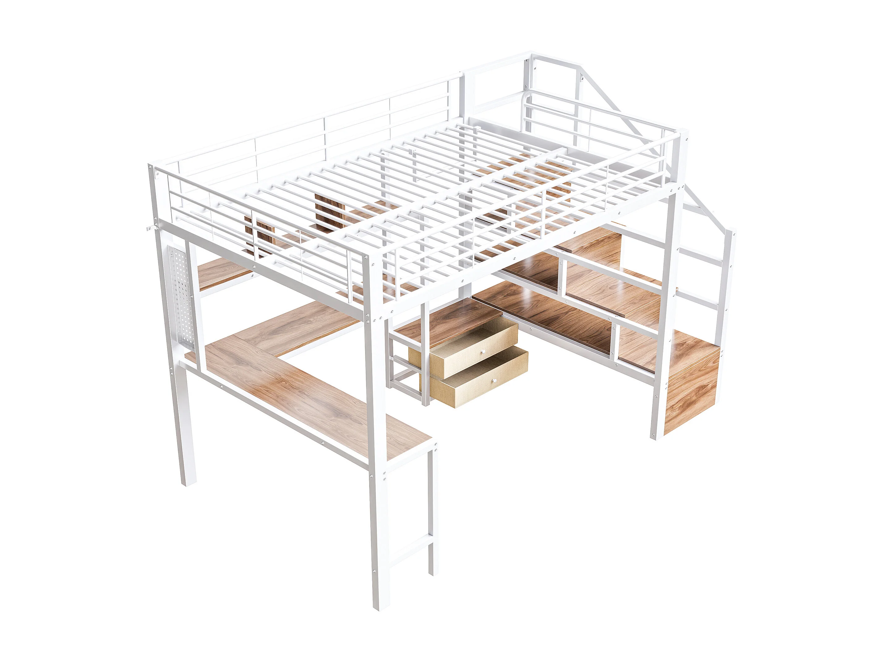 Hochbett 140x200 cm - Eisen-Gestell - 2 Schubladen - Kleiderstange - LED-Beleuchtung - Schreibtisch - weiß​ (Matratze nicht inbegriffen)