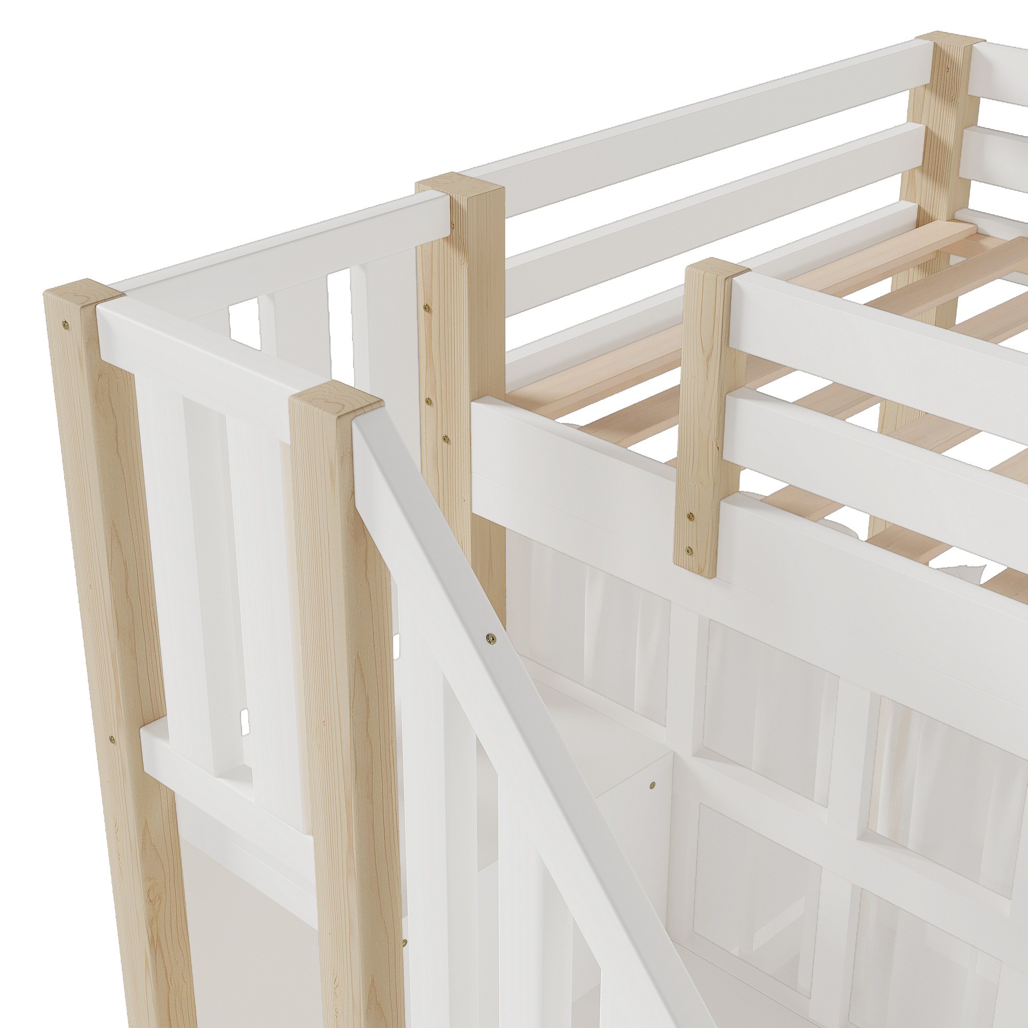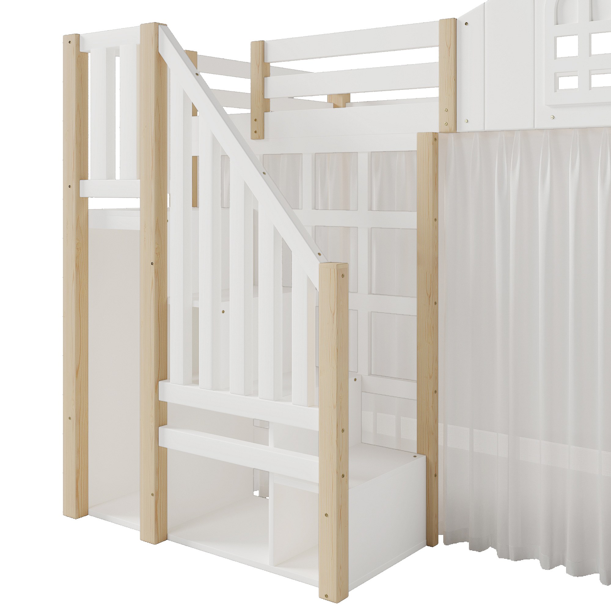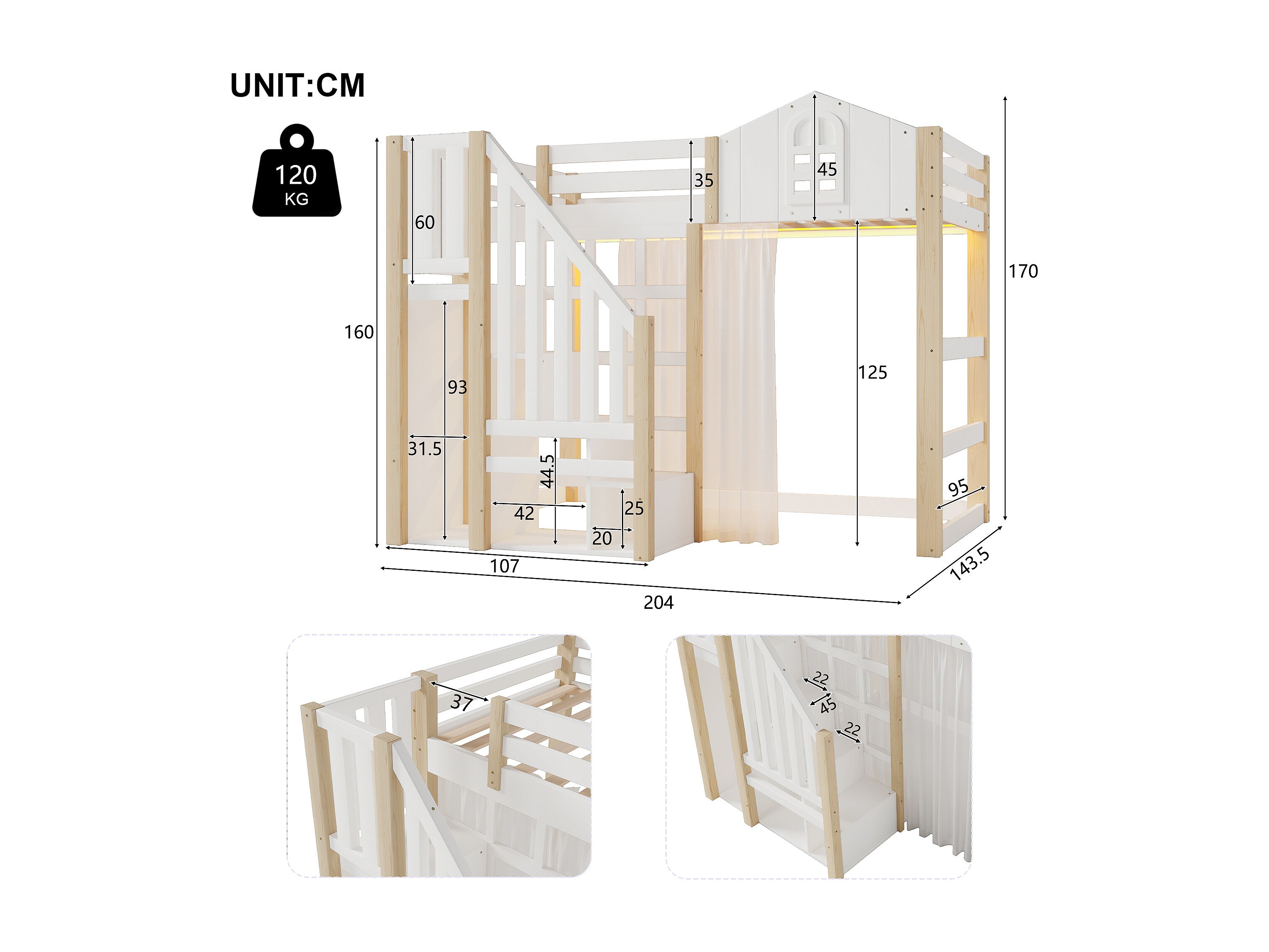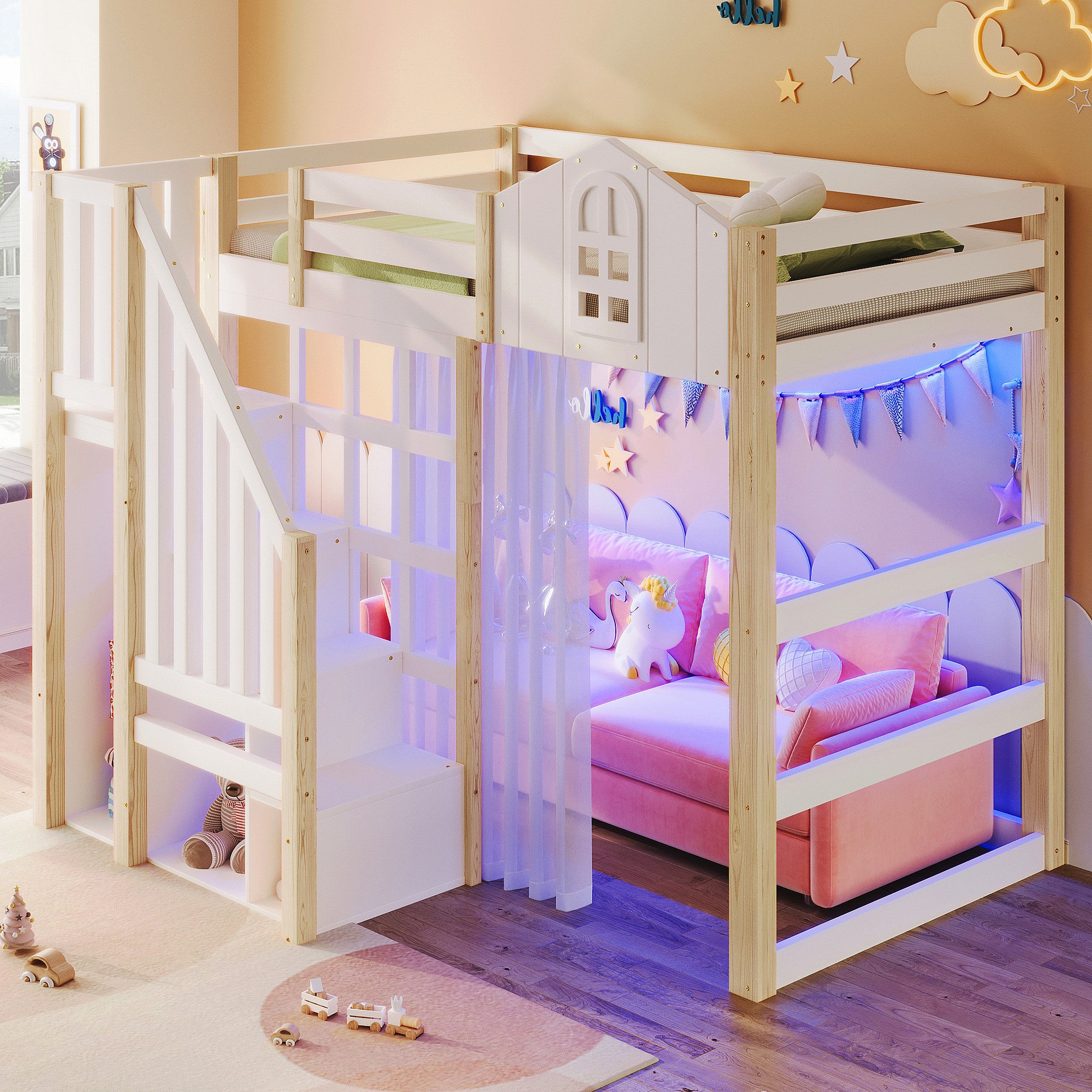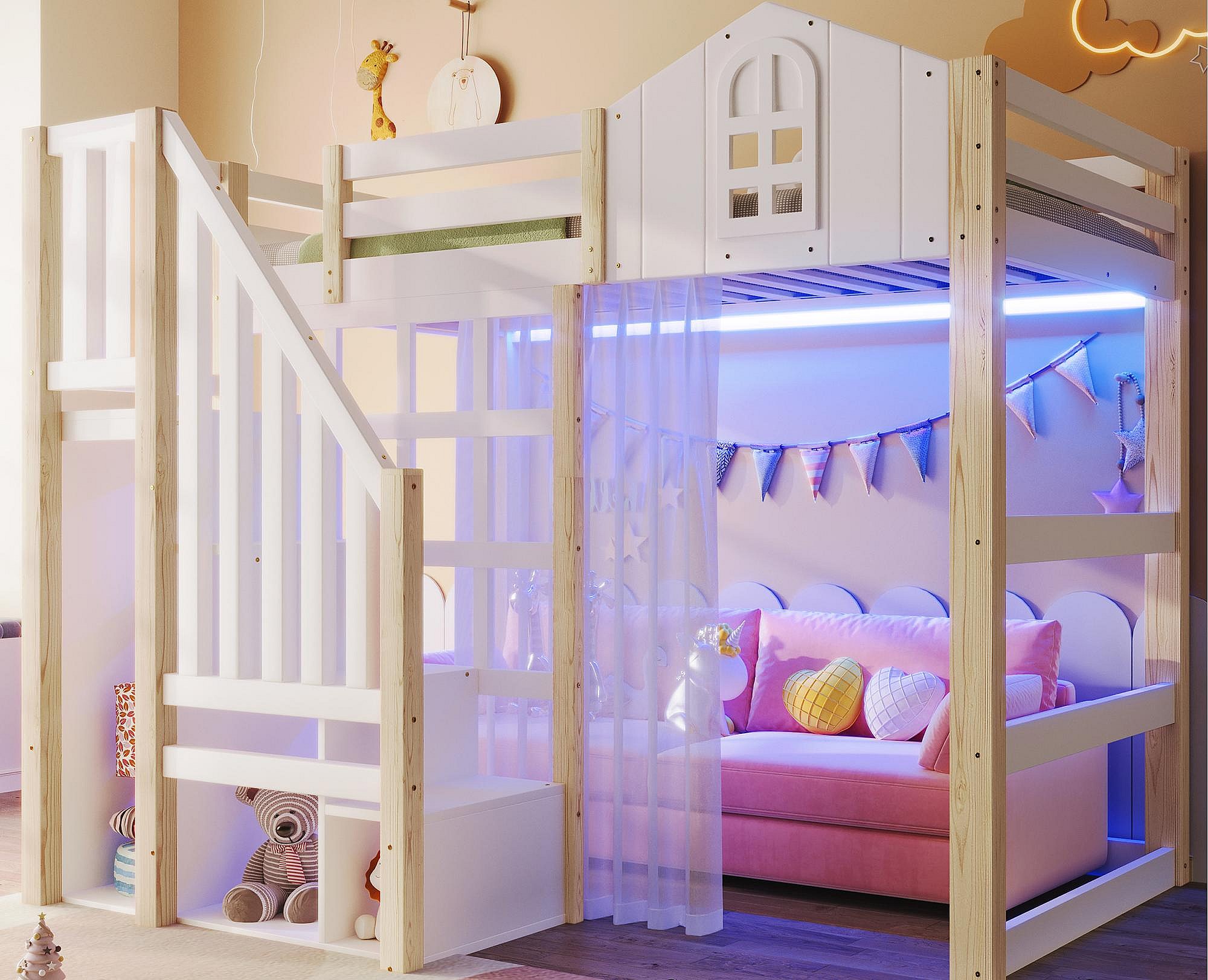 Hochbett 140x200 cm - mit LED-Beleuchtung - mit Aufstiegsleiter - mit Staufächern - Weiß + Natur