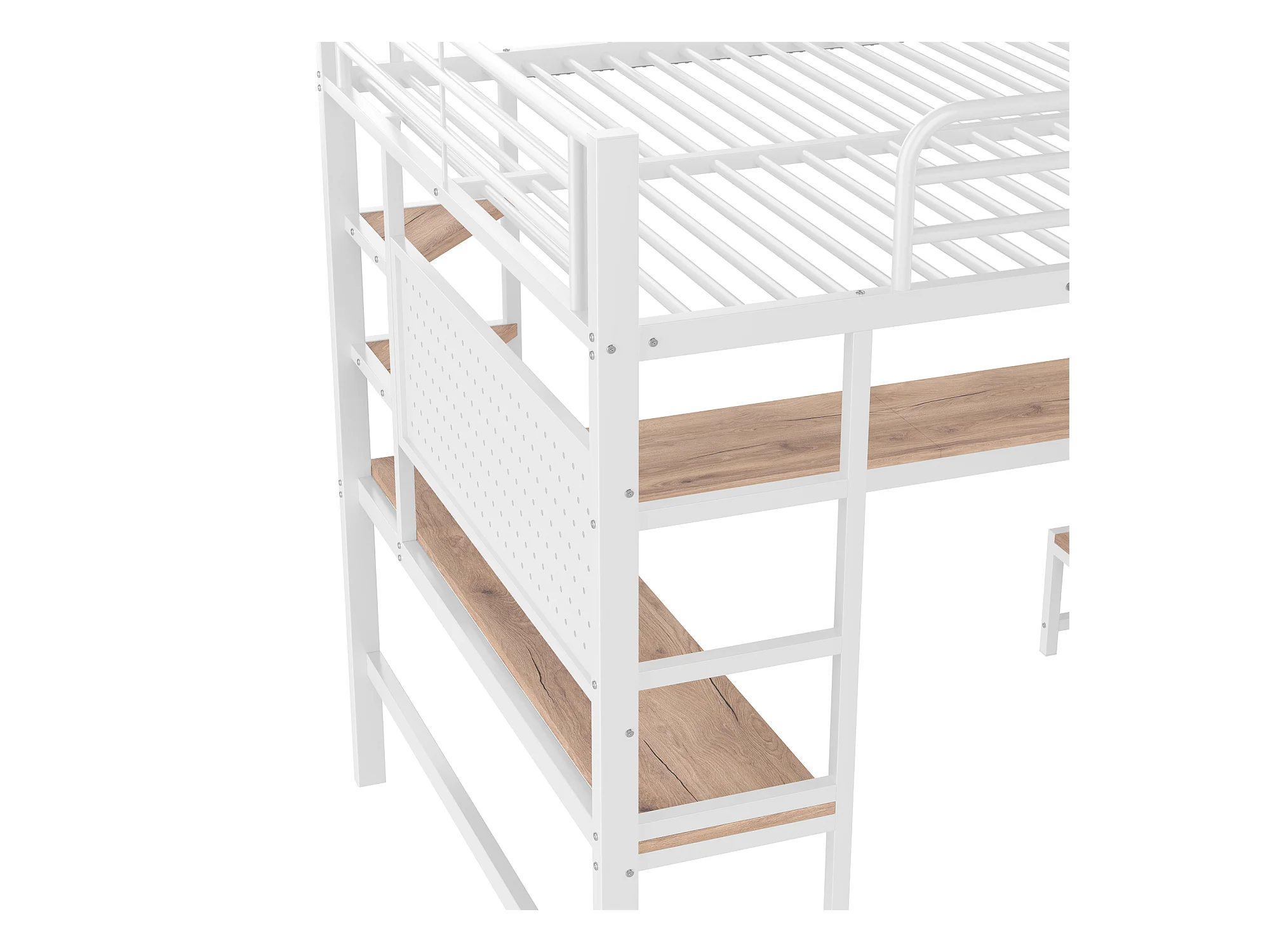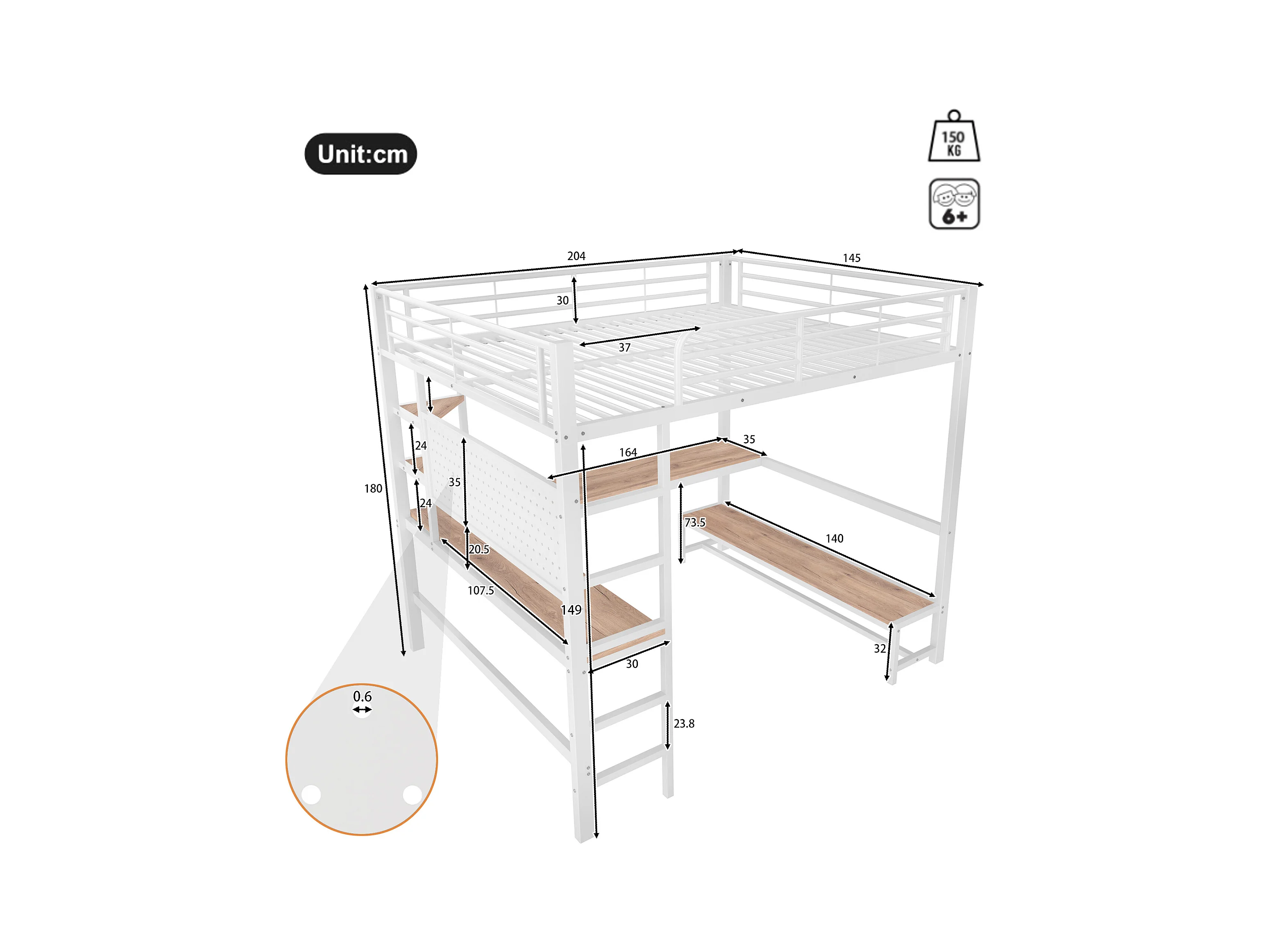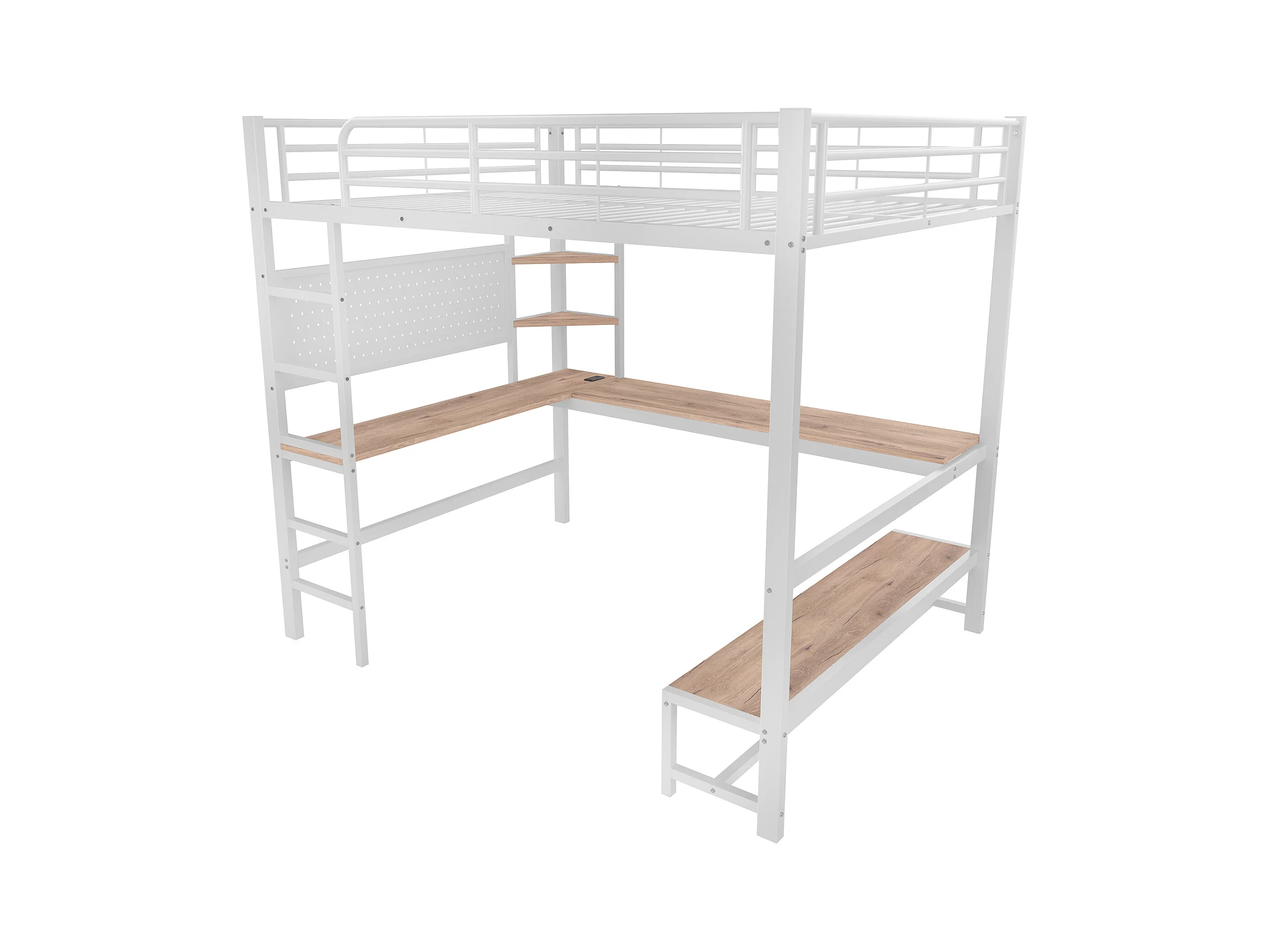 Hochbett 140x200cm - mit Schreibtisch + Schutzgitter - mit USB- + Typ-C-Anschlüssen - mit LED-Leiste - weiß