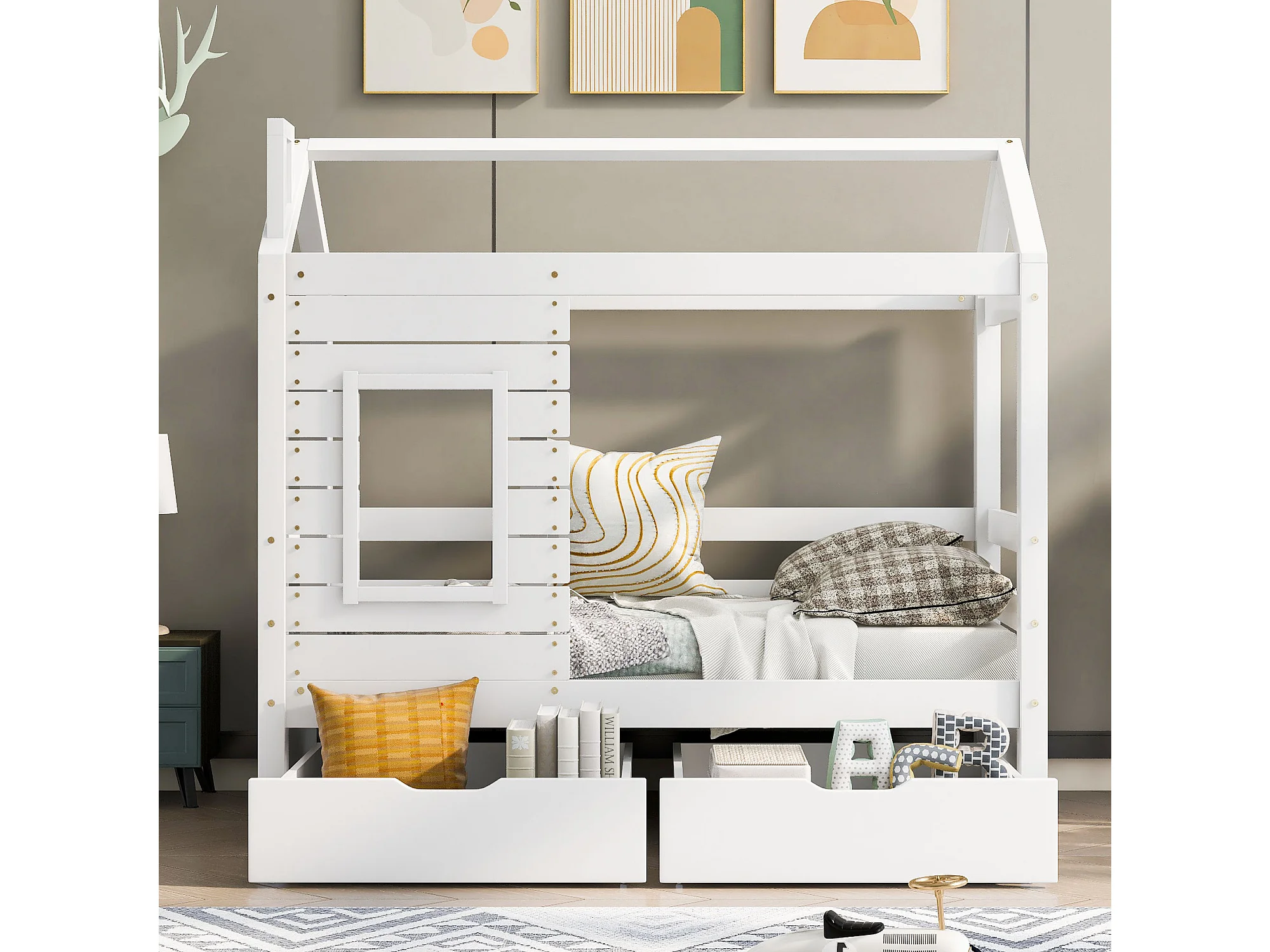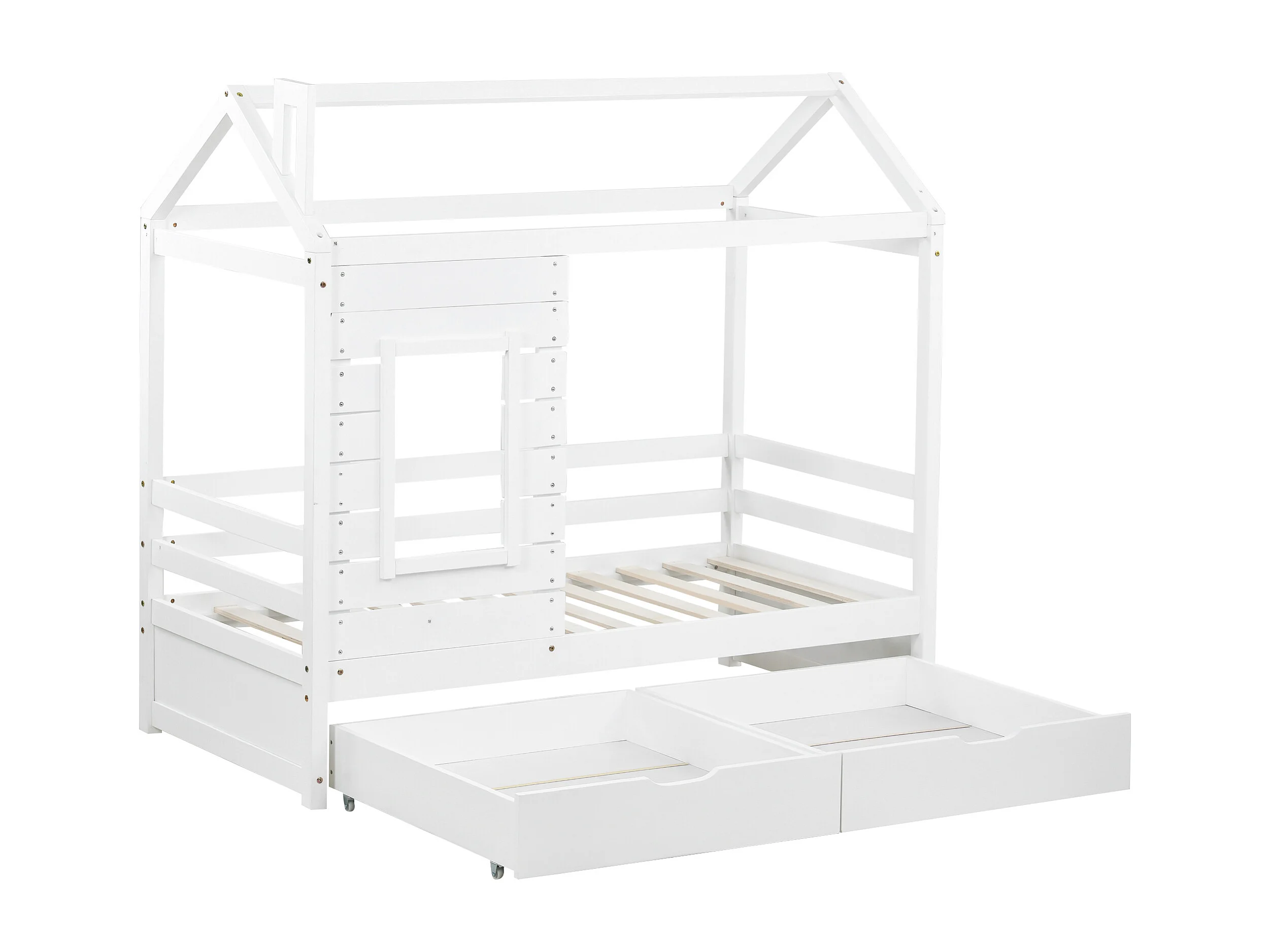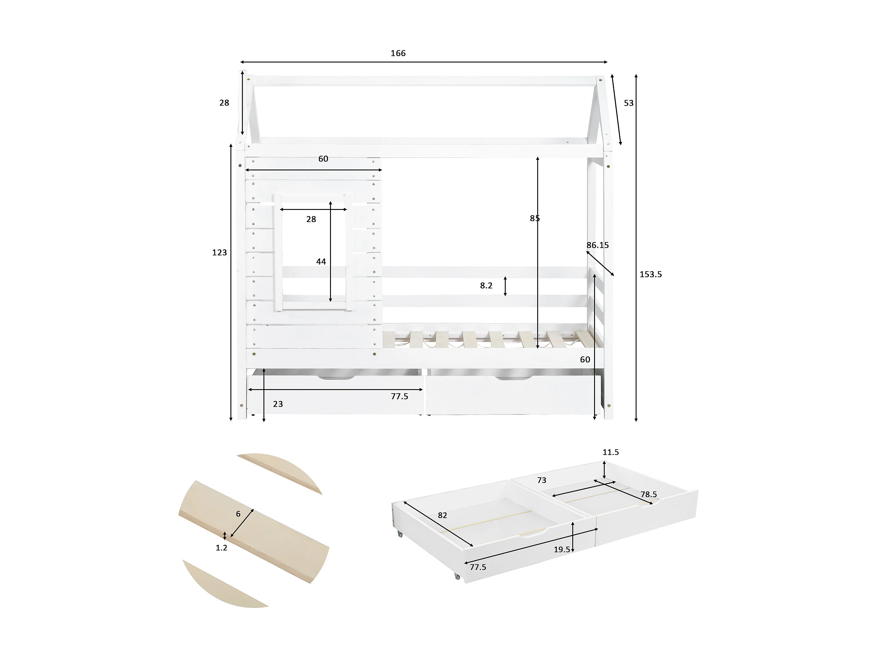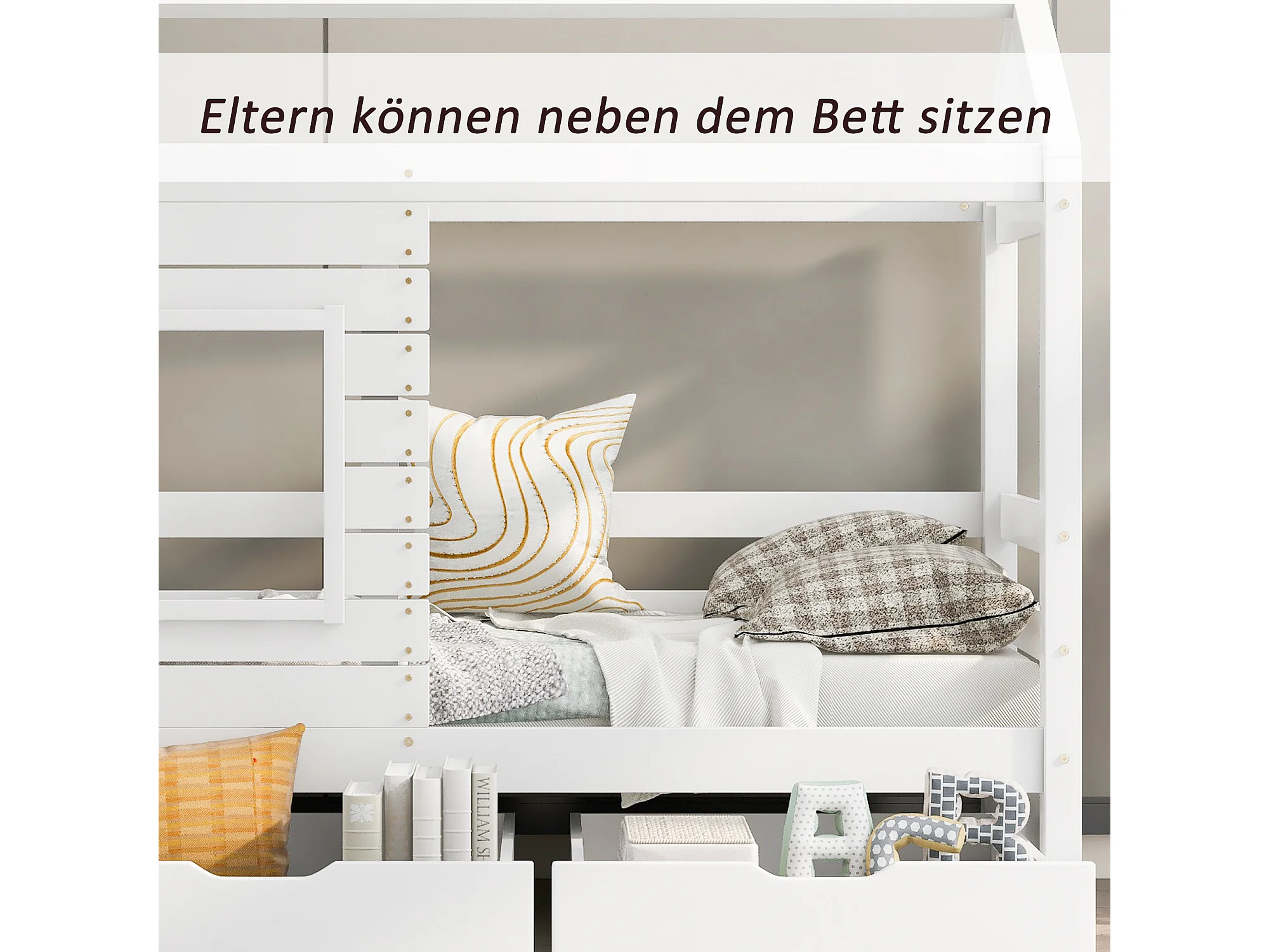 Hochbett 80 x 160 cm mit 2 Schubladen – massives Kiefernholz – Lattenrost und Schienen – weiß