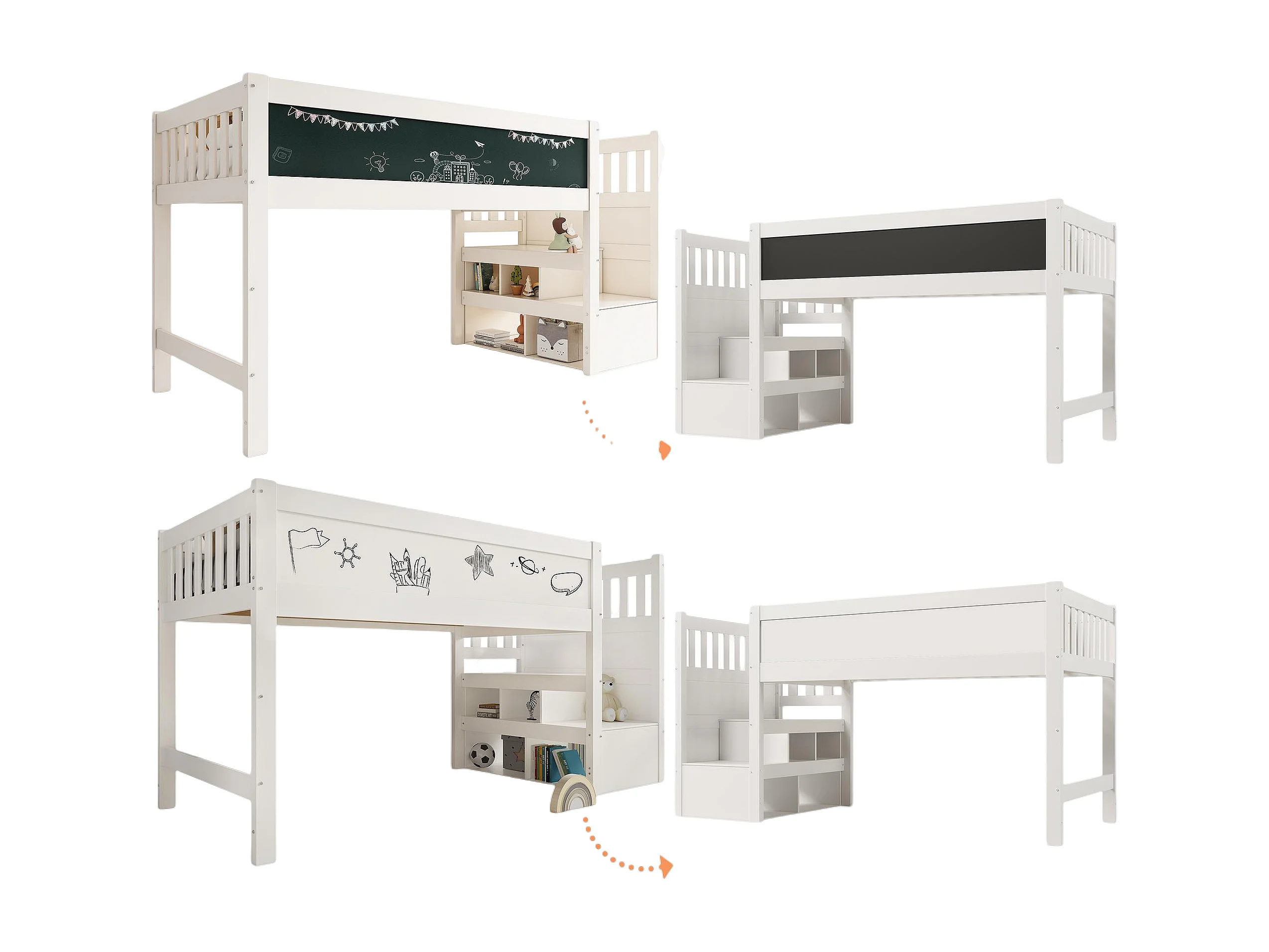 Hochbett 90 x 200 cm – Kinderbett mit Stauraumtreppe und Malbrett – Schutzgitter – weiß – ohne Matratze