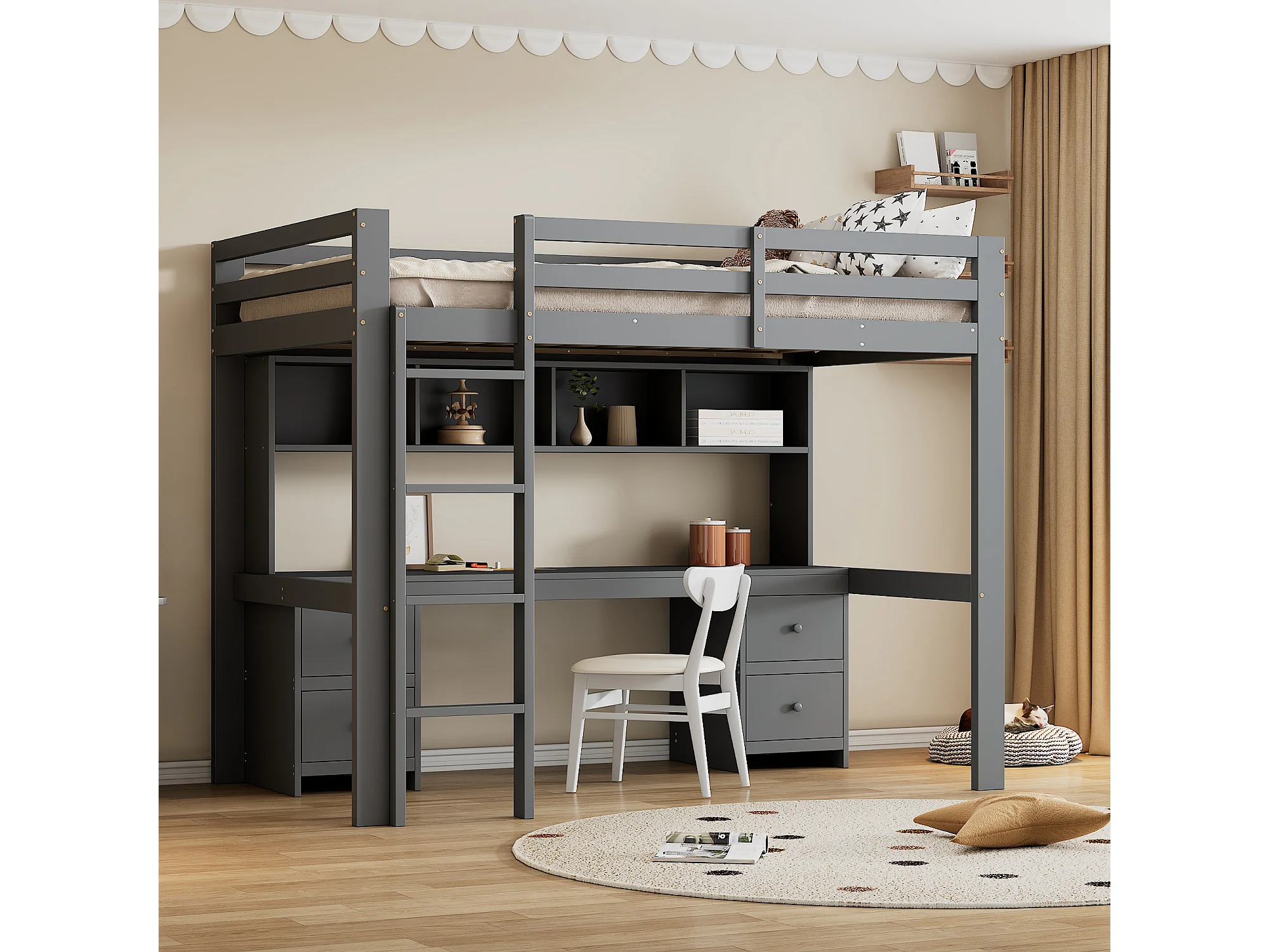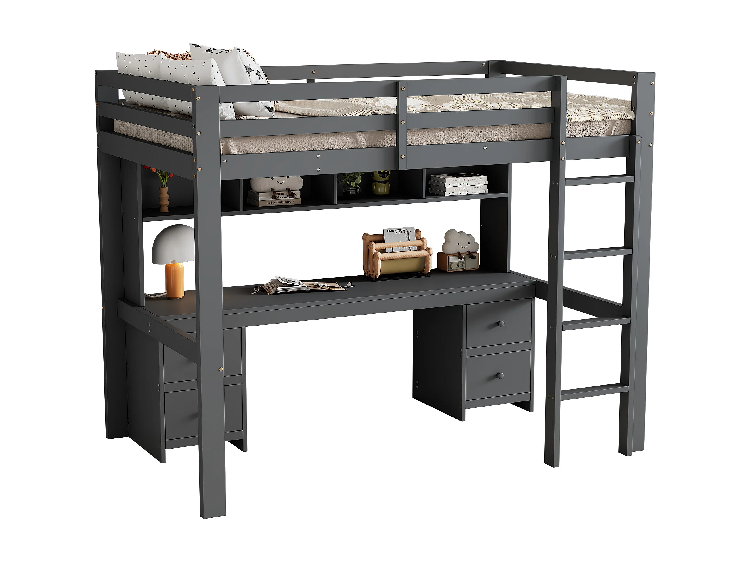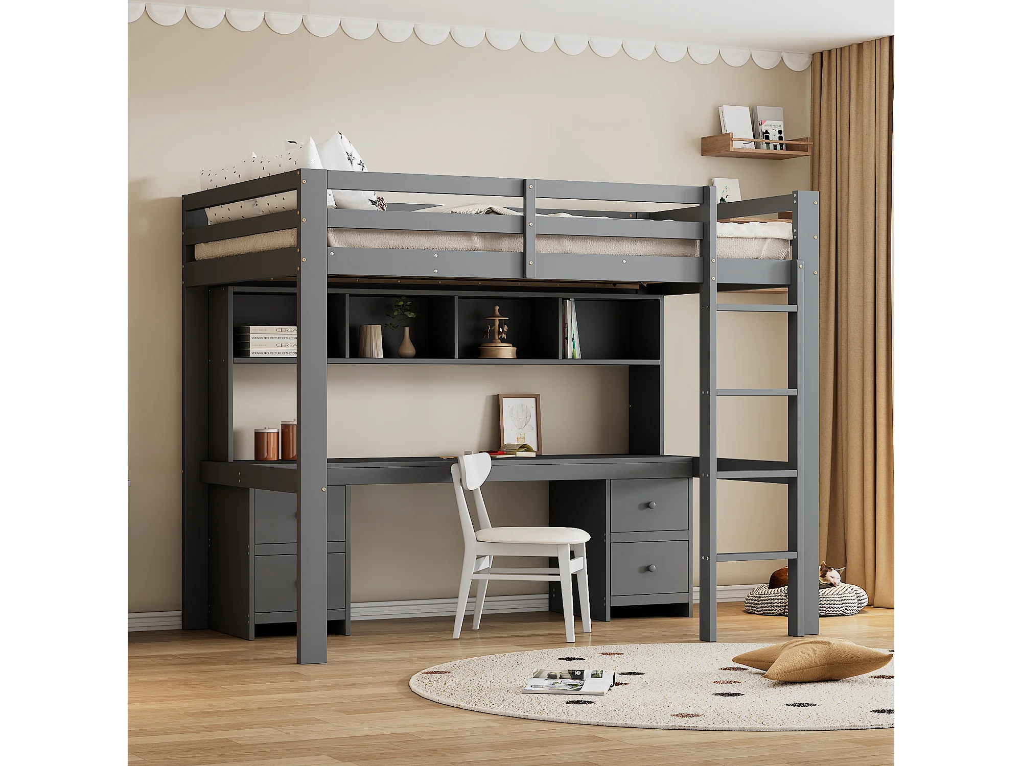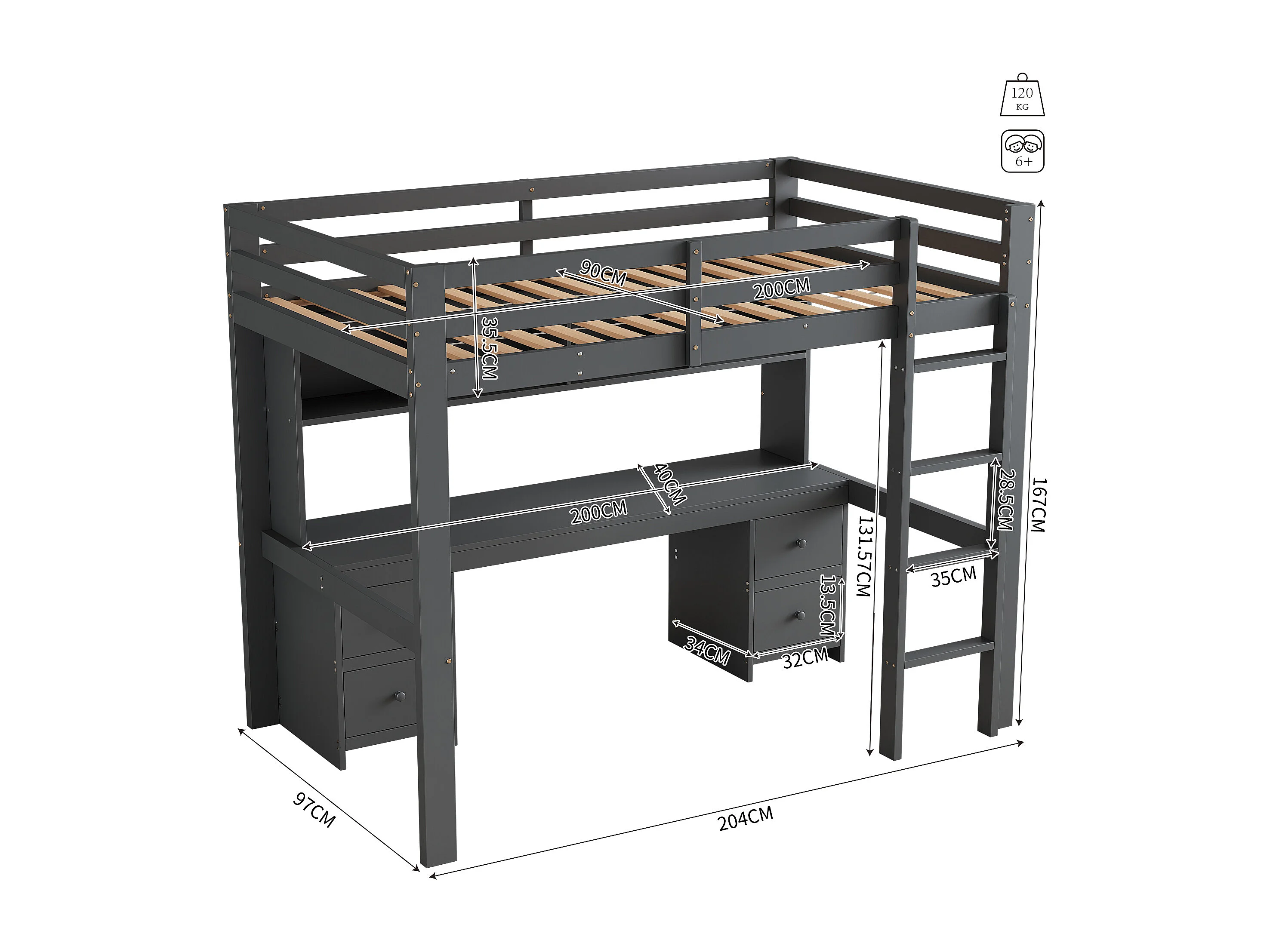 Hochbett 90 x 200 cm mit Schreibtisch, Bücherregal, Schubladen und Leiter, MDF-Holz, Grau