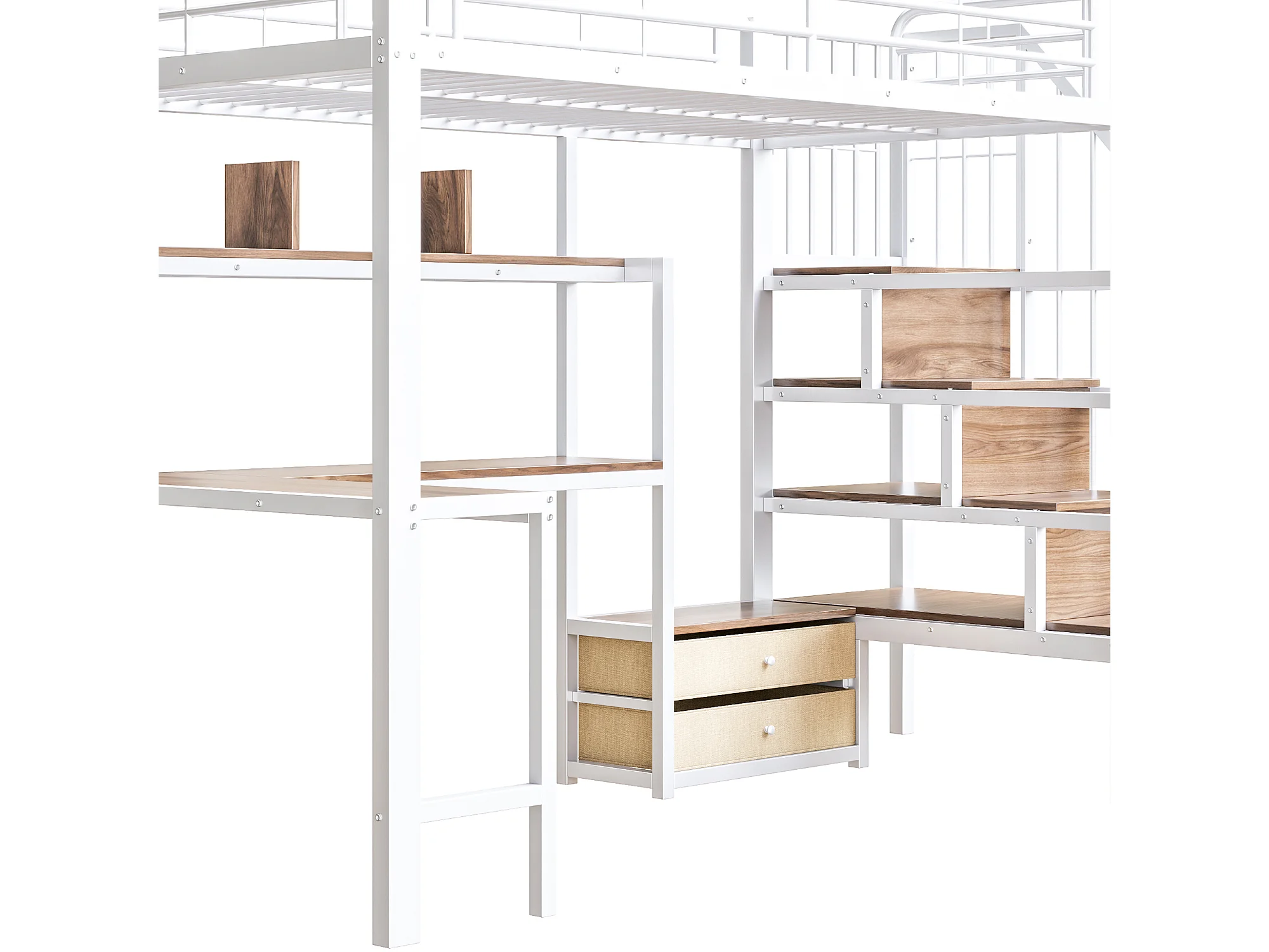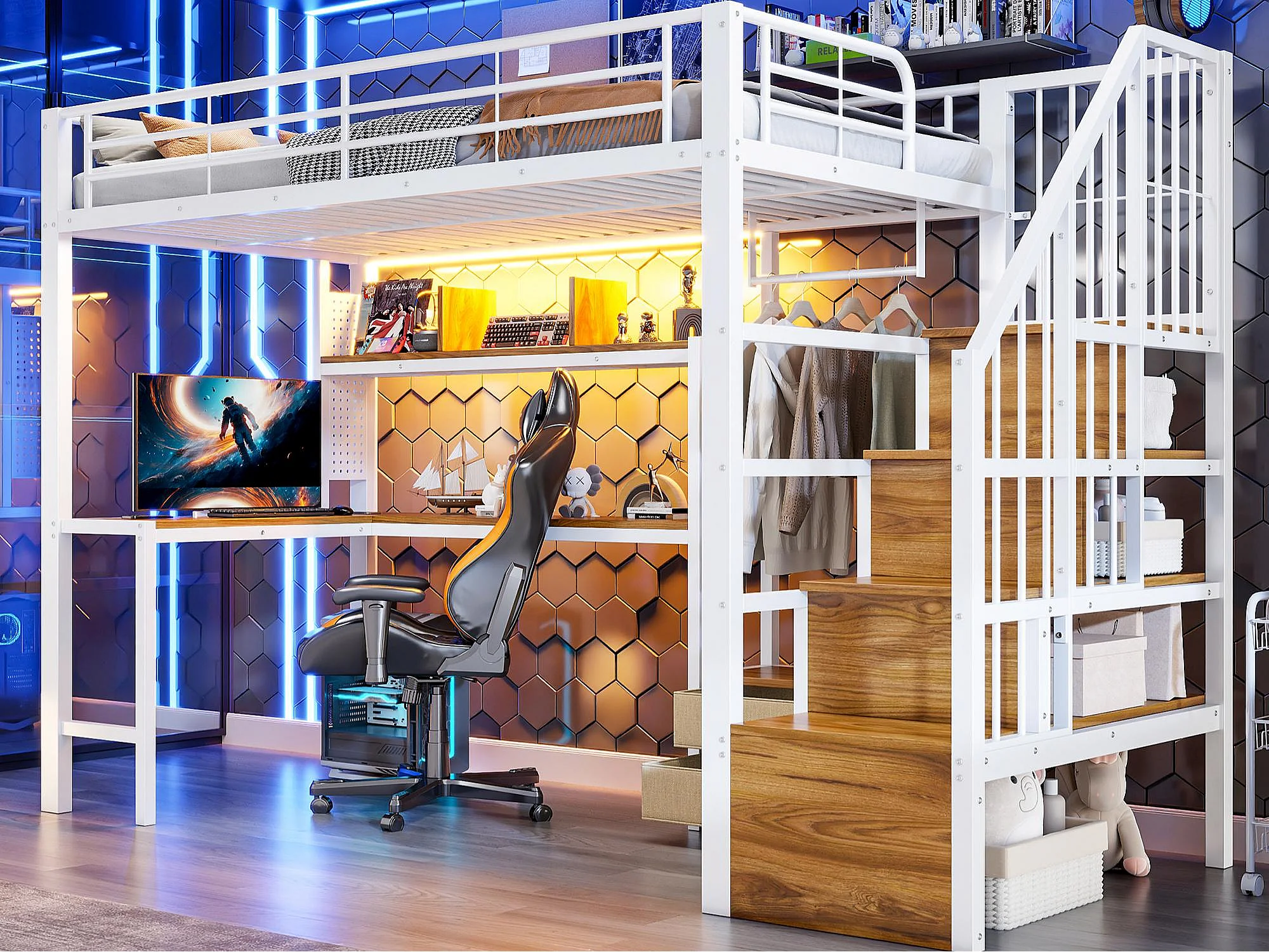 Hochbett 90x200 cm - Eisen-Gestell - 2 Schubladen - Kleiderstange - LED-Beleuchtung - Schreibtisch - weiß​ (Matratze nicht inbegriffen)