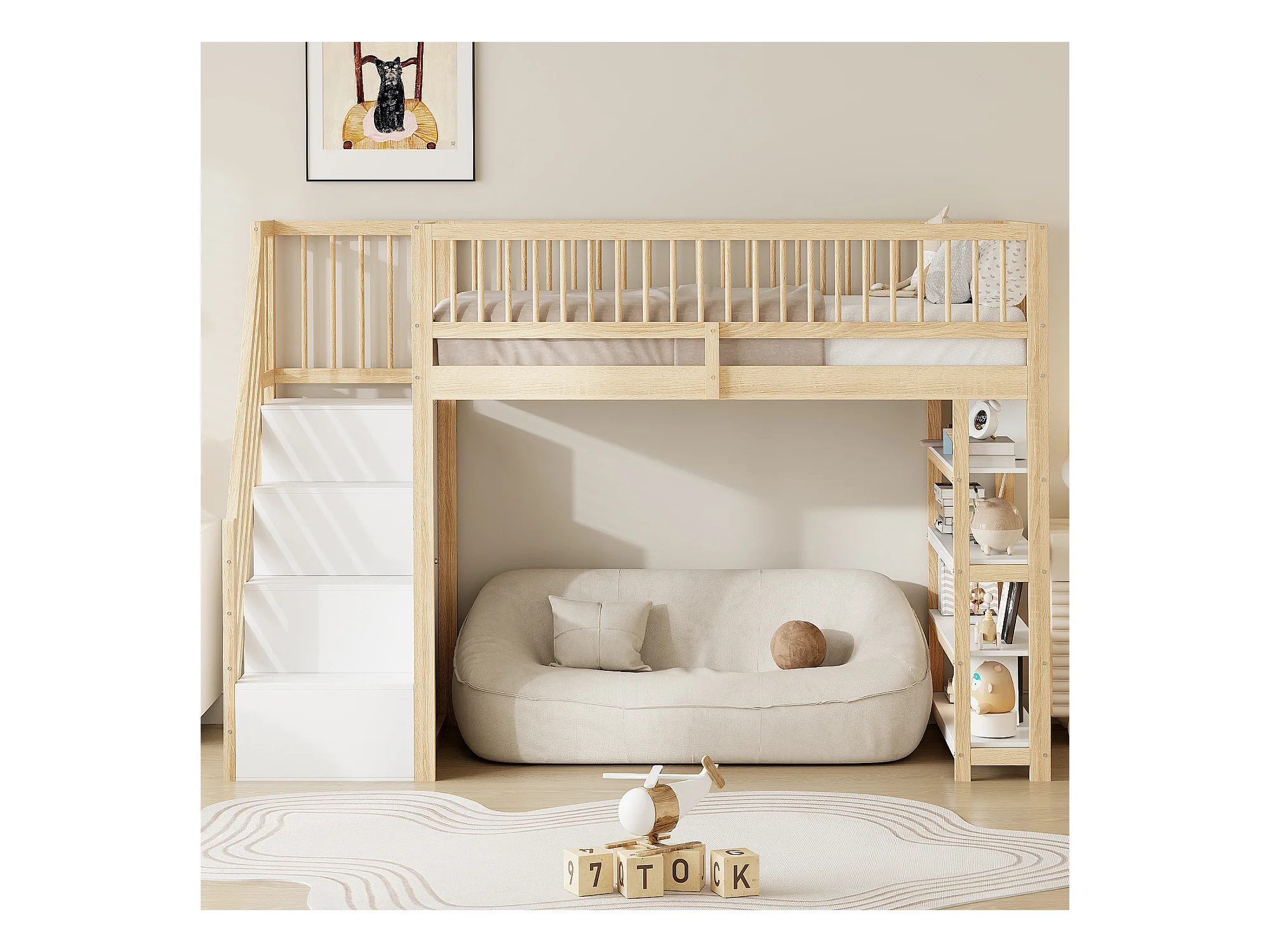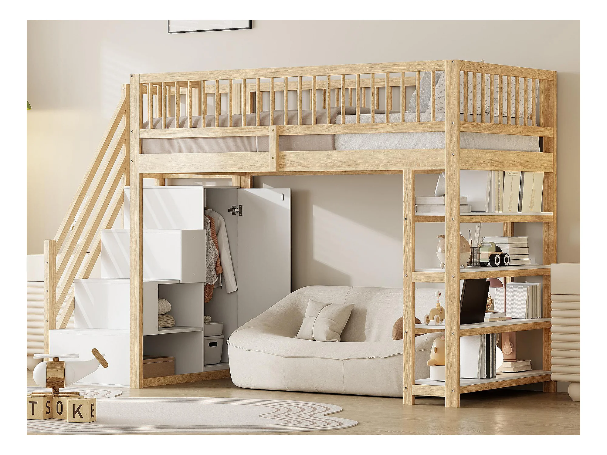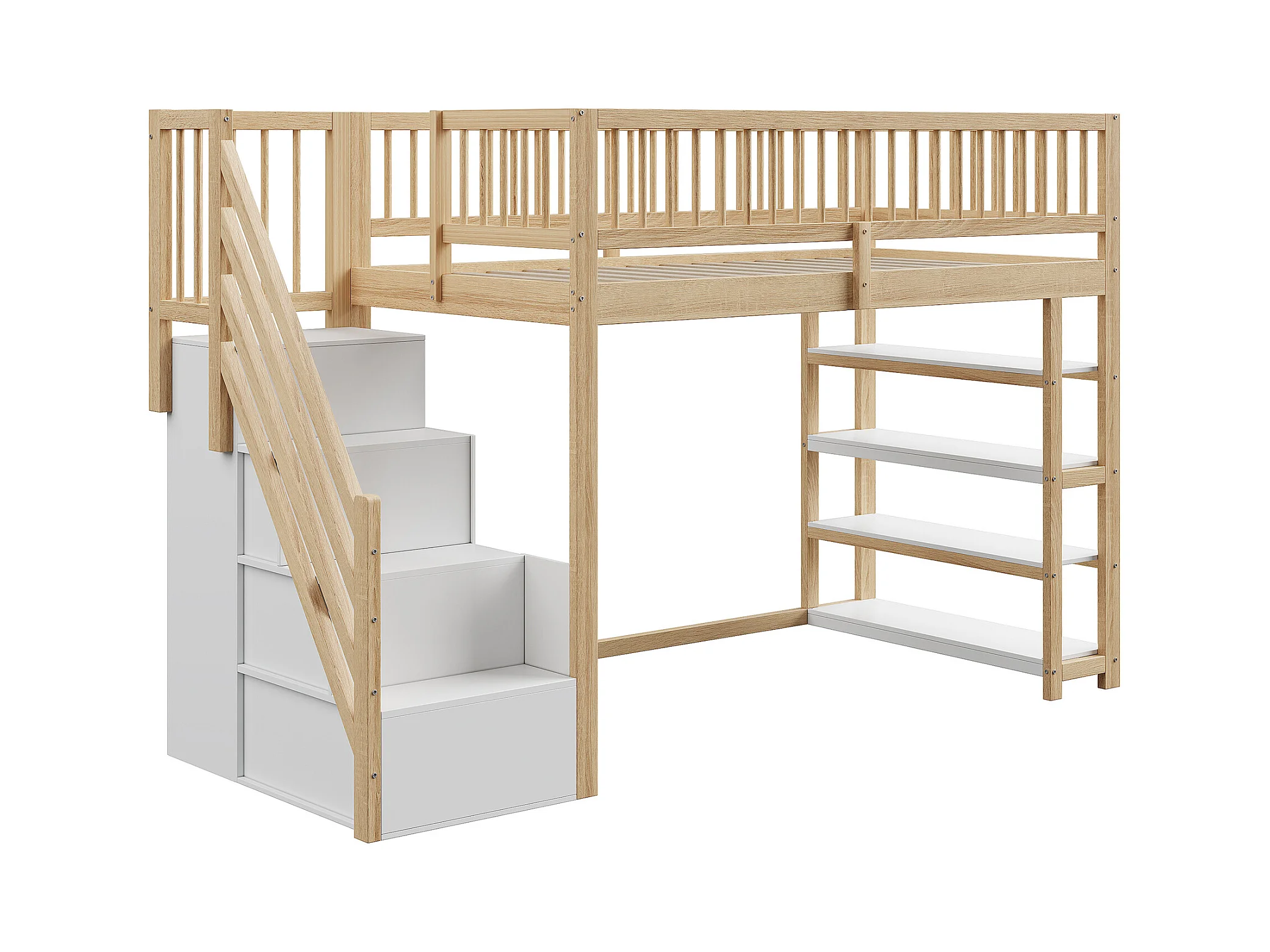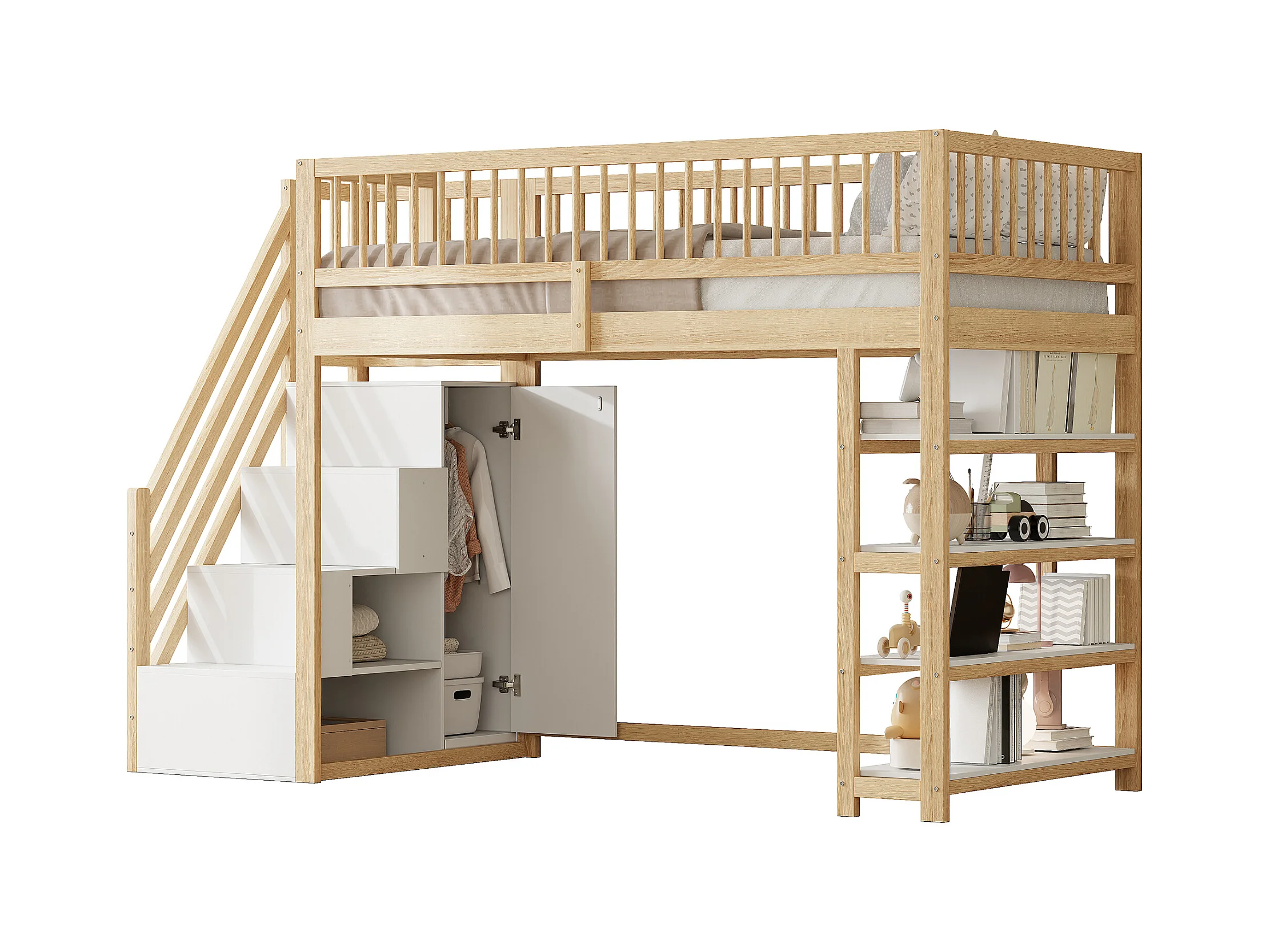 Hochbett 90x200 cm – mit Regalen und Aufbewahrungsleiter – Massivholz – Natur